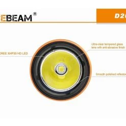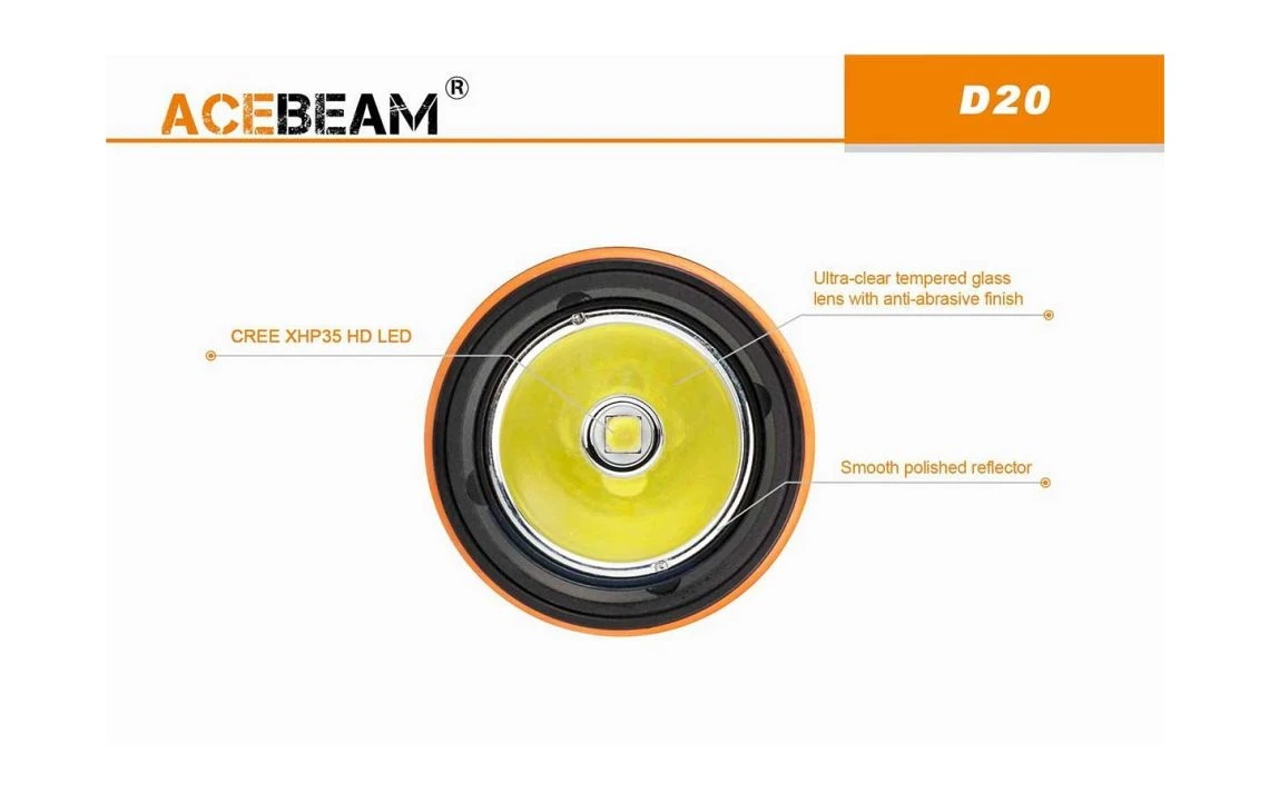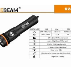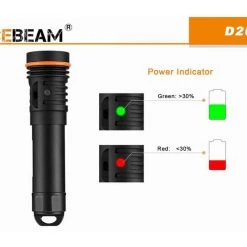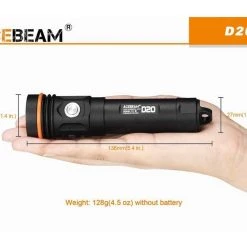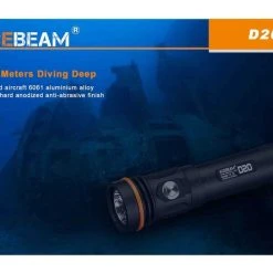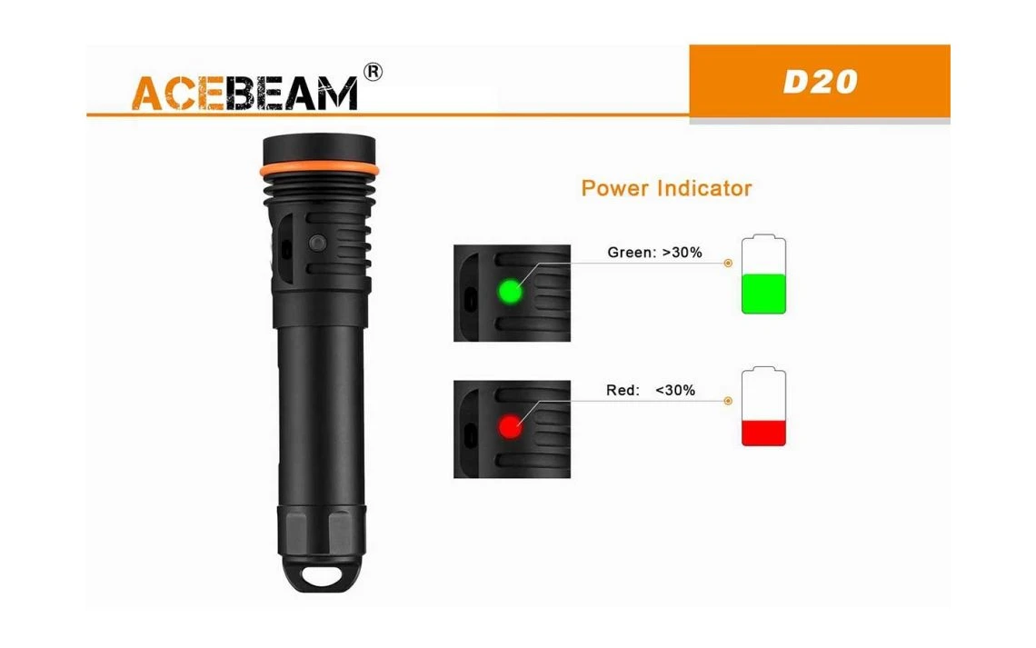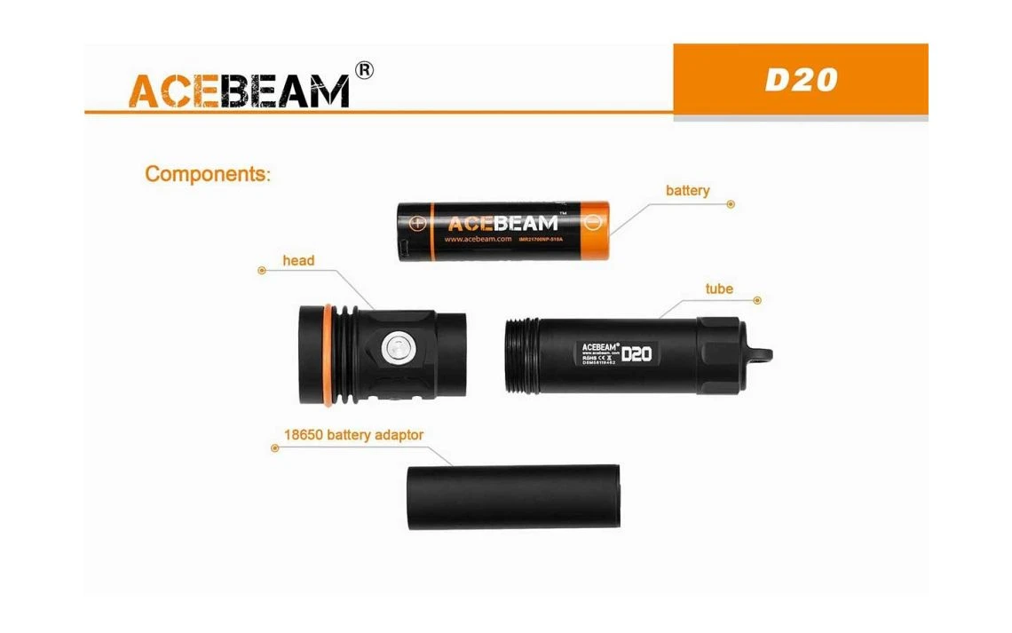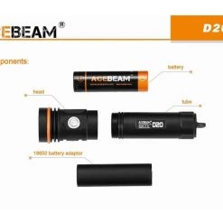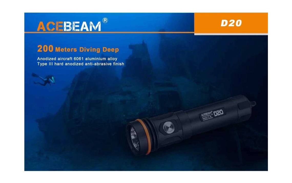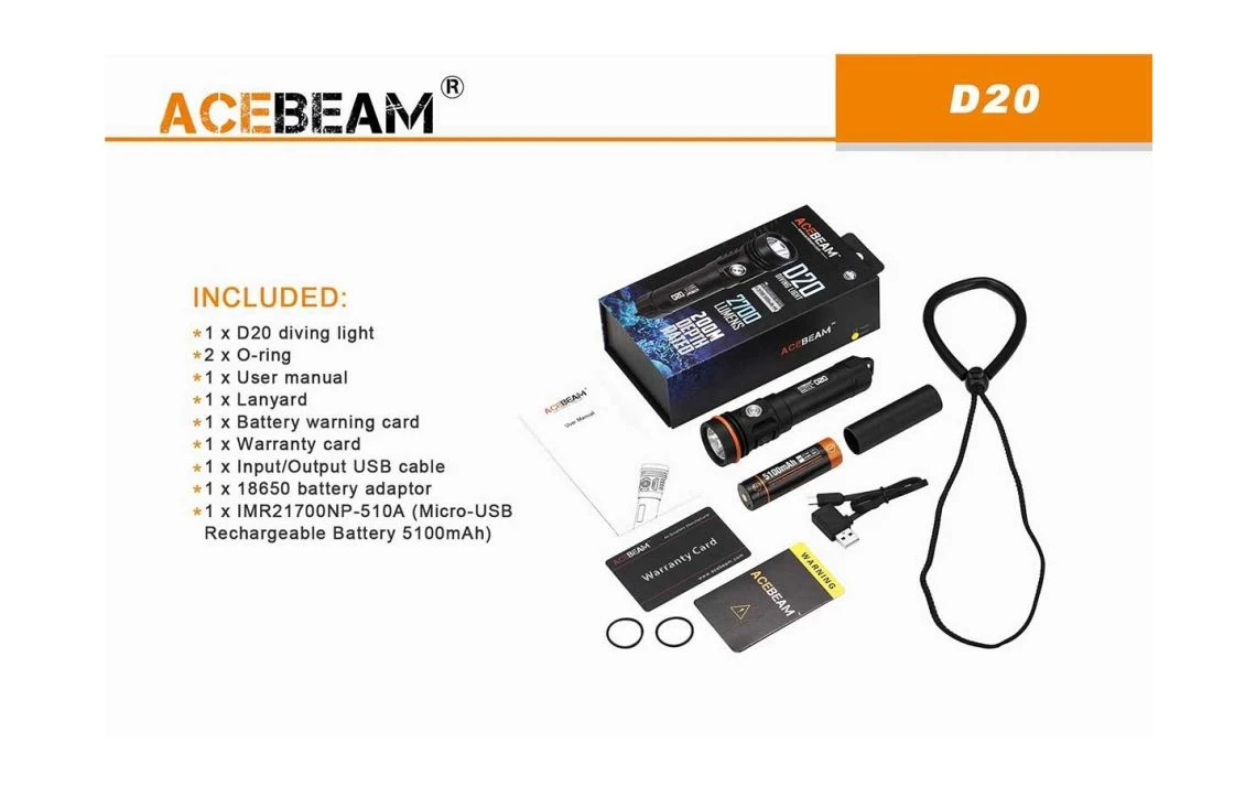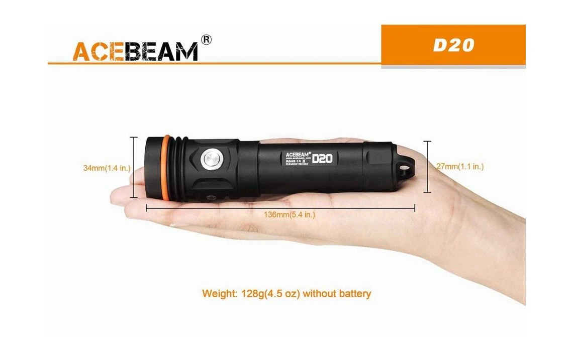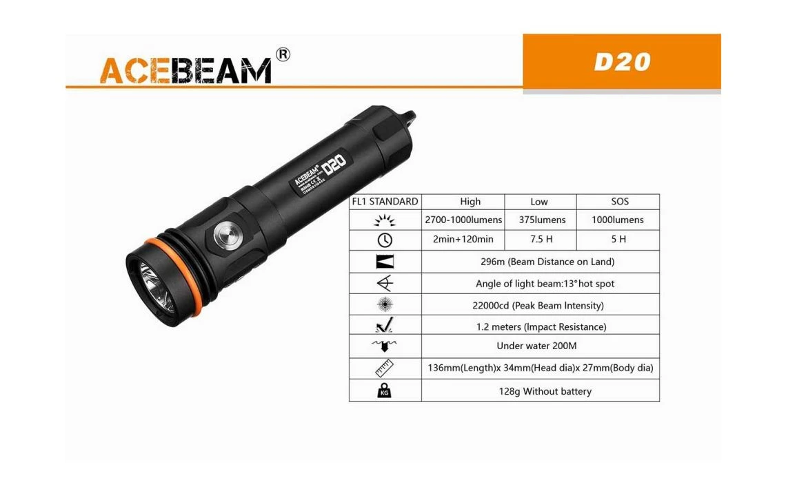 128g, 2700 lumens. The AceBeam D20 brings a powerful 2700 Lumen burst along with compact portability to your deep diving gear. Capable of being submerged up to 200 Meters, the Acebeam D20 is the perfect light to take on deep diving expeditions or in any situation where you need an underwater flashlight. The D20 is powered by an included Li-ion 21700 battery, but can also be powered by a single 18650 battery. Micro-USB rechargeable!