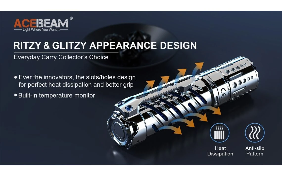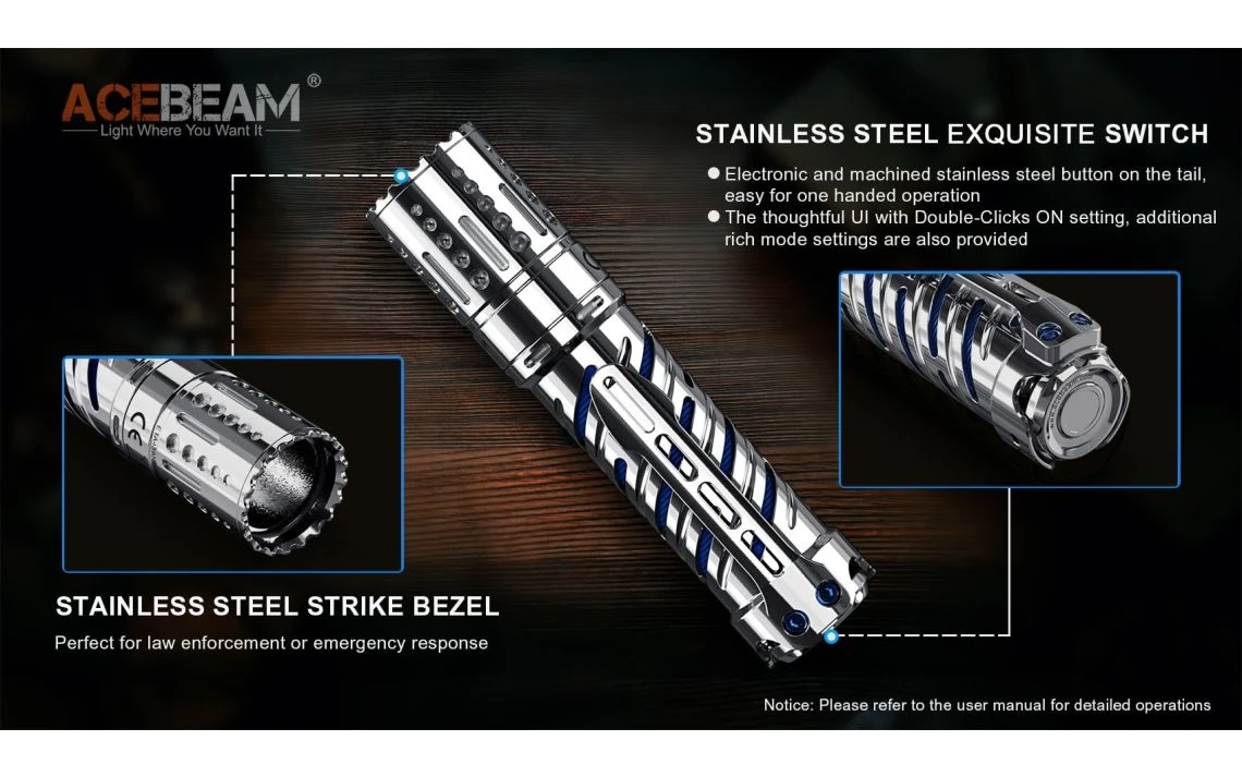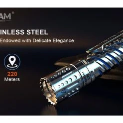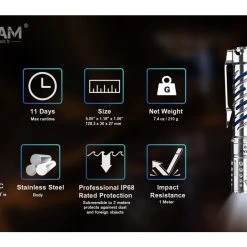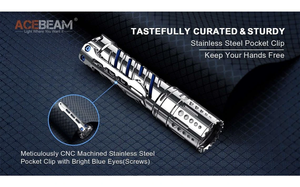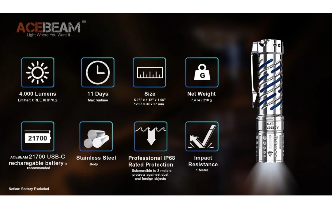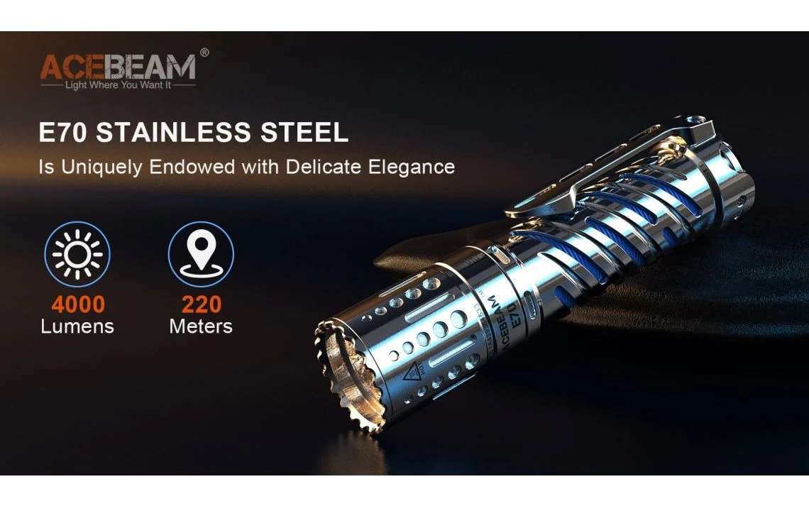 294.5g, 4,000 Lumens: The AceBeam E70-SS is a compact EDC torch with a unique stainless steel design and a powerful output. It uses one CREE XHP70.2 LED to produce a max output of 4,000 lumens and a 220m beam distance. The E70 has 6 brightness levels and a strobe mode to give you the right amount of light for a variety of situations. The E70-SS runs off a 5100mAh 21700 battery which is directly rechargeable with the included USB-C cable. The all-in-one metal tail switch allows you to conveniently control the torch and the lockout mode prevents accidental activation. This torch is made from durable high-strength, oxidation resistant aero grade aluminium and is 1 metre impact resistant and waterproof to 2 metres submersible. With its compact size, high output and durable build quality, this is a great torch for camping, search and rescue, security, industrial and outdoor applications. Available with cool white, neutral white, or High CRI95+ LED tint (2500 lumens).