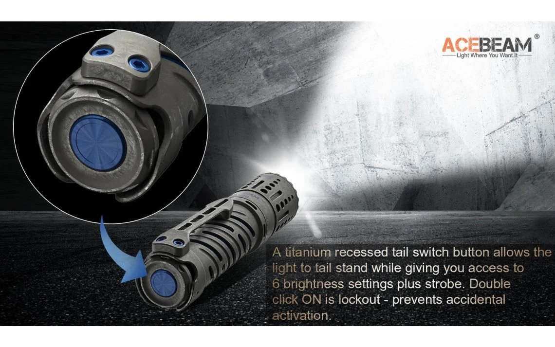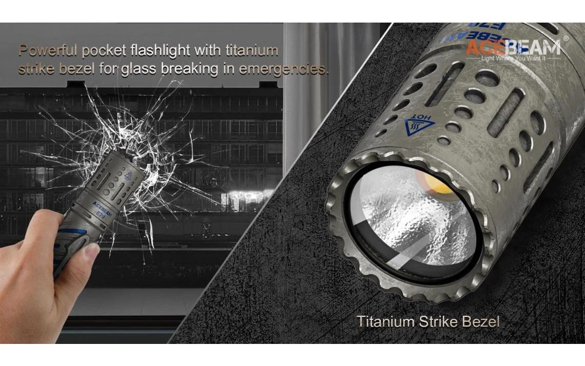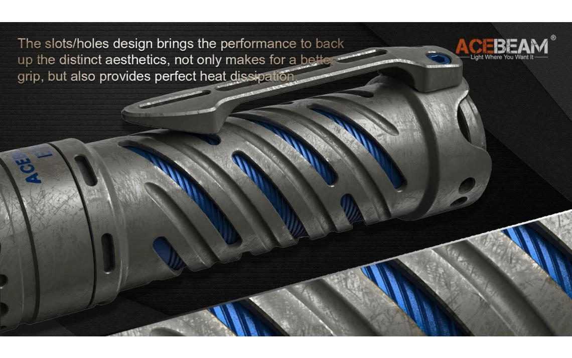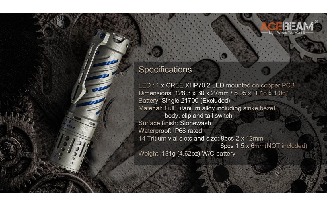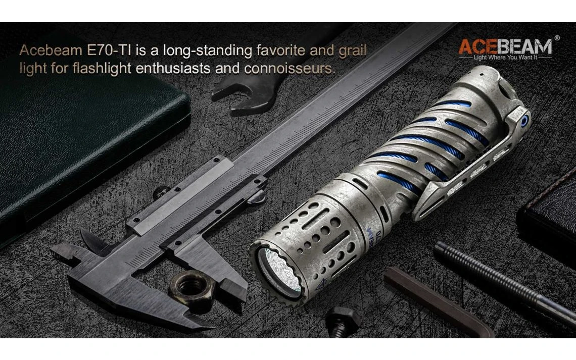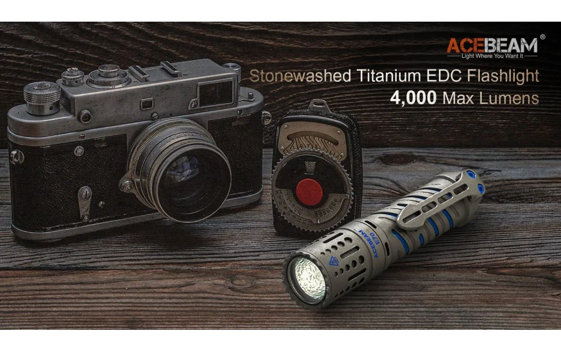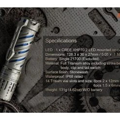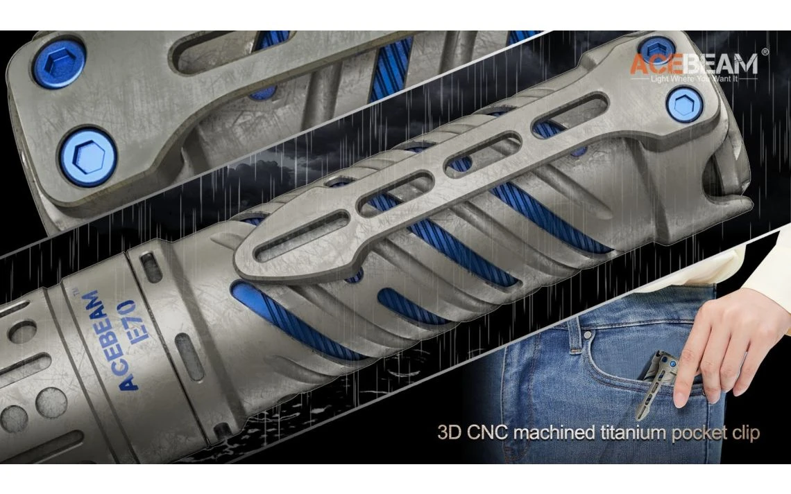 203g, 4,000 Lumens: The AceBeam E70-TI is a compact EDC torch with a unique titanium design and a powerful output. It uses one CREE XHP70.2 LED to produce a max output of 4,000 lumens and a 220m beam distance. The E70 has 6 brightness levels and a strobe mode to give you the right amount of light for a variety of situations. The E70-TI runs off a 5100mAh 21700 battery which is directly rechargeable with the included USB-C cable. The all-in-one metal tail switch allows you to conveniently control the torch and the lockout mode prevents accidental activation. This torch is made from durable high-strength titanium and is 1 metre impact resistant and waterproof to 2 metres submersible. With its compact size, high output and durable build quality, this is a great torch for camping, search and rescue, security, industrial and outdoor applications. Available with cool white, neutral white, or High CRI95+ LED tint (2500 lumens).