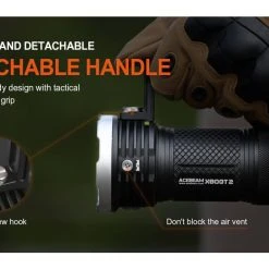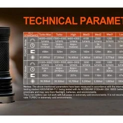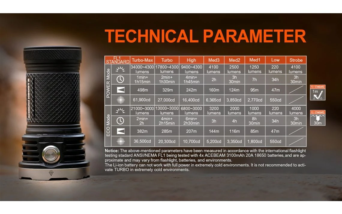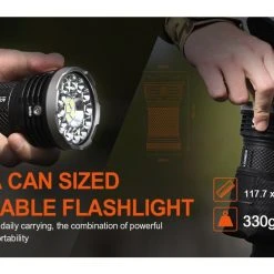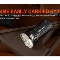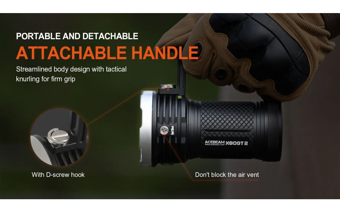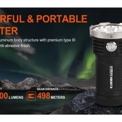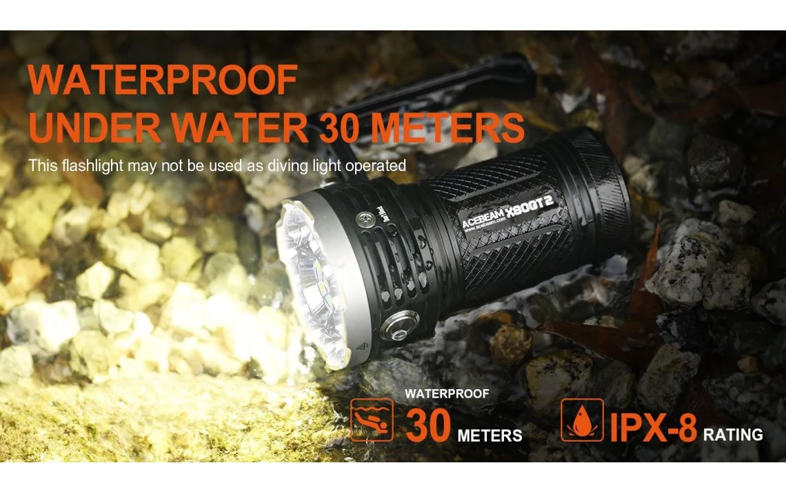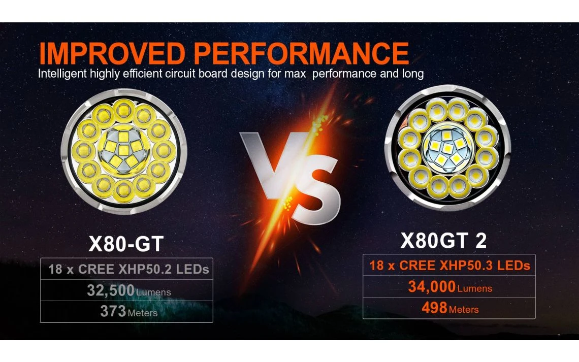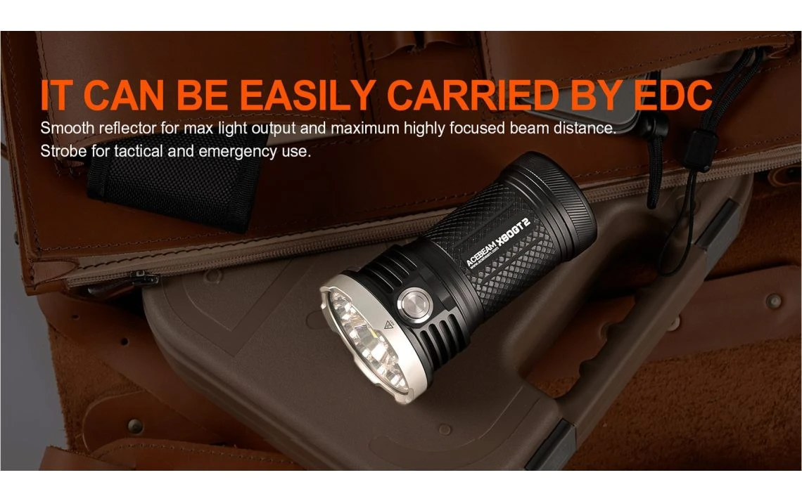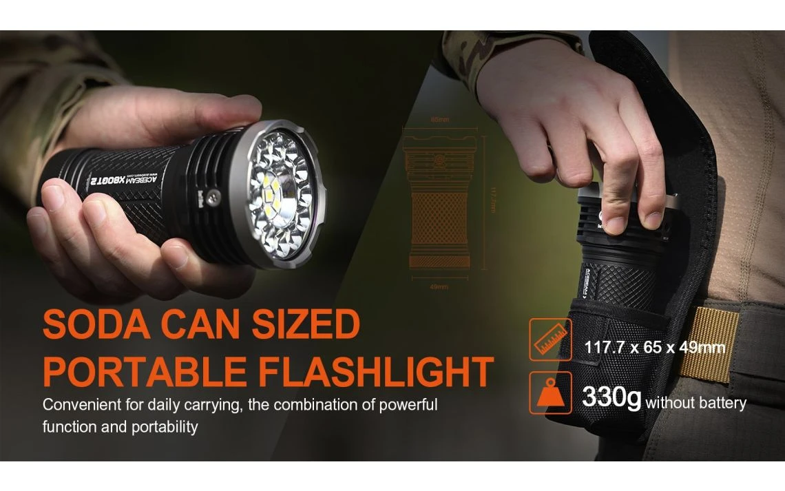 330g, 34,000 lumens. The new AceBeam X80 Series has evolved and the X80GT 2 now features an amazing 34,000 lumen output equipped with 18 CREE XHP50.3 LED’s into the same sized frame as the original X80 model. It is powered by four IMR 18650 batteries (Included) and comes with 7 unique brightness levels ranging from its maximum output down to 220 Lumens, as well as a blinding Strobe function. Mini Extreme Output Floodlight!