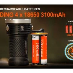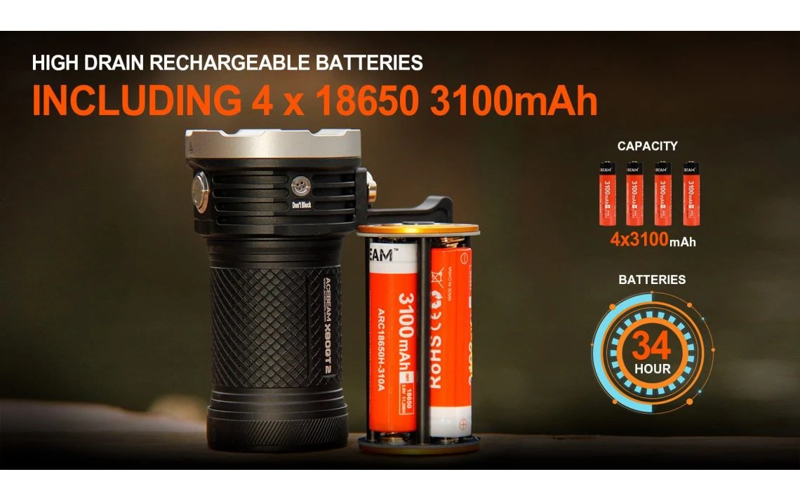 - 4 x AceBeam 3100mAh high drain rechargeable 18650 (ADD A CHARGER if required)