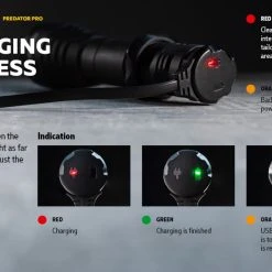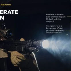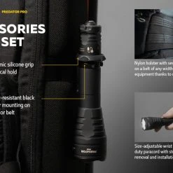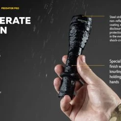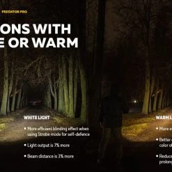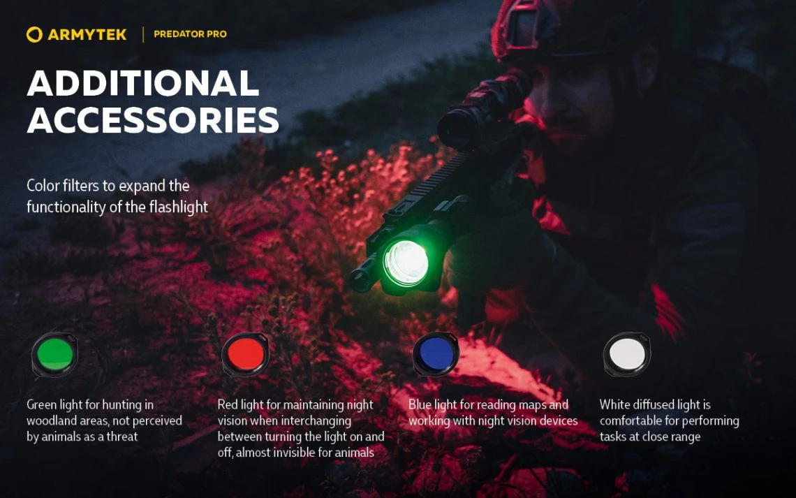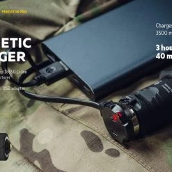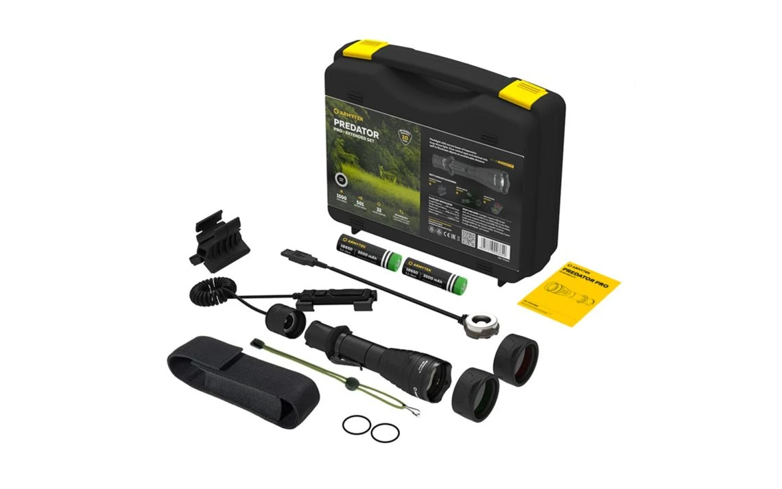 186g, 1500 lumens: The Armytek Predator Pro is a tactical torch with an impressive throw for specialised applications and hunting. A central spot with minimal side spill allows illumination of objects at a peak beam distance of 501 metres. The new generation of Predator Pro from Armytek is ready with high-tech features. The torch comes with a fast magnetic charging cable and a 3500mAh battery. Its well-thought-out design ensures that the torch will be of maximum use in the field. Its features include a silicone grip, a noiseless tactical button, compatibility with most weapon mounts, original remote switches, and colour filters. Check out Predator Pro for a standalone version. A compact long-range torch with a magnetic USB charger in a hunting kit!