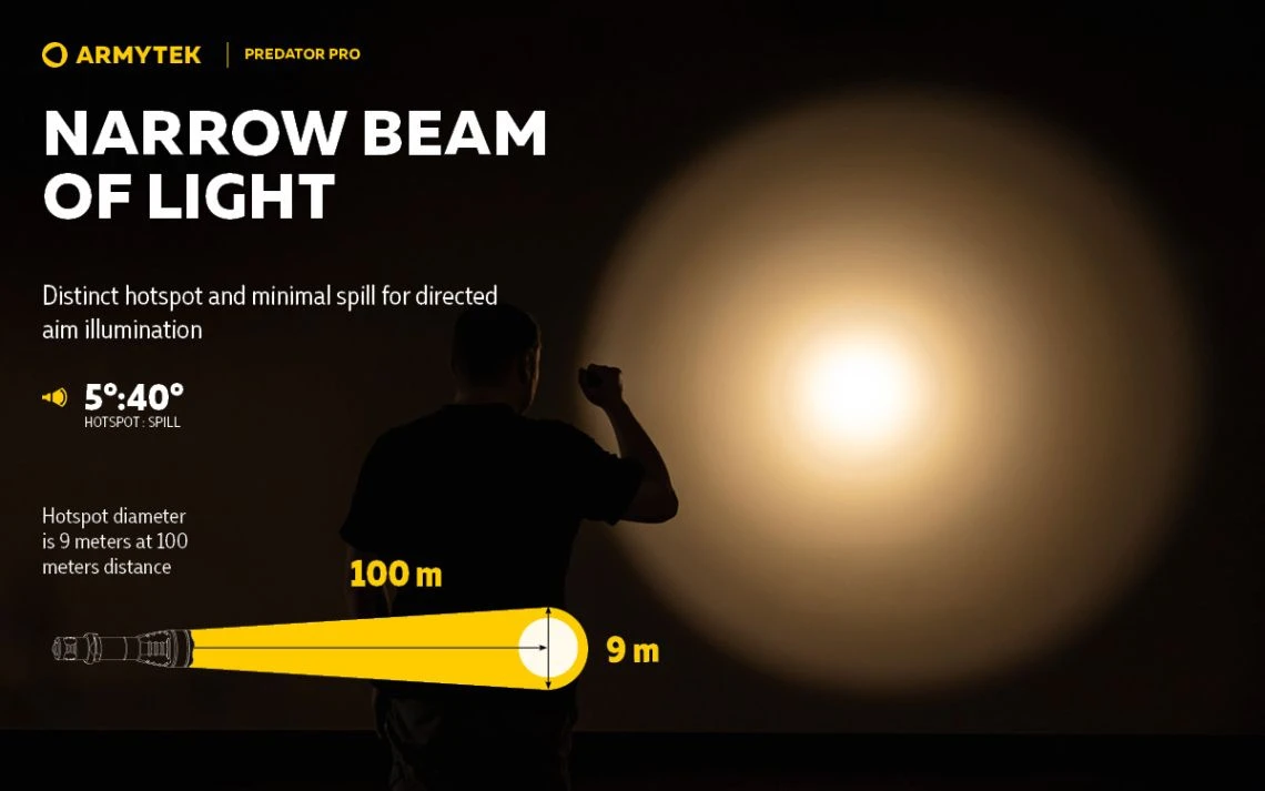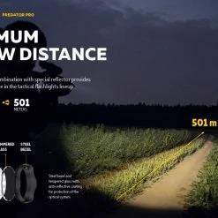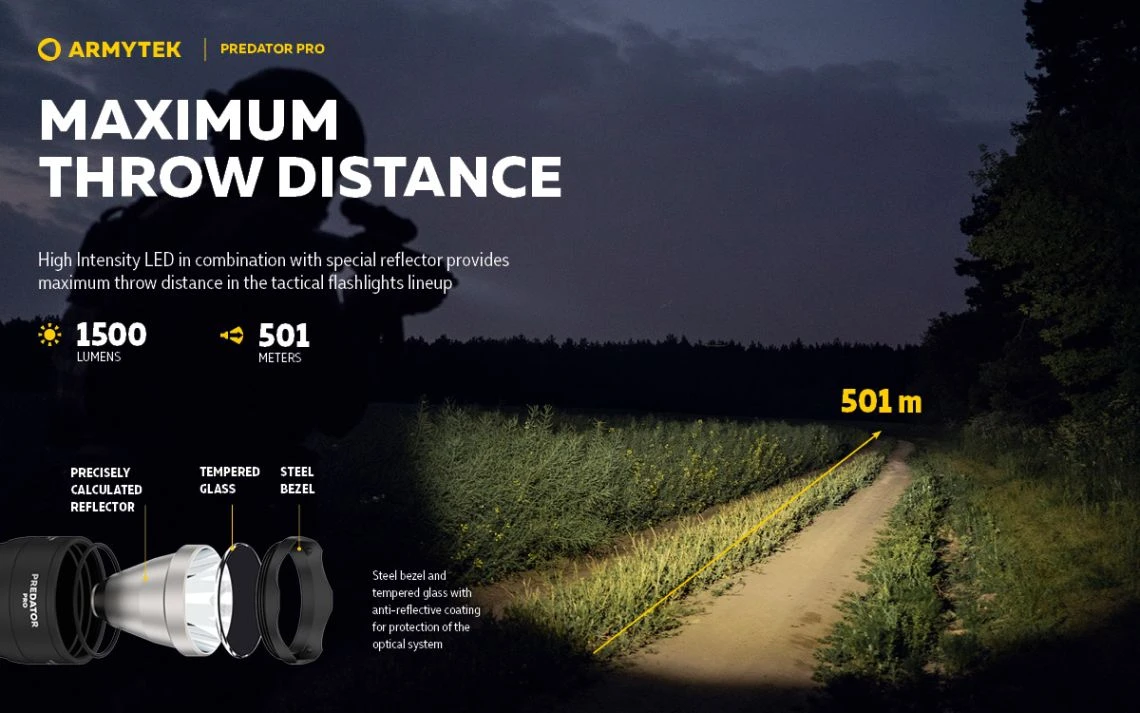 - Maximum throw distance: special precisely calculated reflector for High Intensity LED modification, which provides 1.5 times the light range compared to a usual LED, and tempered glass with anti-reflective coating for maximum throw create clear central spot with minimal side spill at 1500 lumens brightness. Spill diameter is 9 metres at 100 metres distance.