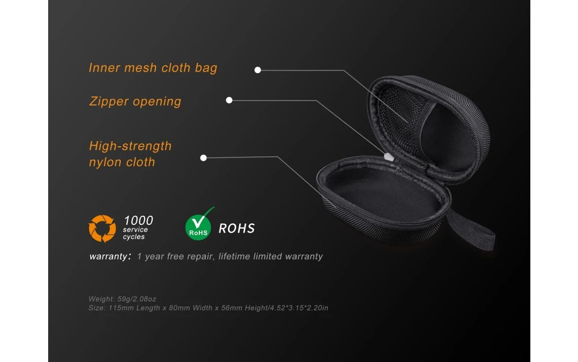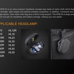 The Fenix APB-20 is high-quality compact headlamp storage bag. It is made of nylon, inner mesh cloth and has a zipper opening. APB-20 is large enough to keep a headlamp and a spare battery.