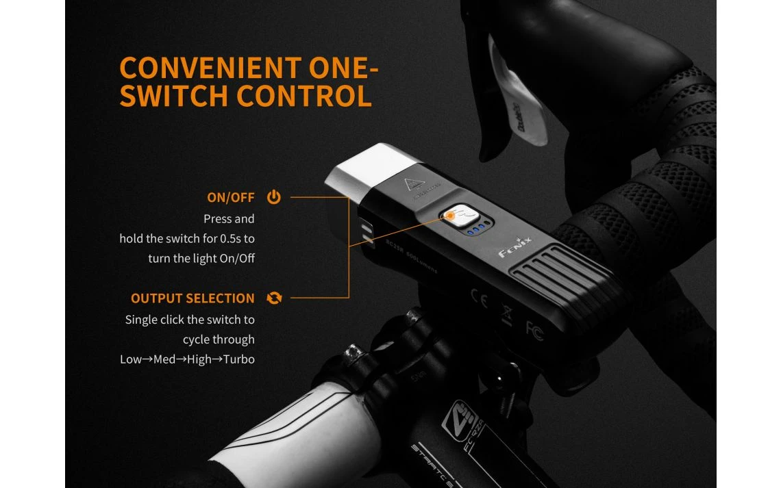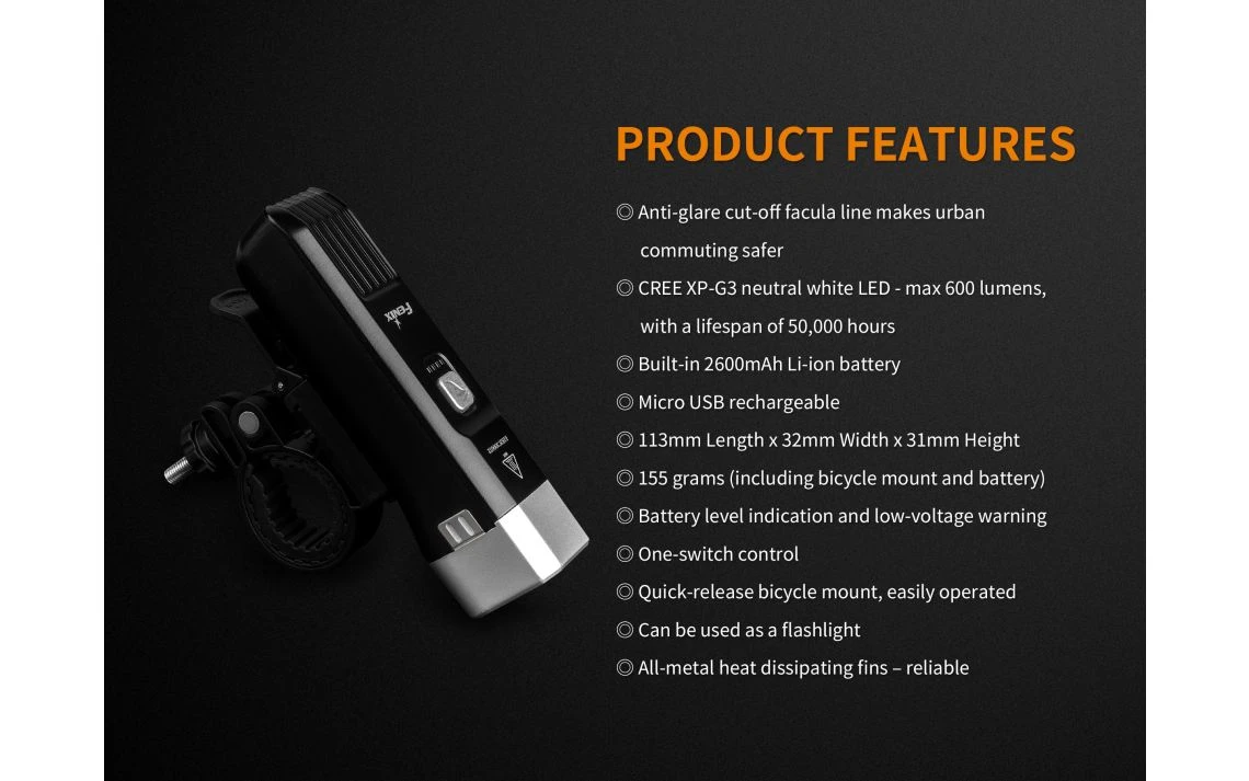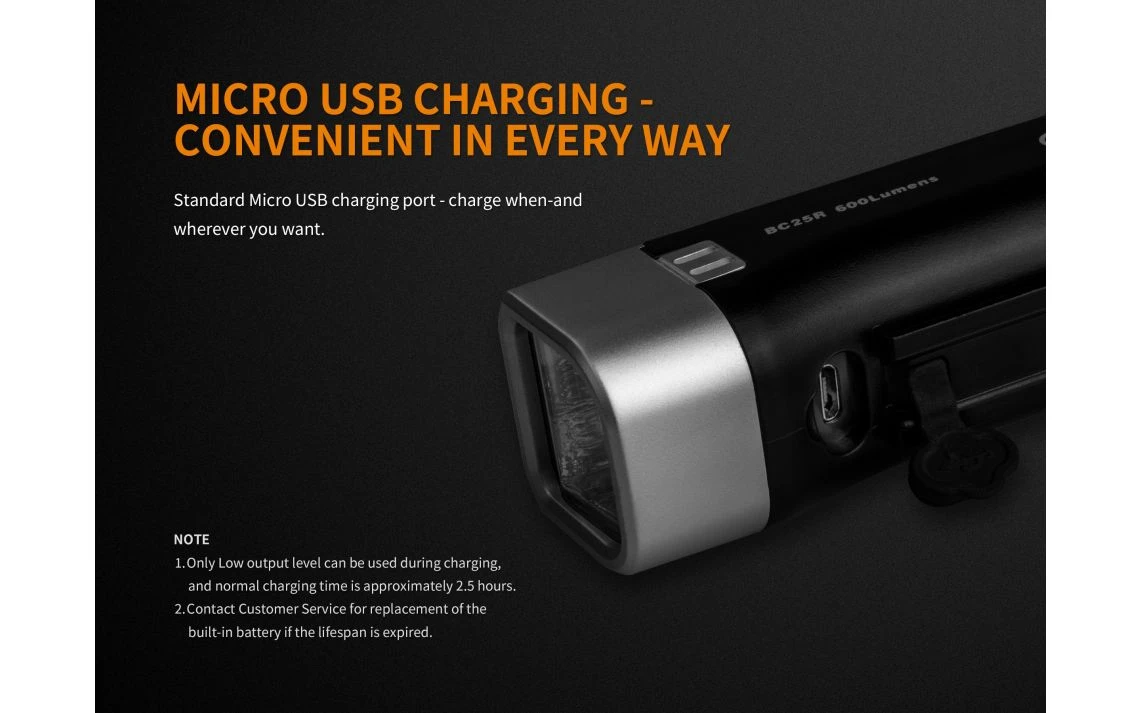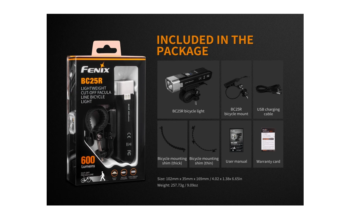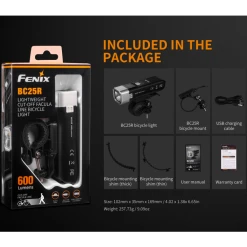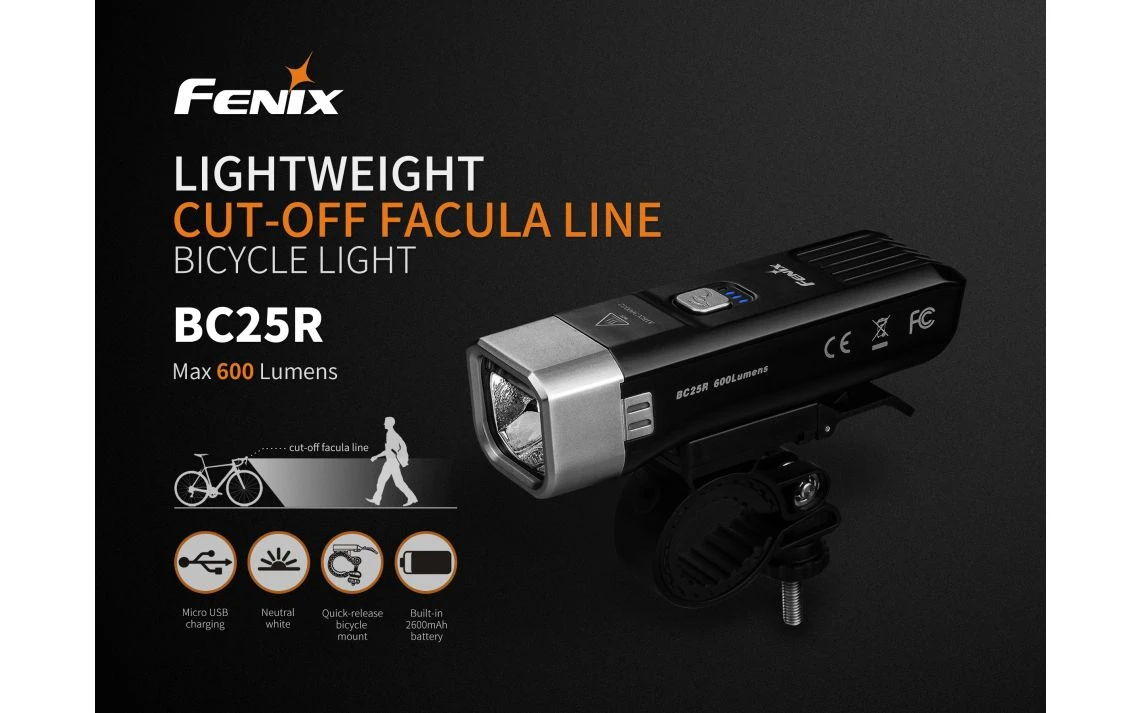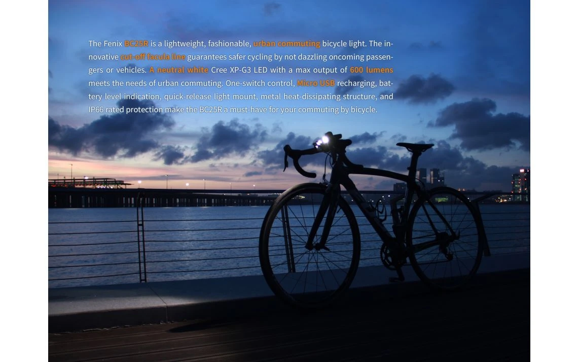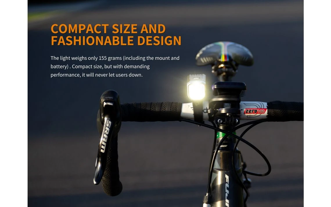155g, 600 lumens: The Fenix BC25R is the latest in Fenix’s line of high performance, compact bike lights. Outfitted with a neutral white CREE XP-G3 LED, the BC25R can reach up to 600 Lumens with adjustable light levels and a utility flashing mode. Fenix BC25R comes with an integrated Li-ion battery pack and is Micro-USB rechargeable. Lightweight bicycle light!
