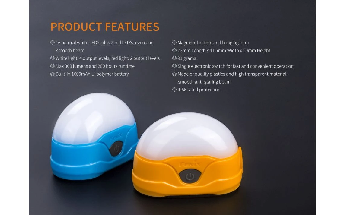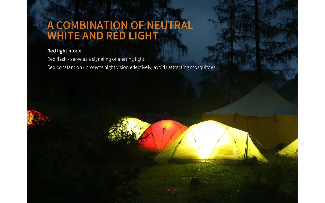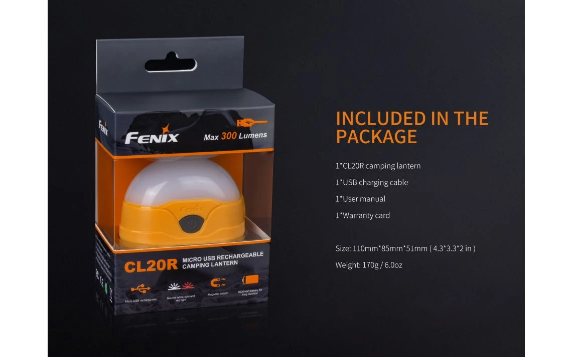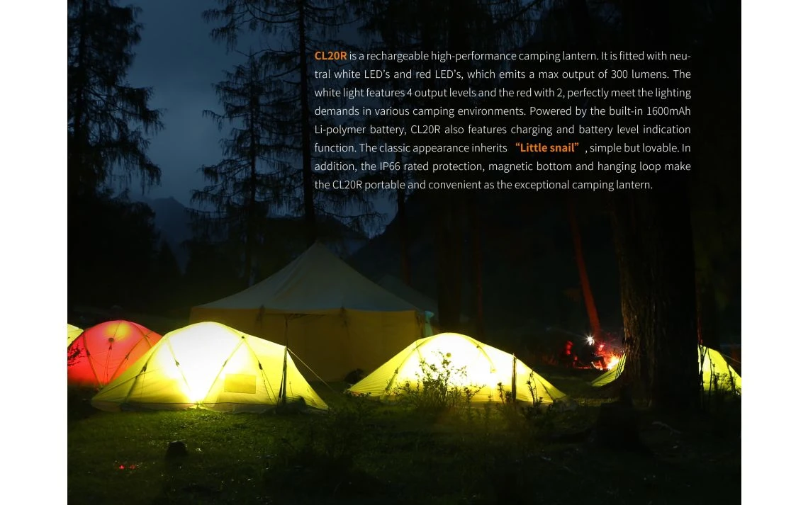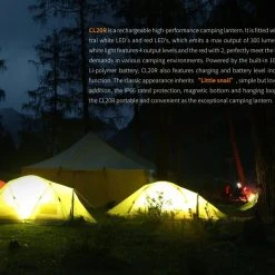 170g, 300 lumens: The Fenix CL20R camping lantern offers 300 Lumens and runs of a built-in 1600mAh Li-polymer battery pack. It also includes 4 output modes with its neutral white LED and then another 2 output modes with its red LED. With an IP66 rating, the Fenix CL20R rechargeable camping lantern is completely resistant to dust and water! Camping in the great outdoors can be a treacherous but with your CL20R can be used in rain, sleet, and snow. Micro USB charging