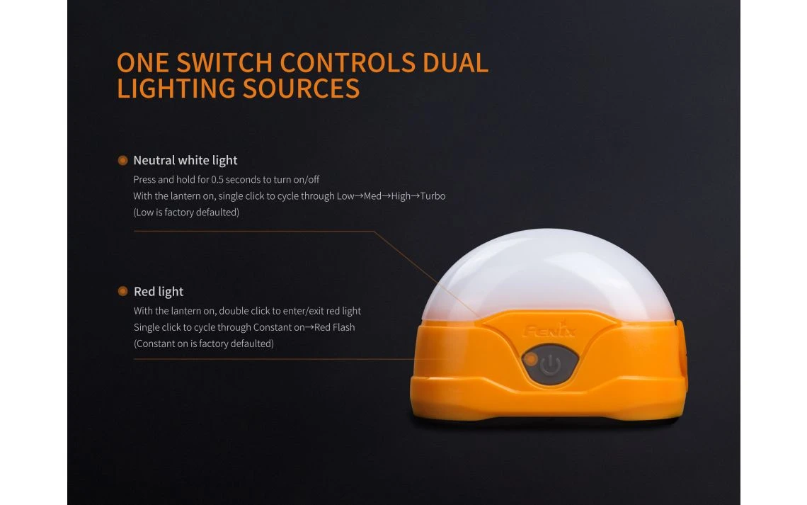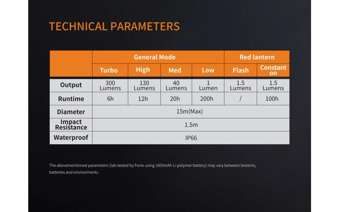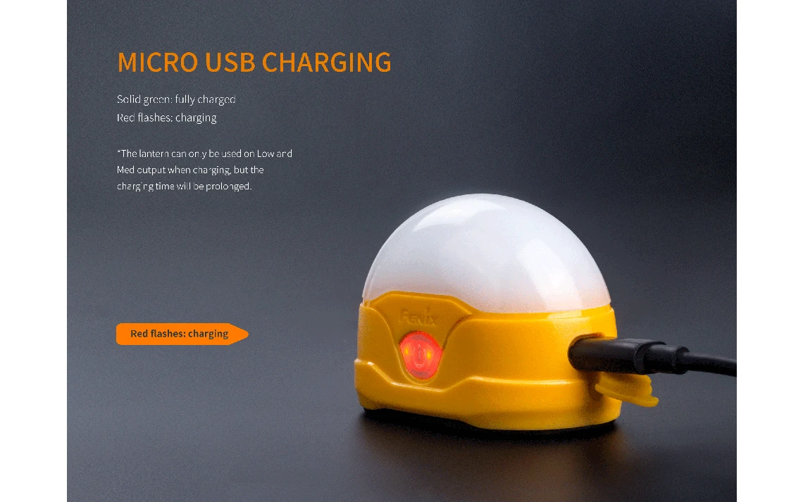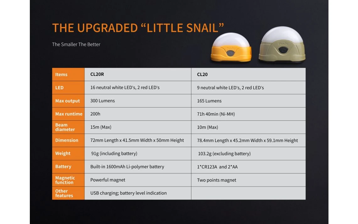 170g, 300 lumens: The Fenix CL20R camping lantern offers 300 Lumens and runs of a built-in 1600mAh Li-polymer battery pack. It also includes 4 output modes with its neutral white LED and then another 2 output modes with its red LED. With an IP66 rating, the Fenix CL20R rechargeable camping lantern is completely resistant to dust and water! Camping in the great outdoors can be a treacherous but with your CL20R can be used in rain, sleet, and snow. Micro USB charging