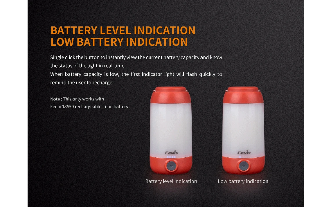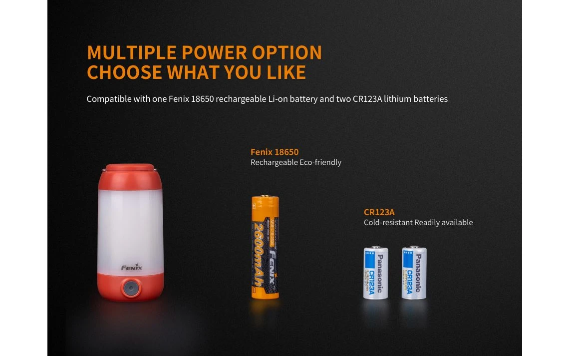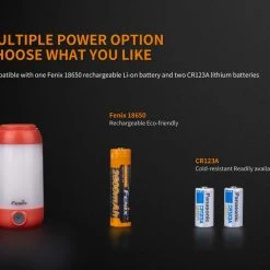 - Power Source: 1 x 18650 Li-Ion battery or 2 x CR123A (Fenix ARB L18 2600 Included)