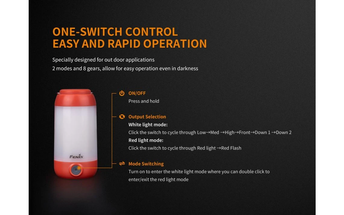 - Dual modes design: 6 white output levels, 2 red output levels.