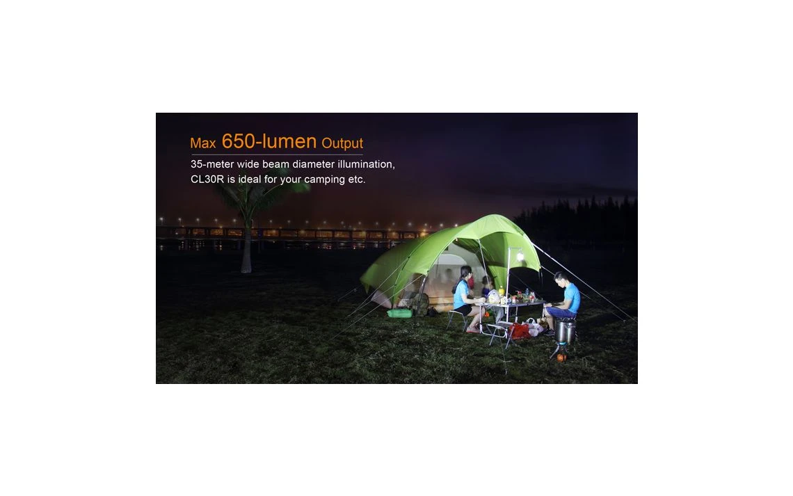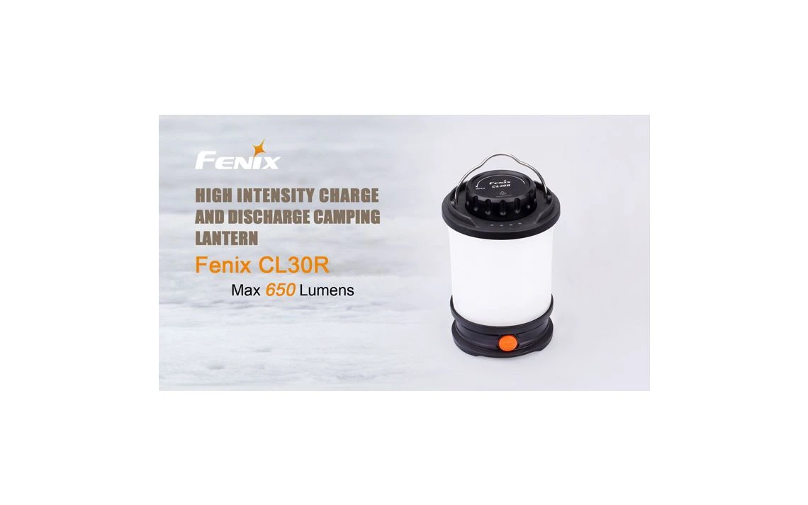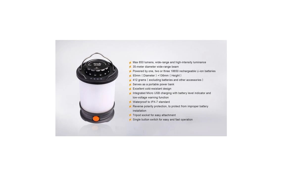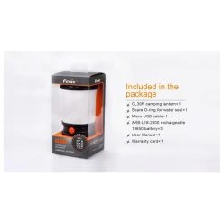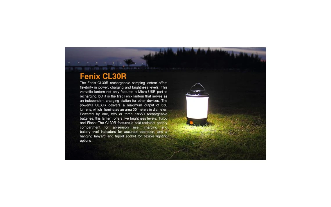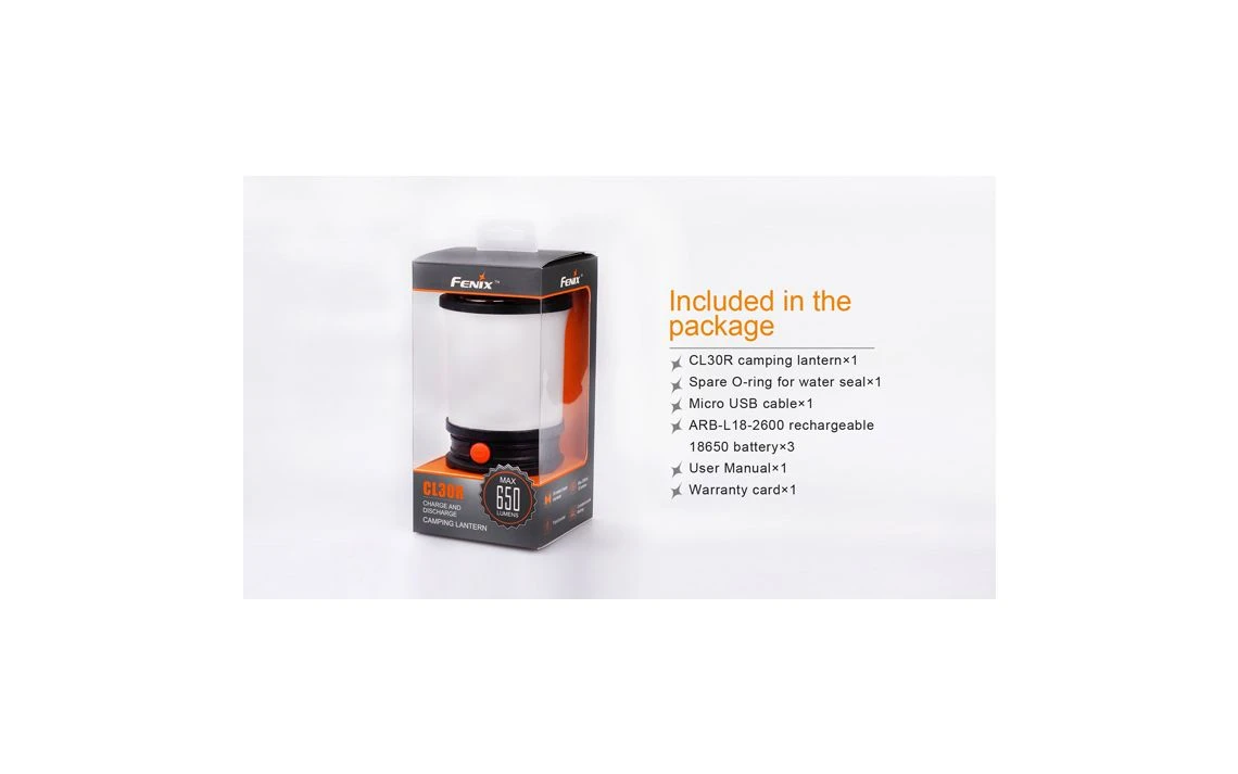 412g, 650 Lumens: This versatile lantern not only features a Micro USB port to recharging, but it is the first Fenix lantern that serves as an independent charging station for other devices. The powerful CL30R delivers a maximum output of 650 lumens, which illuminates an area 35 meters in diameter. Powered by one, two or three 18650 rechargeable batteries, this lantern offers five brightness levels, Turbo and Flash. 3 X 18650 batteries included.