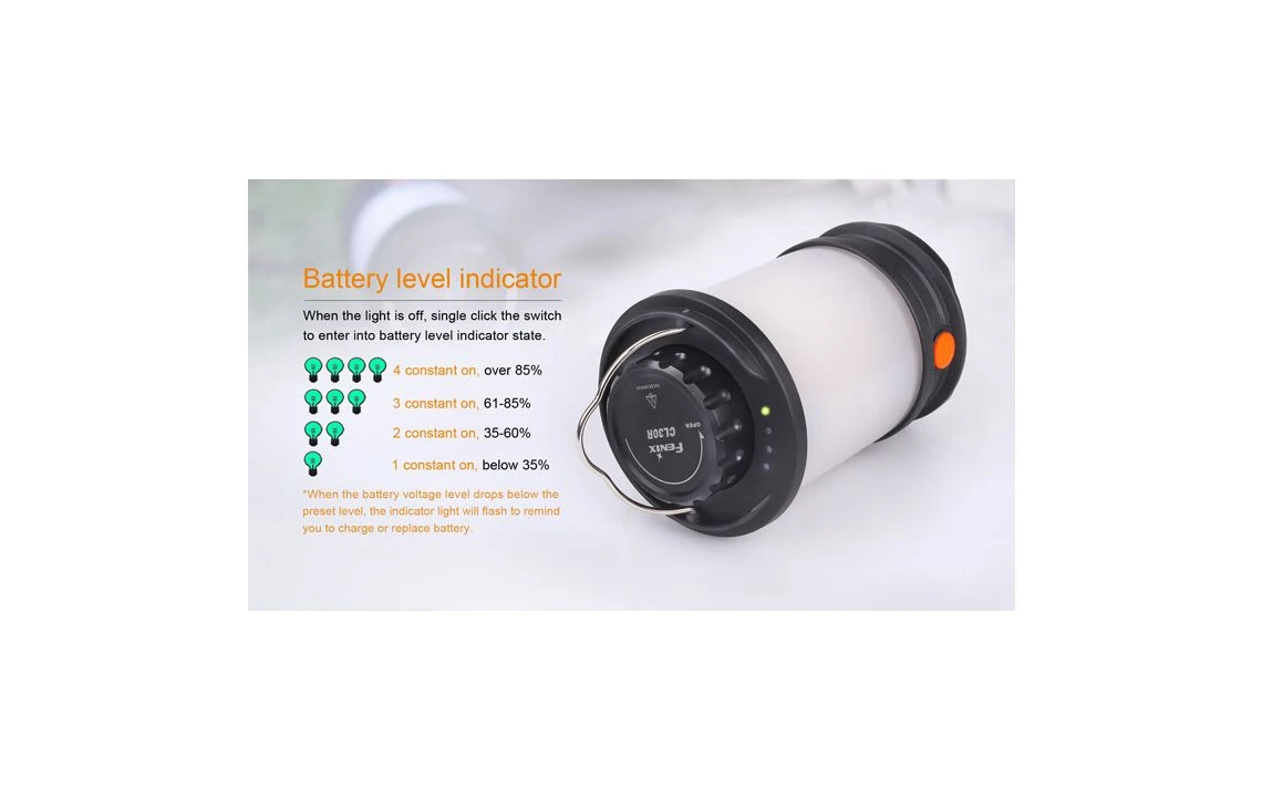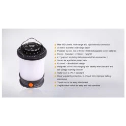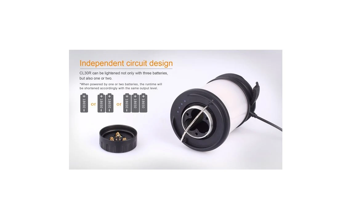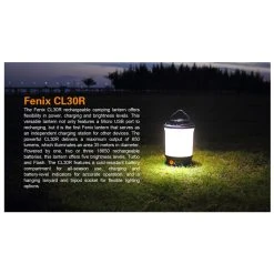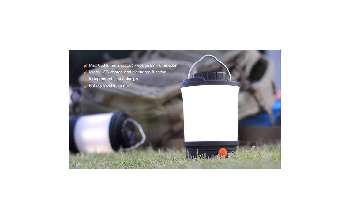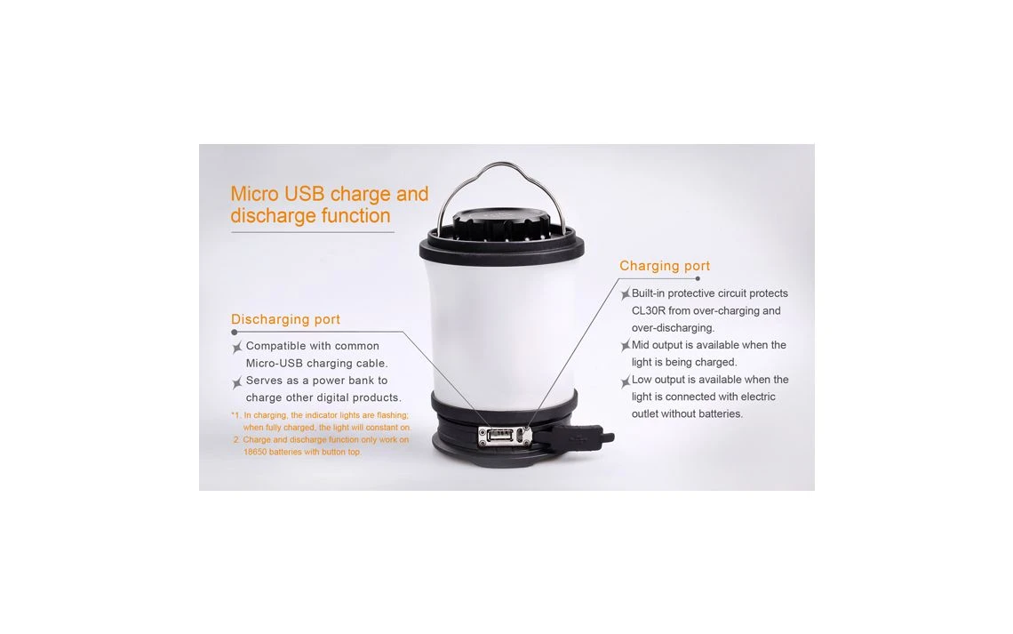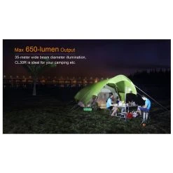 412g, 650 Lumens: This versatile lantern not only features a Micro USB port to recharging, but it is the first Fenix lantern that serves as an independent charging station for other devices. The powerful CL30R delivers a maximum output of 650 lumens, which illuminates an area 35 meters in diameter. Powered by one, two or three 18650 rechargeable batteries, this lantern offers five brightness levels, Turbo and Flash. 3 X 18650 batteries included.