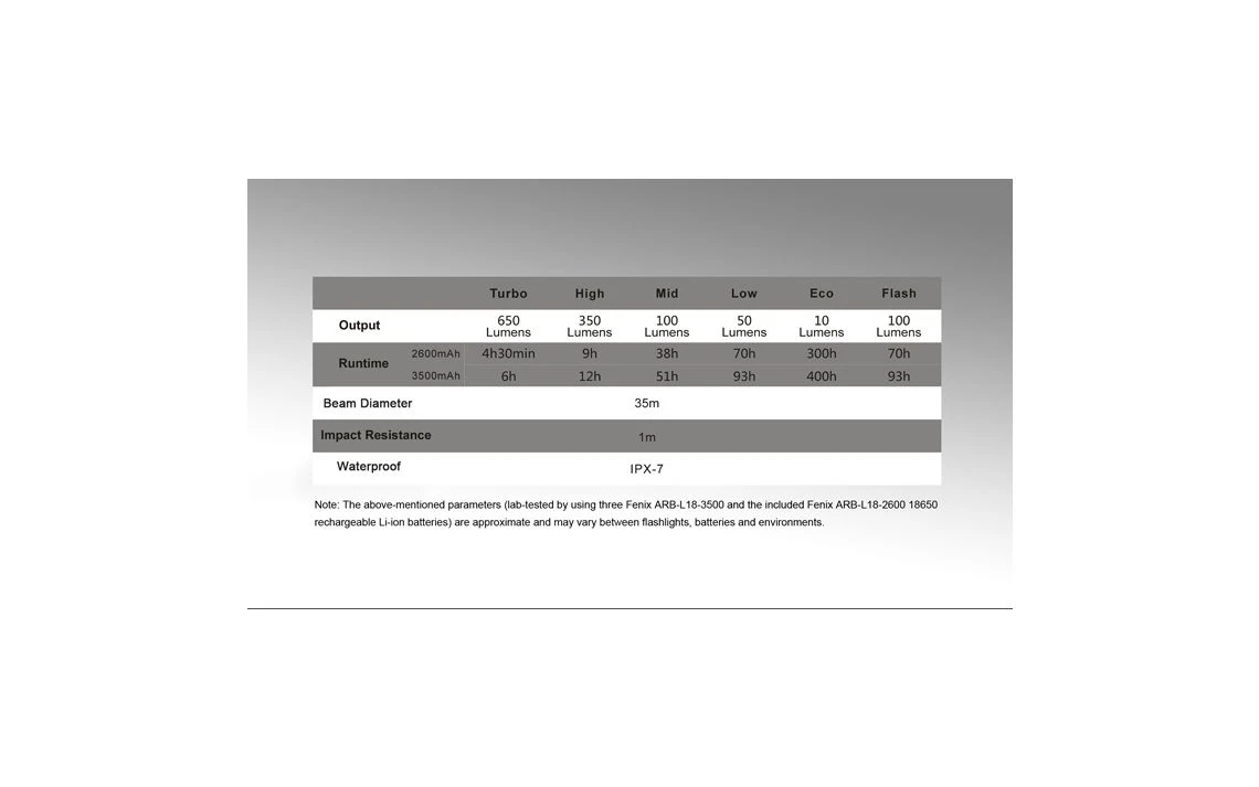 - Turbo – 650 Lumens – 6 Hours