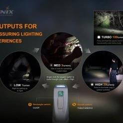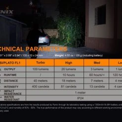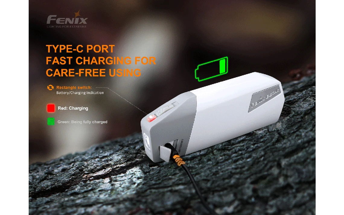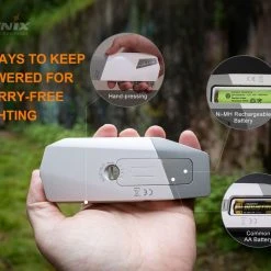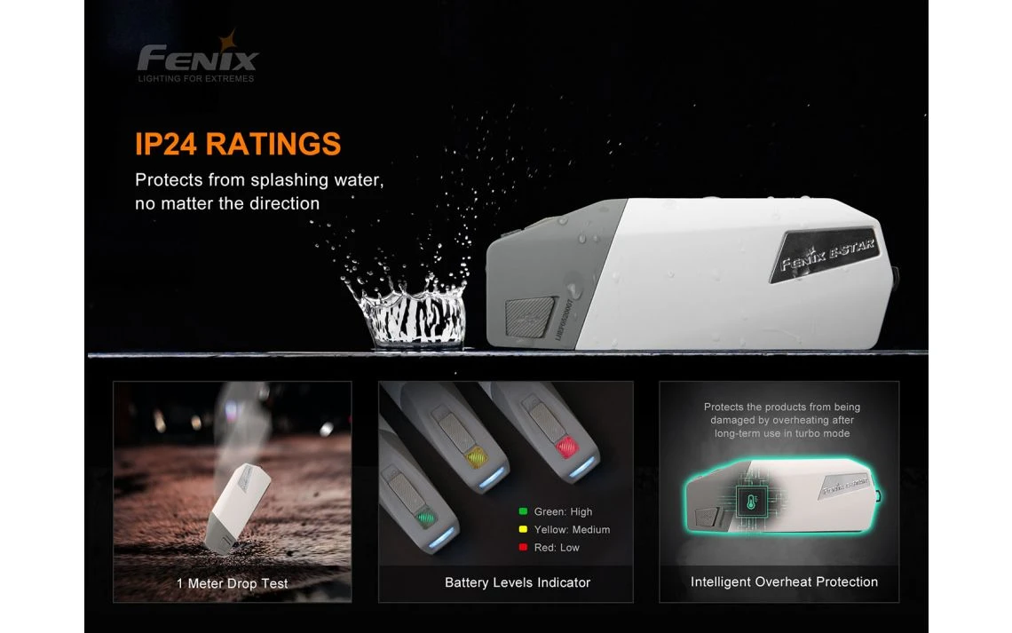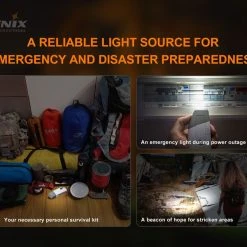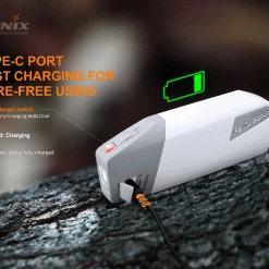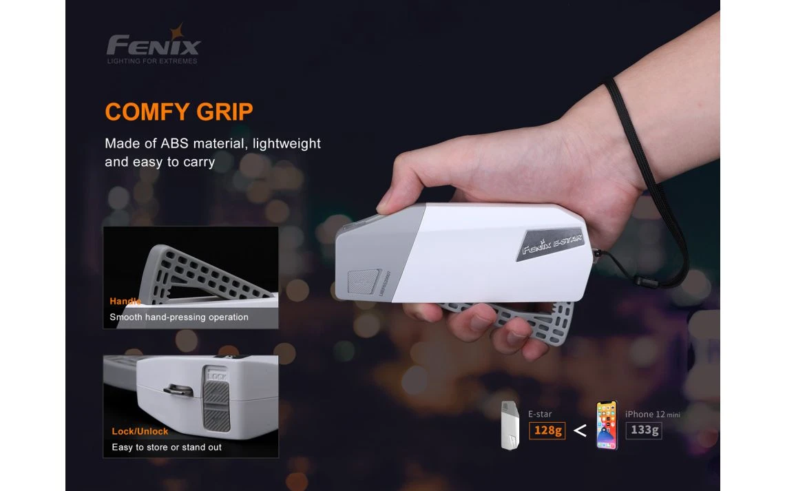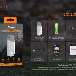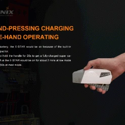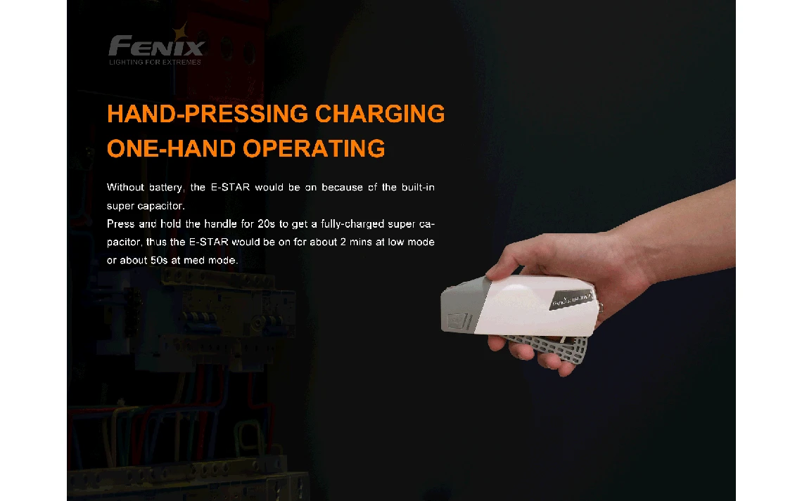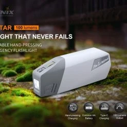 128 g, 100 Lumens: The Fenix E-STAR is a portable self-powered flashlight for emergencies, including areas lacking stable power supply and disaster-hit areas; as PSK/BOB gear, also it can be used as a backup torch for extended outdoor activities. It has four different brightness levels. The med and low modes can work without a break by manually pressing the handle. The high and turbo modes aim to provide a better lighting experience when used with a battery. The torch allows use while charging, a single-handed pressing for power generation, which is easy even for long-time operation. Another power supply comes from the included low self-discharge Ni-MH battery, a common AA battery can be used as well. It supports USB Type-c charging with a built-in super capacitor, which helps with energy storage and buffering when the battery is damaged or missing. Portable self-powered emergency light!
