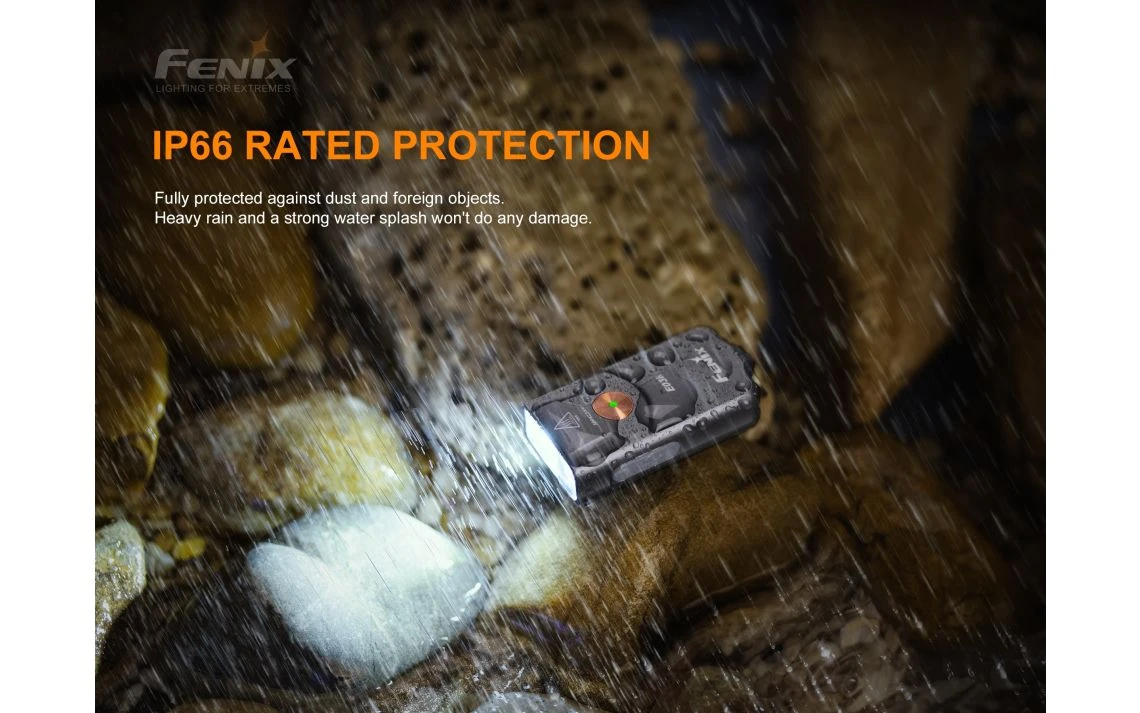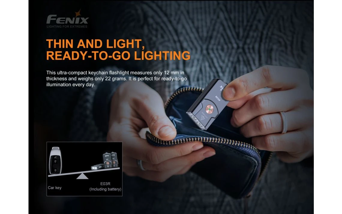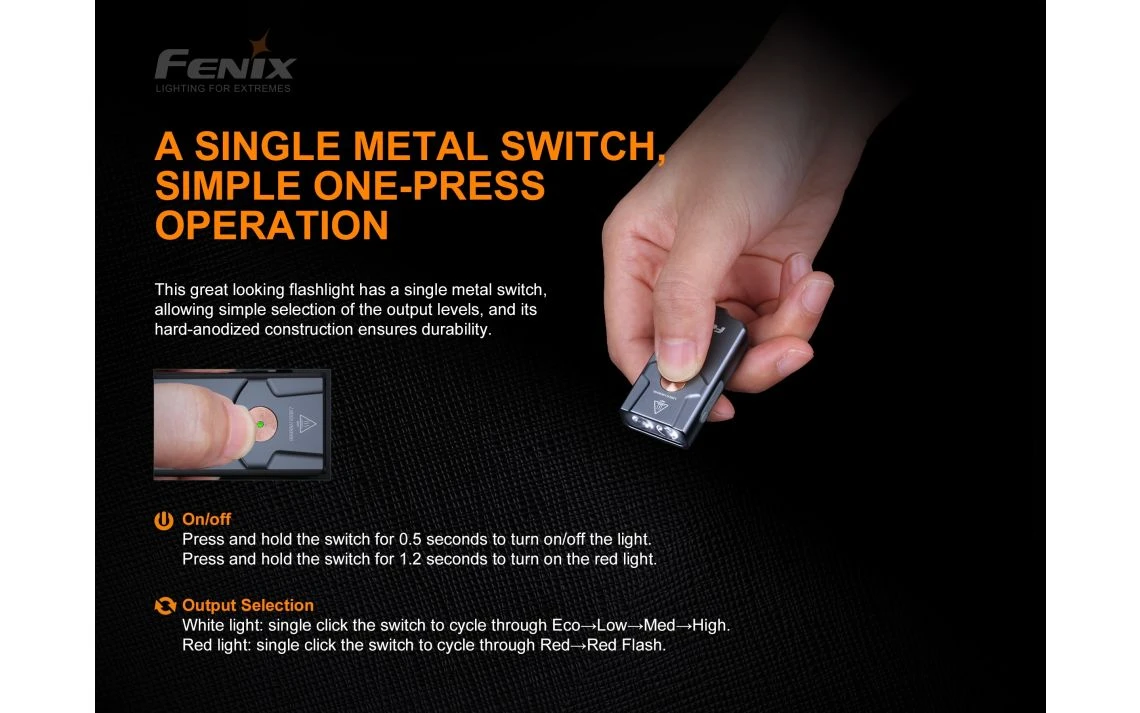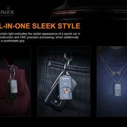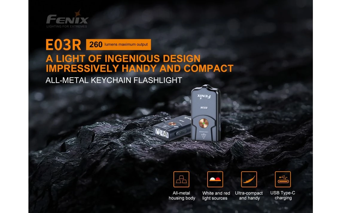 22g, 260 Lumens : The Fenix E03R is new aluminium made rechargeable keychain LED light. Equipped with MATCH CA18 White Light LED and Everlight 2835 Red Light LED, it has max output of 260 lumens on white light and 4 lumens on Red light output. It runs on a built-in 200mAh Li-polymer and can be charged via USB Type-C charging interface. Few features of E03R includes recessed switch, lockout function, battery level indication and low-voltage warning. Dual Red and White light USB Type C Rechargeable keychain light!