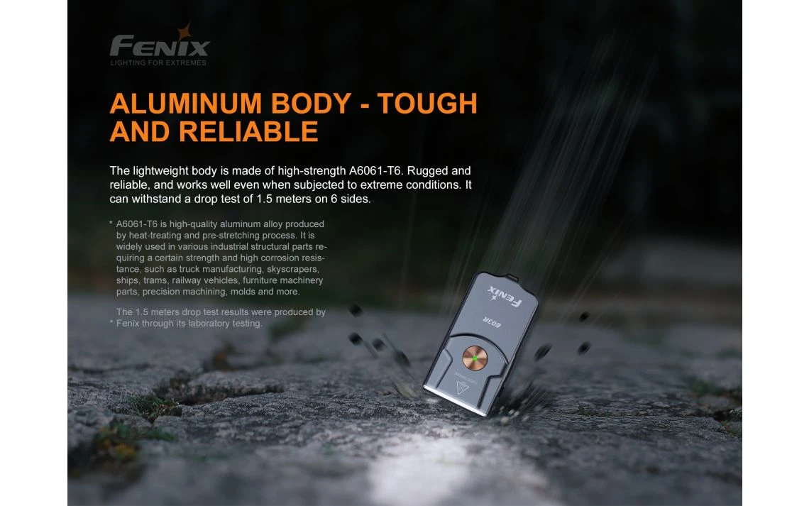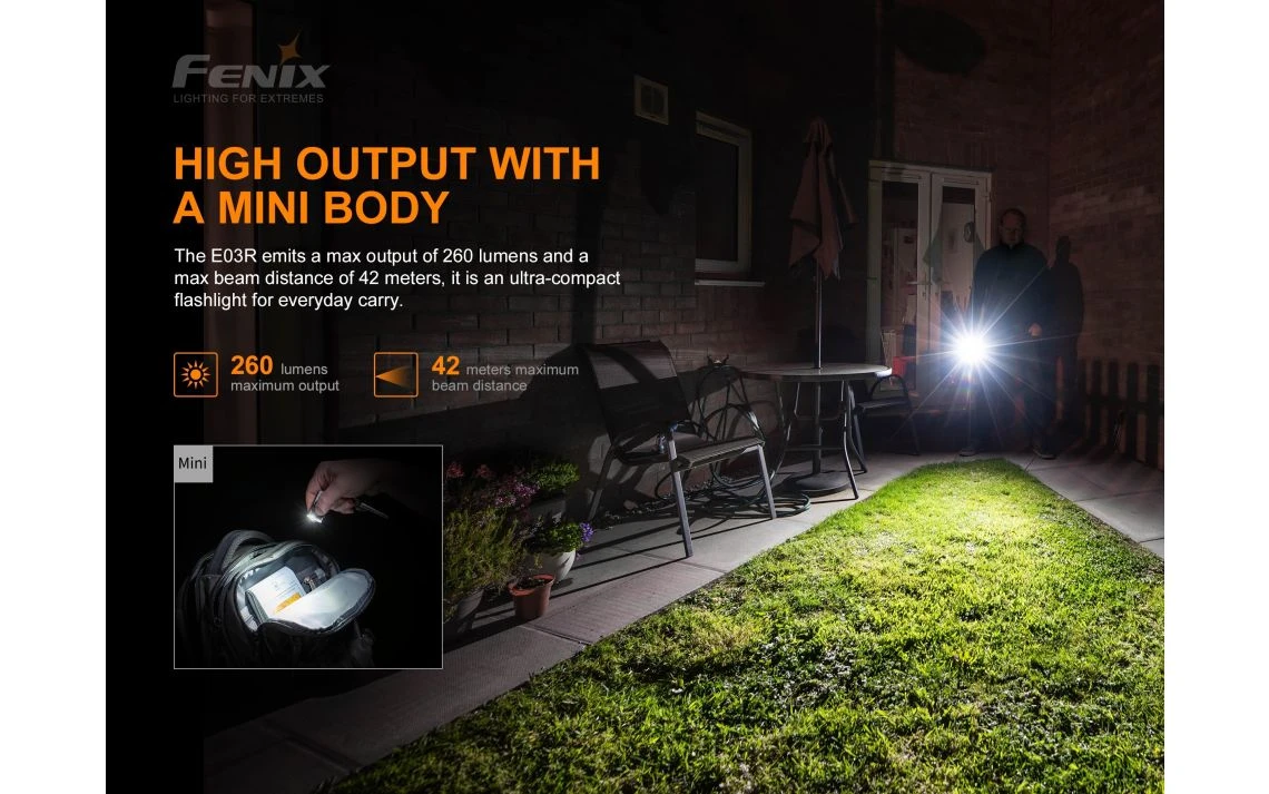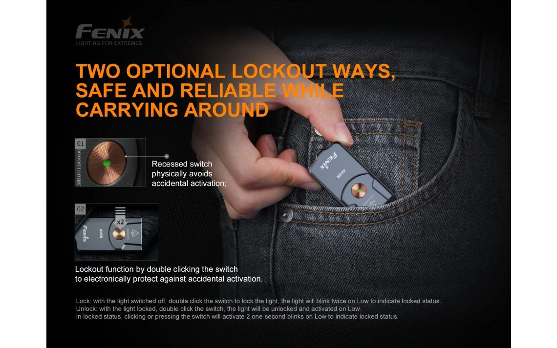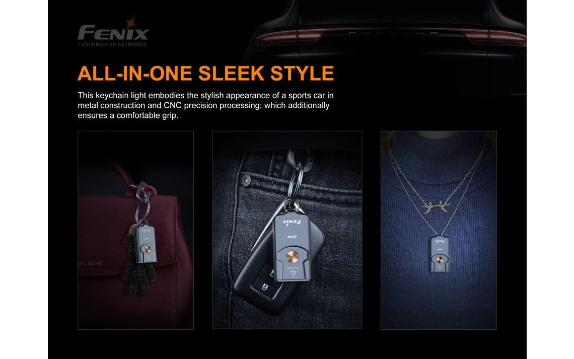 22g, 260 Lumens : The Fenix E03R is new aluminium made rechargeable keychain LED light. Equipped with MATCH CA18 White Light LED and Everlight 2835 Red Light LED, it has max output of 260 lumens on white light and 4 lumens on Red light output. It runs on a built-in 200mAh Li-polymer and can be charged via USB Type-C charging interface. Few features of E03R includes recessed switch, lockout function, battery level indication and low-voltage warning. Dual Red and White light USB Type C Rechargeable keychain light!