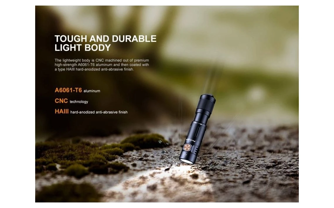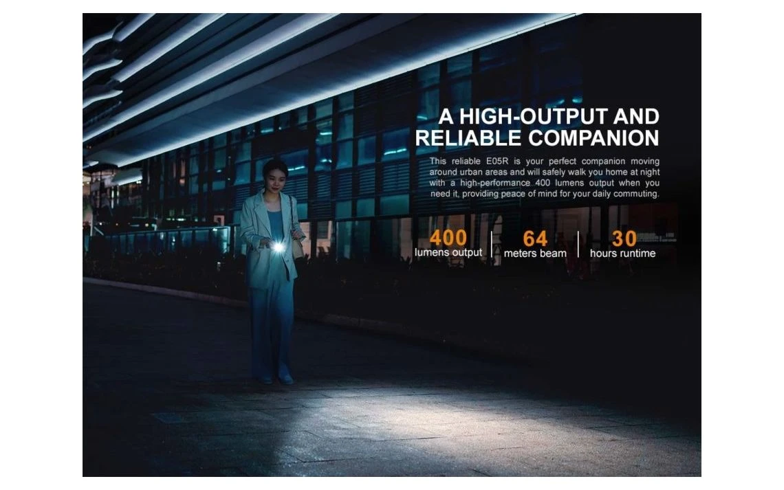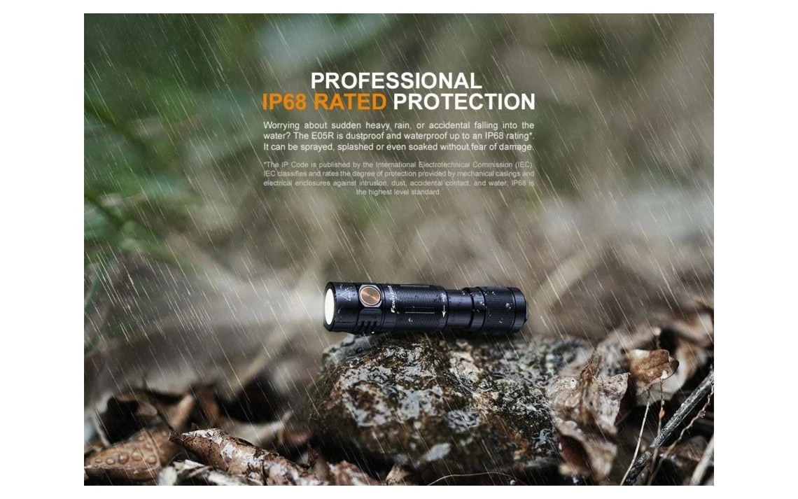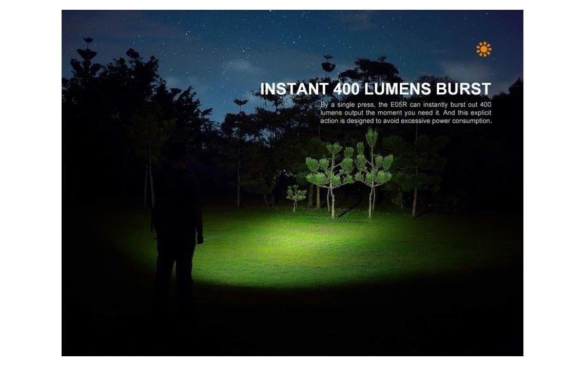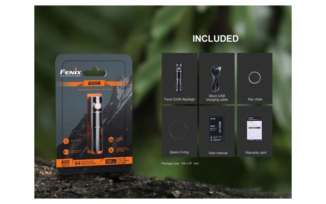 24g, 400 Lumens: The Fenix E05R is a mini rechargeable EDC torch that can produce a max output of 400 lumens and 64m beam distance. The max output can be reached when on burst mode or there is a max output of 150 lumens on high mode. The E05R offers three brightness levels plus a burst mode which can be cycled through using the metal side switch. The E05R runs off a built-in 320mAh Li-polymer battery and it can be recharged via the hidden micro USB port. This torch is a super compact size (6.8cm long) which makes it ideal for keeping in your pocket or on your keychain for bright illumination when you need it. Hidden Micro USB charging port.