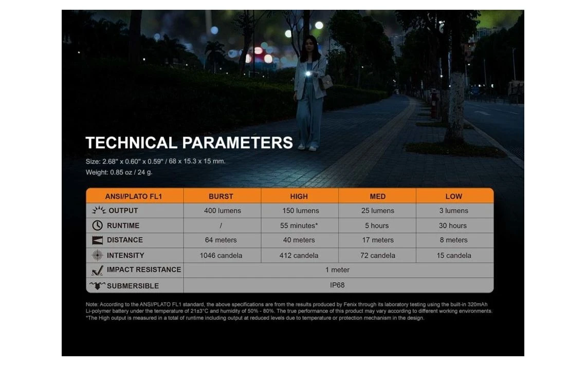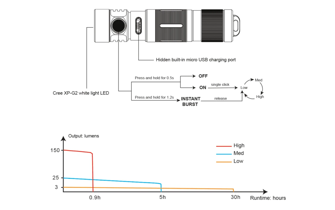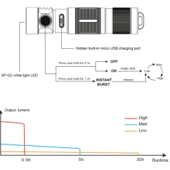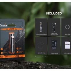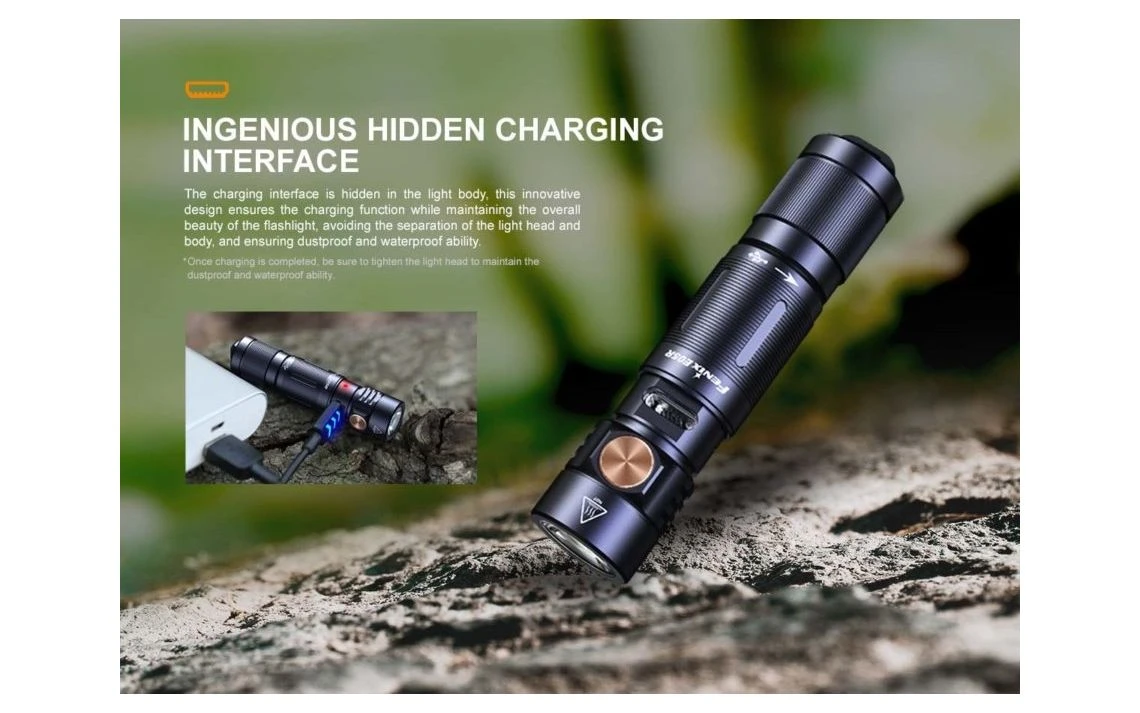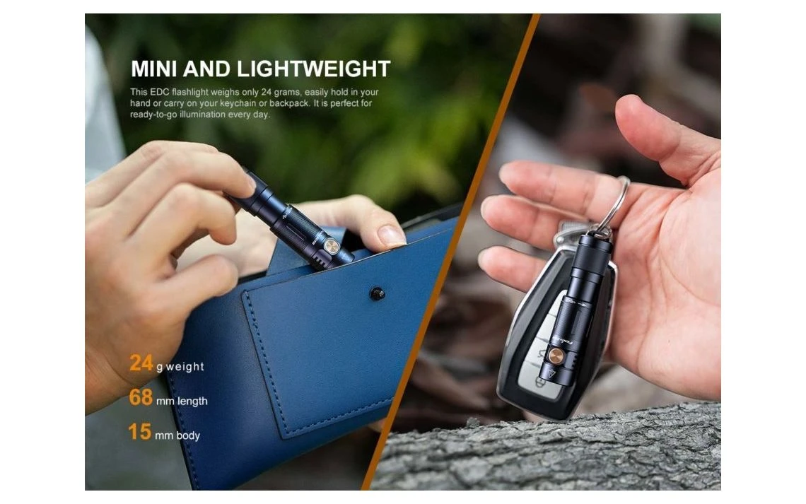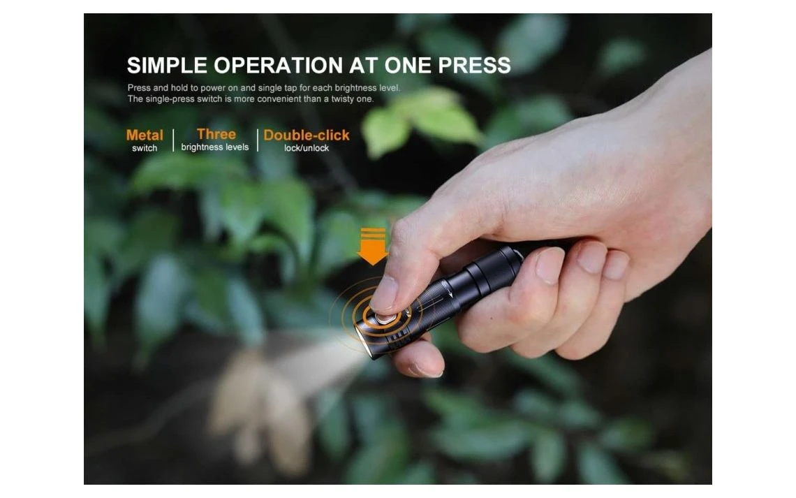 24g, 400 Lumens: The Fenix E05R is a mini rechargeable EDC torch that can produce a max output of 400 lumens and 64m beam distance. The max output can be reached when on burst mode or there is a max output of 150 lumens on high mode. The E05R offers three brightness levels plus a burst mode which can be cycled through using the metal side switch. The E05R runs off a built-in 320mAh Li-polymer battery and it can be recharged via the hidden micro USB port. This torch is a super compact size (6.8cm long) which makes it ideal for keeping in your pocket or on your keychain for bright illumination when you need it. Hidden Micro USB charging port.