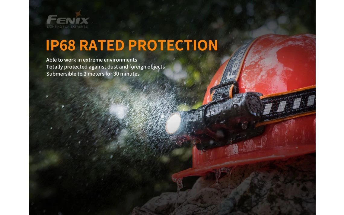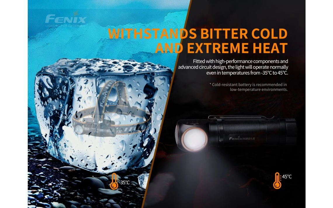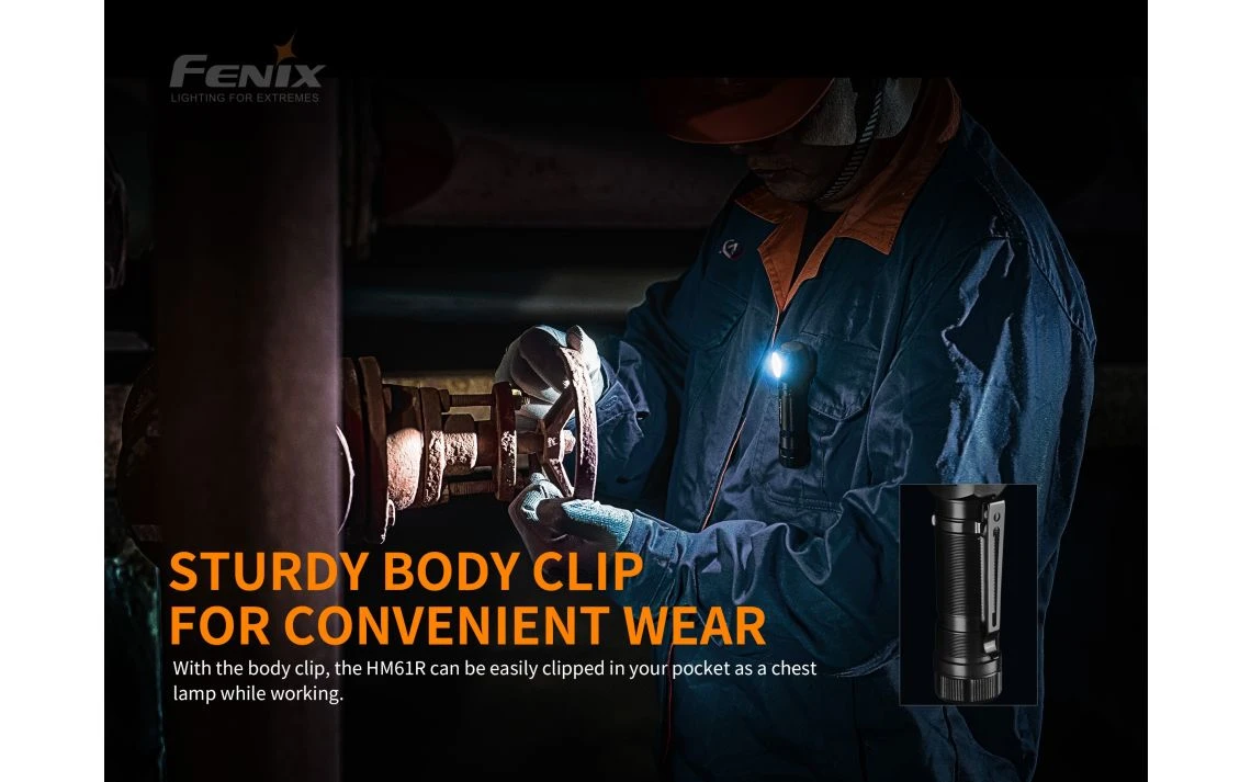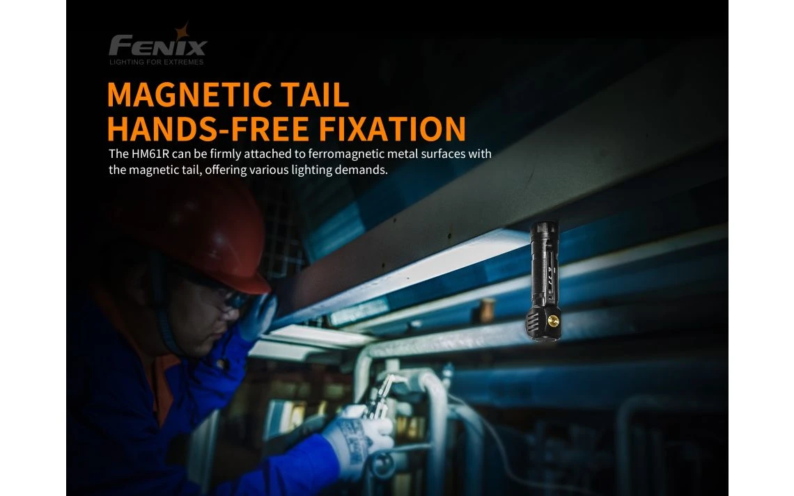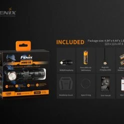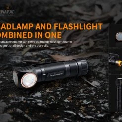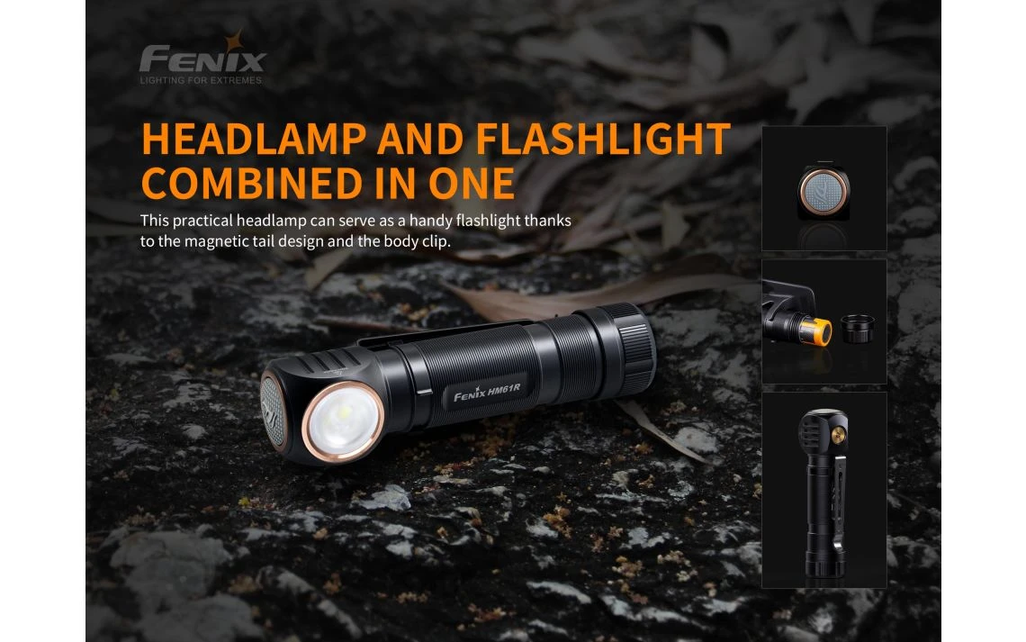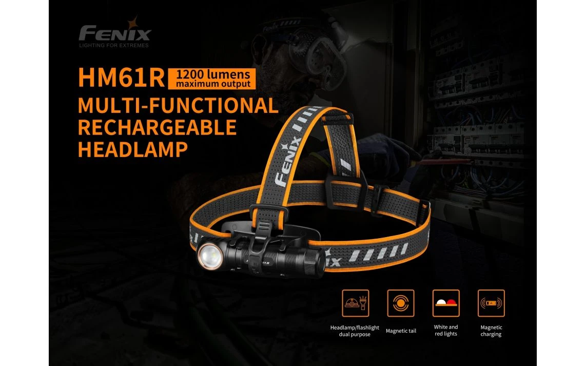 99.5g, 1200 Lumens: The Fenix HM61R is dual Red and White output rechargeable LED headlamp. It is multifunctional light which can also be used as a right-angle torch with magnetic tail stand capability. HM65R has a maximum output of 1200 lumens on white light and 5 lumens from red LEDs. Powered by included 18650 Li-ion rechargeable battery and also compatible with CR123A batteries. Sturdy body clip, easy big switch, magnetic tail with charging, reflective and comfortable head straps are few features. Dual Red and White output rechargeable right angle torch and headlamp!