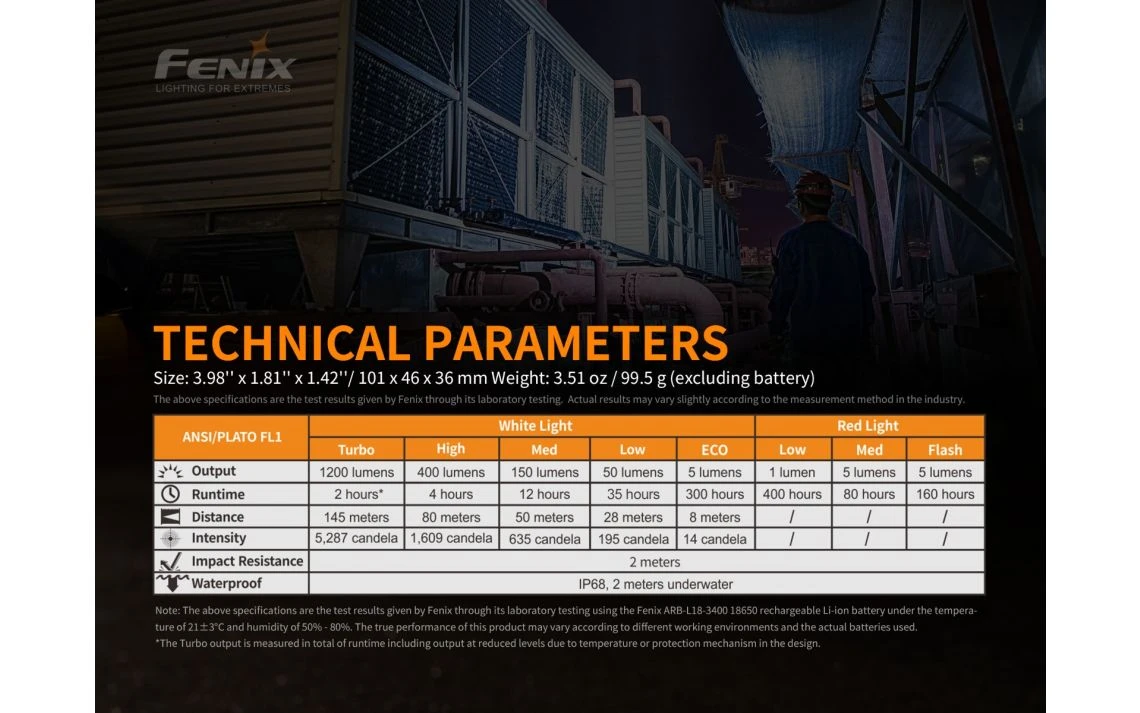 - Power Source:Â 1 x 18650Â (Fenix ARB-L18-3400 rechargeable 18650 battery Included)