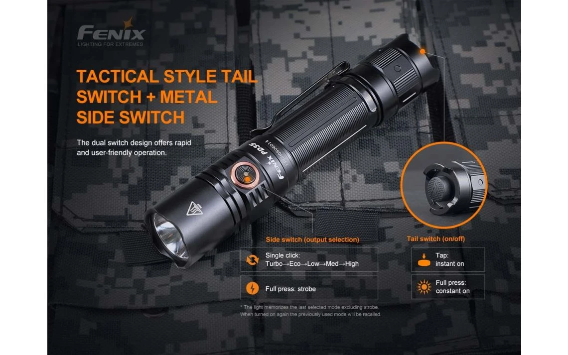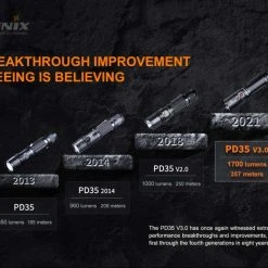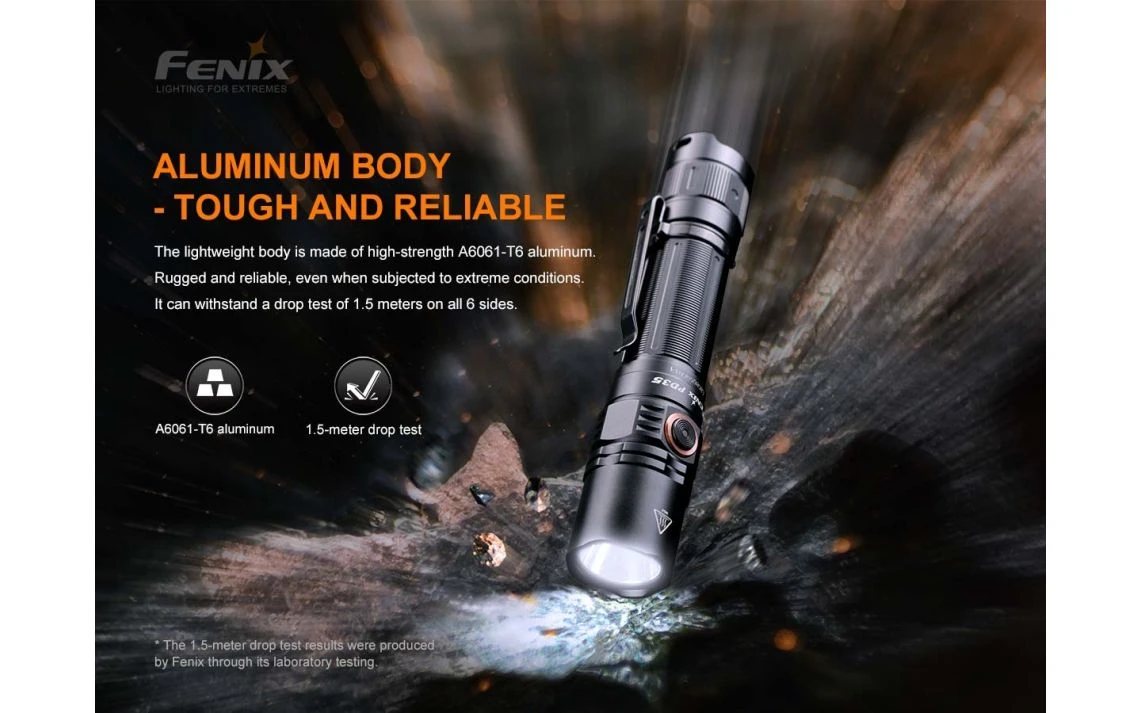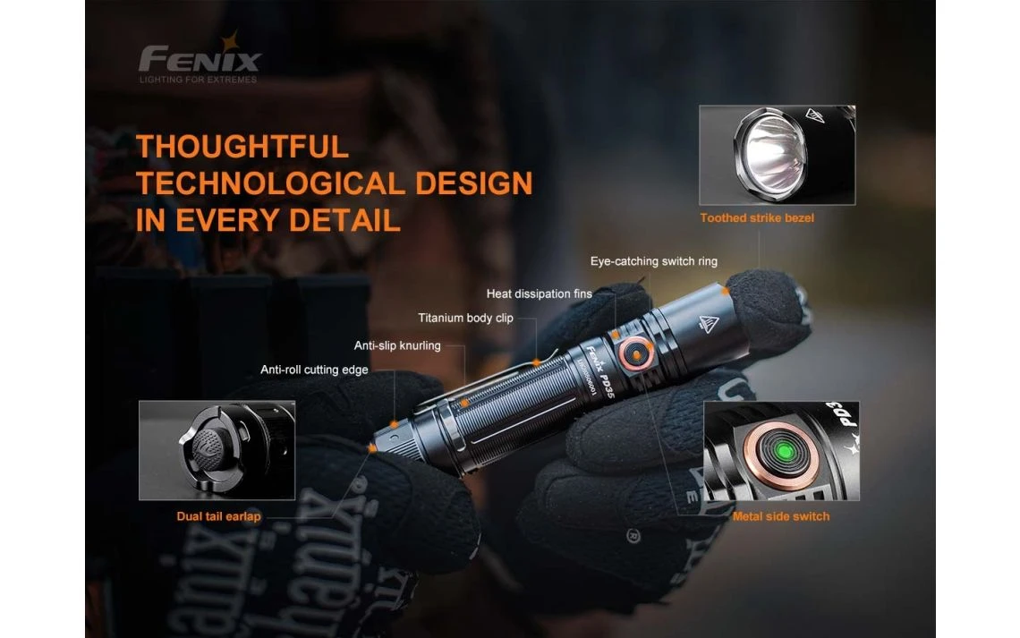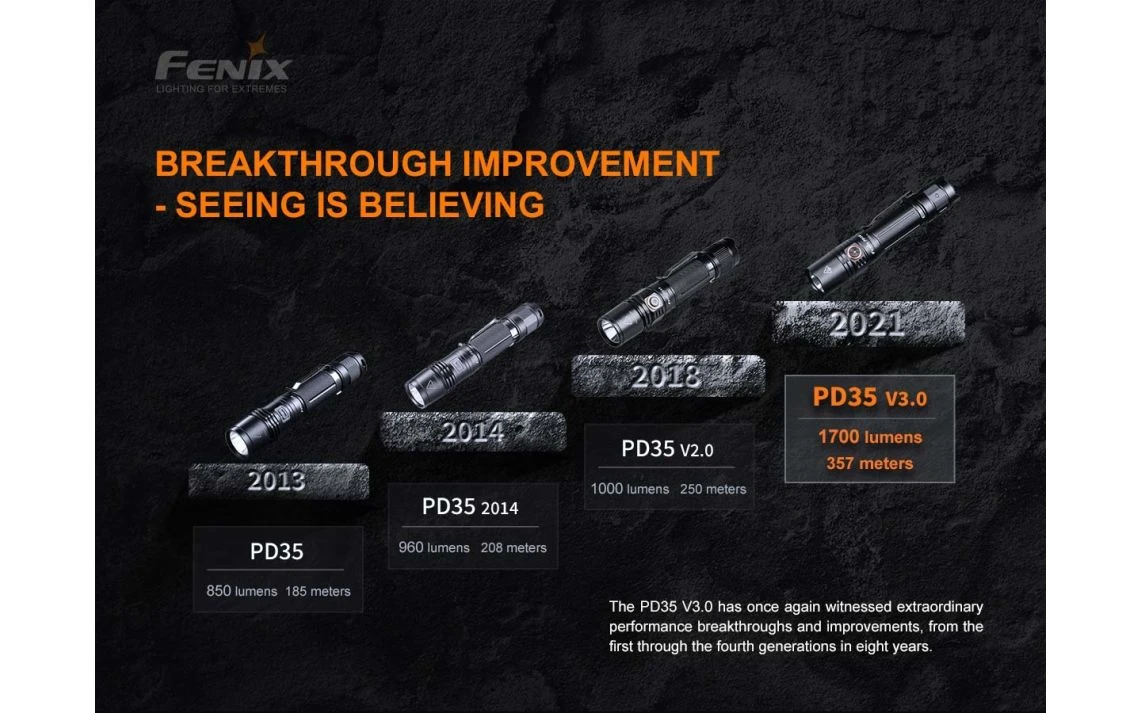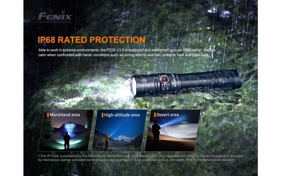 133.5g, 1,700 Lumens: The Fenix PD35 V3.0 is a versatile tactical torch with a powerful output of 1,700 lumens with a 357m beam distance. The PD35 3.0 utilises a Luminus SFT40 LED and offers 5 brightness levels and a strobe mode for a variety of situations. This torch runs off an 18650 Li-ion battery (included) which is directly rechargeable with a Micro USB charging cable. The tactical tail switch allows you to easily turn the torch on and the side switch allows you to cycle through the six output modes. The PD35 V3.0 is made of durable A6061-T6 aluminium, is 1m impact resistant and has an IP68 dust-proof and waterproof rating. This compact yet high output torch is ideal for security, tactical situations, camping and any outdoor or work activity. Micro USB rechargeable 2600mAh 18650 Li-ion battery included.