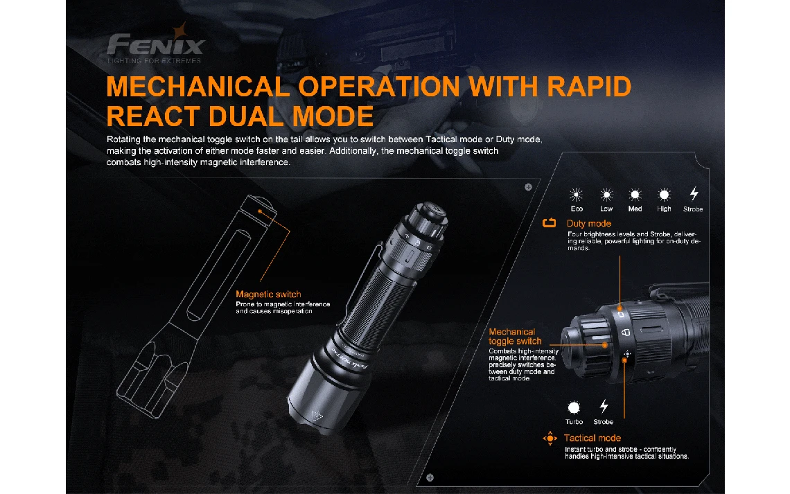 - Tactical and Duty modes for flexibly needed choice and operation.