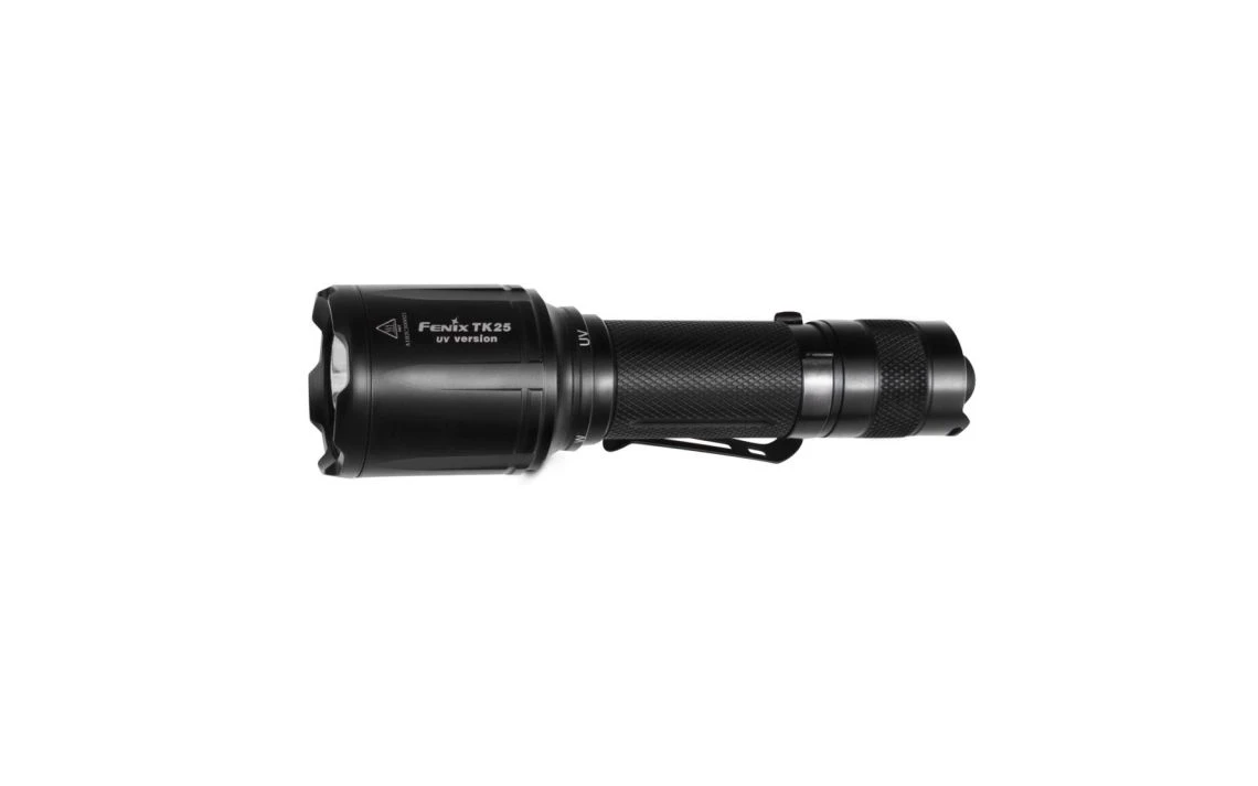 33.3g, 1000 Lumens : The Fenix TK25UV is a tactical dual LED torch which is equipped with white light and UV light. The UV light has output of 3000mW while the main white light can deliver a maximum output of 1000 lumens and beam distance of 225 metres. The torch is powered by 1 x 18650 Li-ion battery also compatible with CR123A. Dual UV and white light tactical torch.