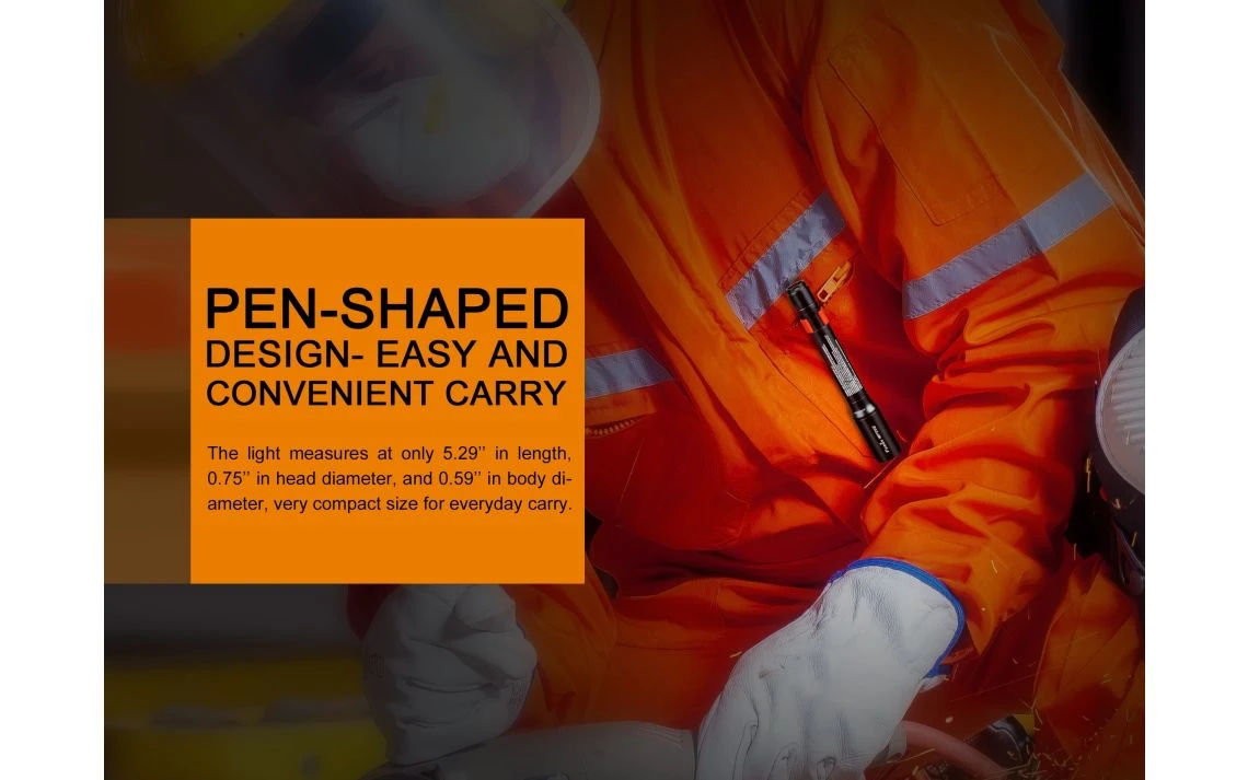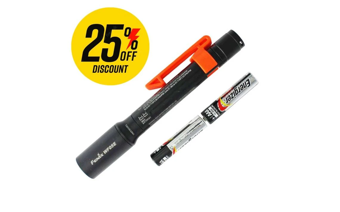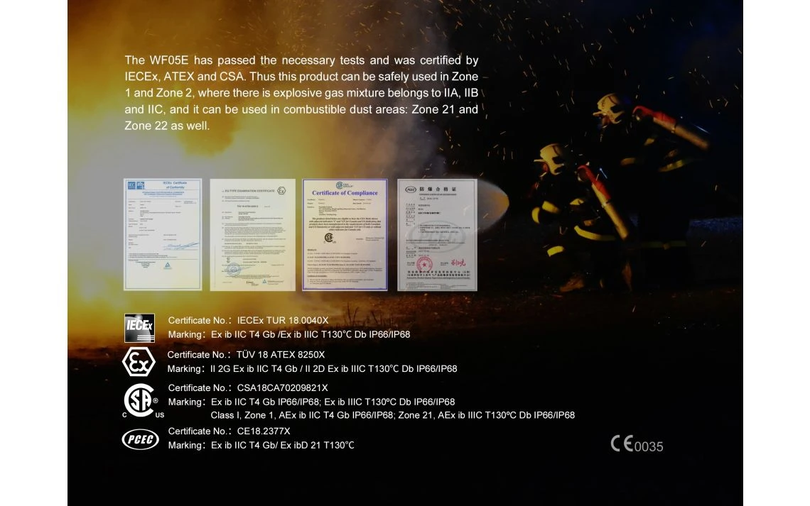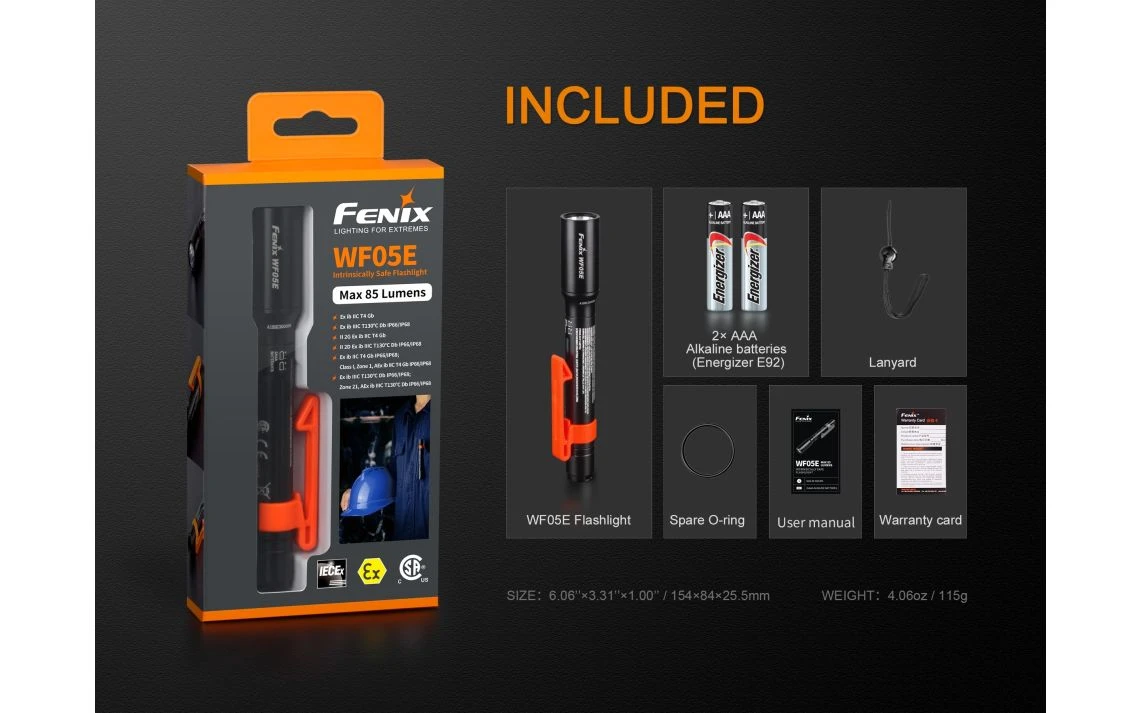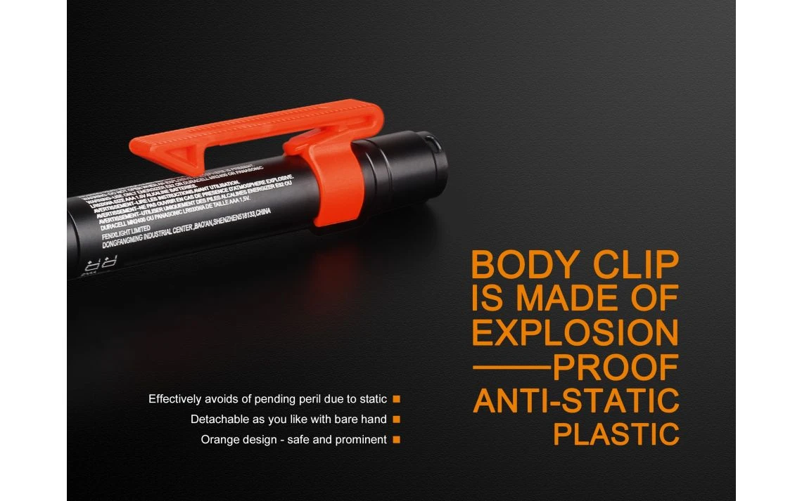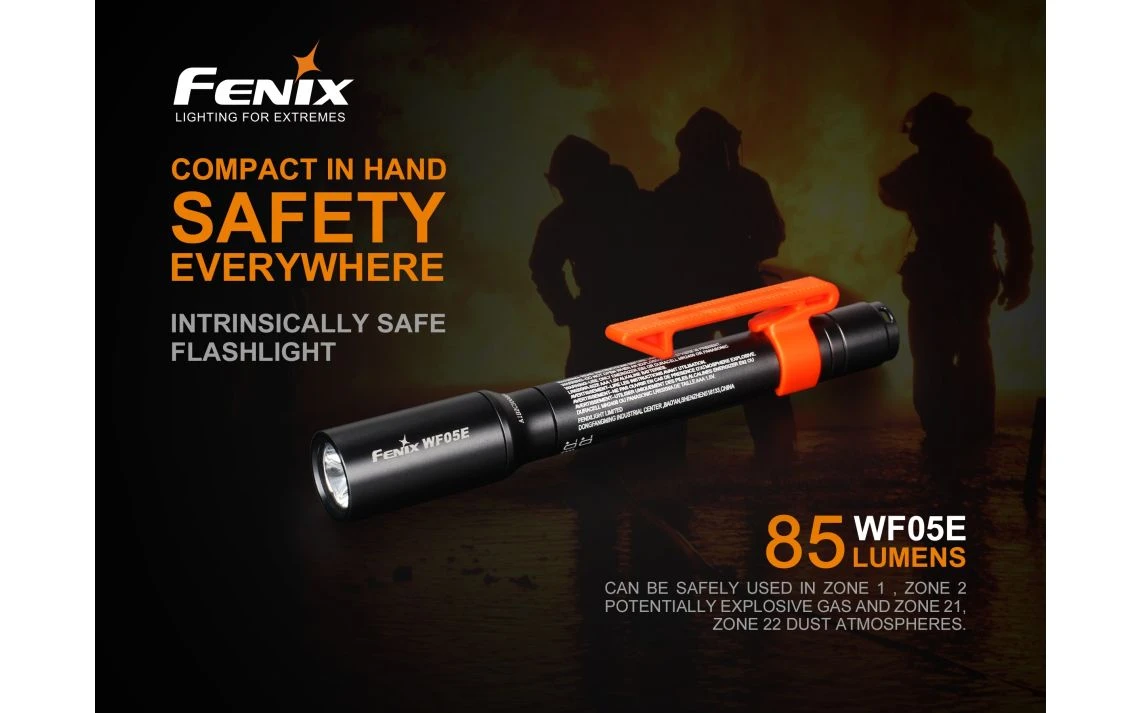 38g, 85 Lumens: The Fenix WF05E is an intrinsically safe pen-shaped design LED torch. It can used safely in Zone 1, Zone 2 and certified with IECEX, ATEX and CSA. It is made of durable oxidation-resistance aluminium. The torch has 3 output modes and runs on 2 x AAA batteries. Pen-shaped design 2 x AAA instrinsically safe LED torch!