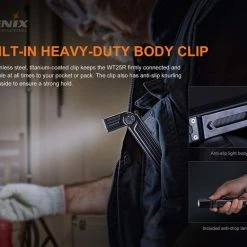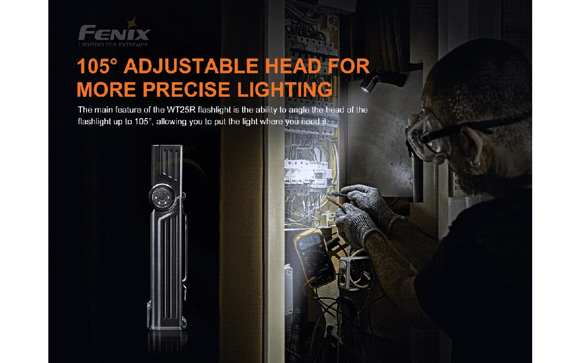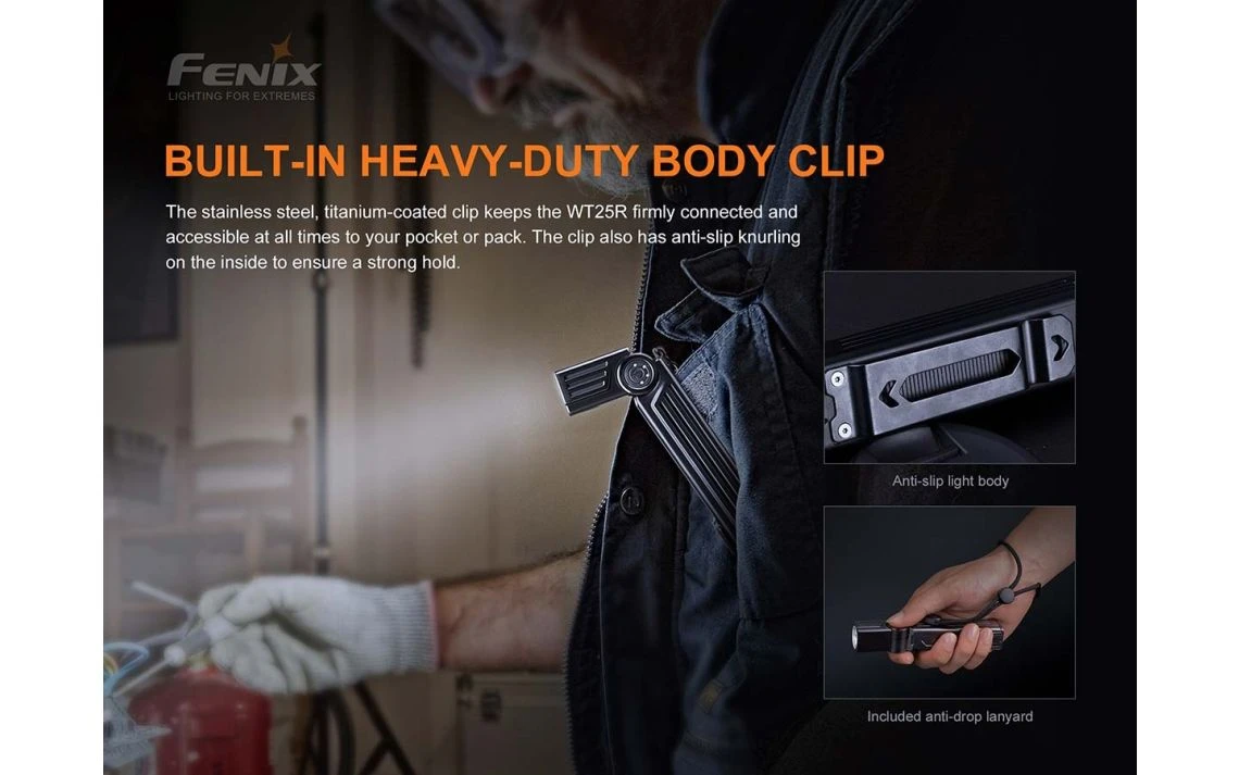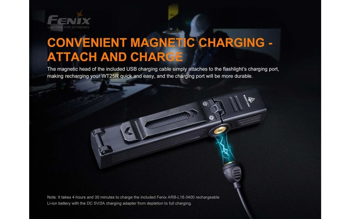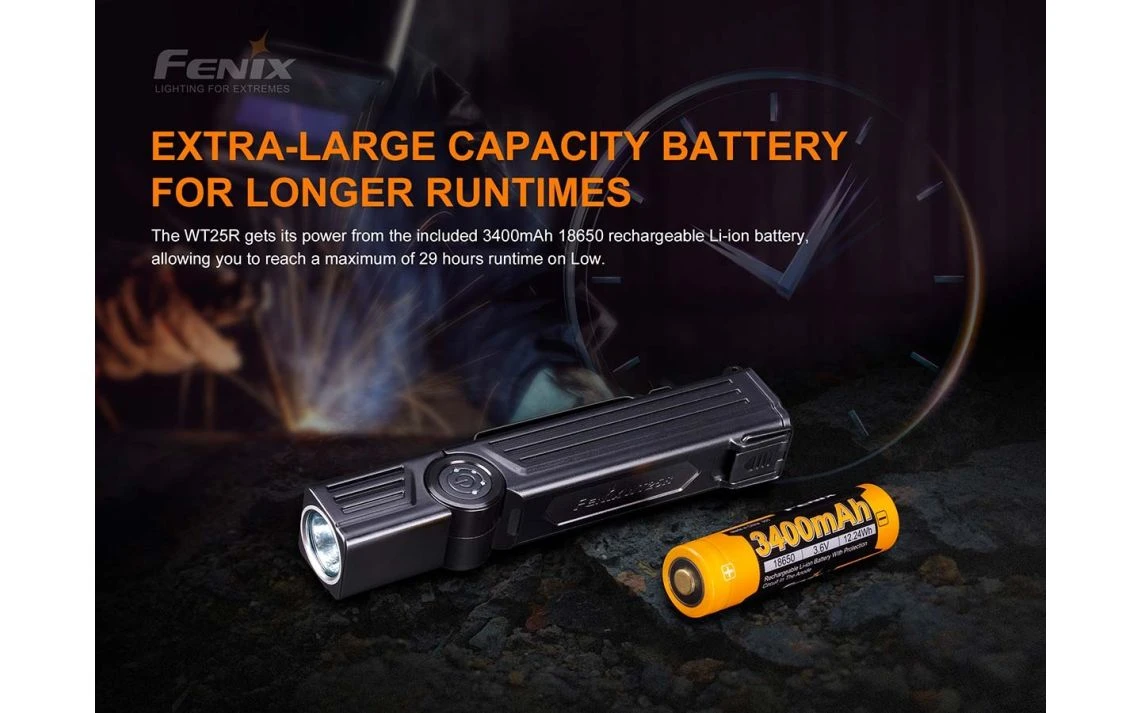 137g, 1,000 Lumens: The Fenix WT25R is a versatile torch with an adjustable head. The head of the torch is 105°adjustable so you can get the light in the exact place you need it. The built-in magnet of this light allows you to mount it to magnetic surfaces and use the light hands-free. The WT25R has four levels of brightness with a max output of 1,000 lumens as well as a strobe and SOS mode. This torch runs off a 3400mAh 18650 Li-ion battery (included) and can be recharged via the included USB magnetic charging cable. Other features of this torch include the easy to use switch, battery level indicator, built-in body clip, lock-out function, IP66 rain resistance and dustproof rating. This is a great multipurpose light suitable for work, camping and more. 3400mAh 18650 Li-ion rechargeable battery included.