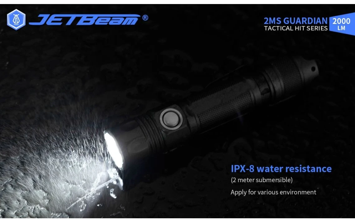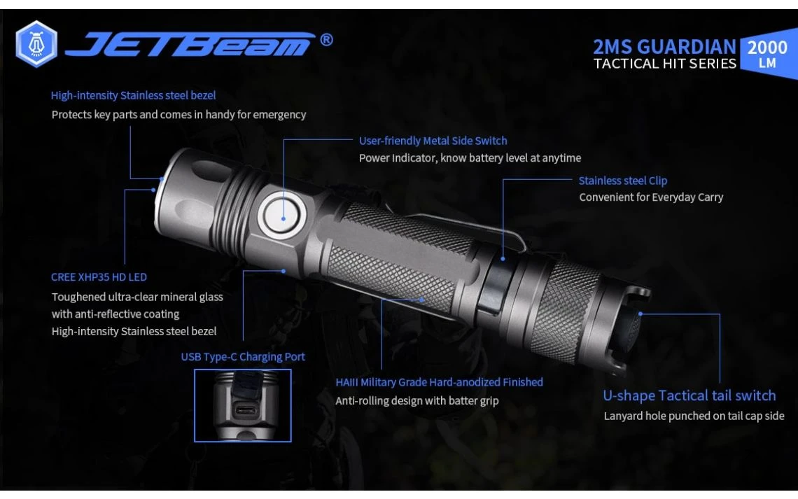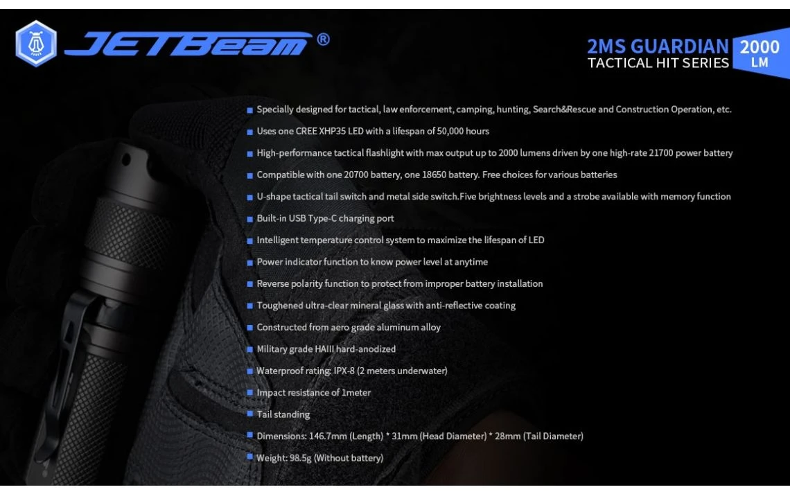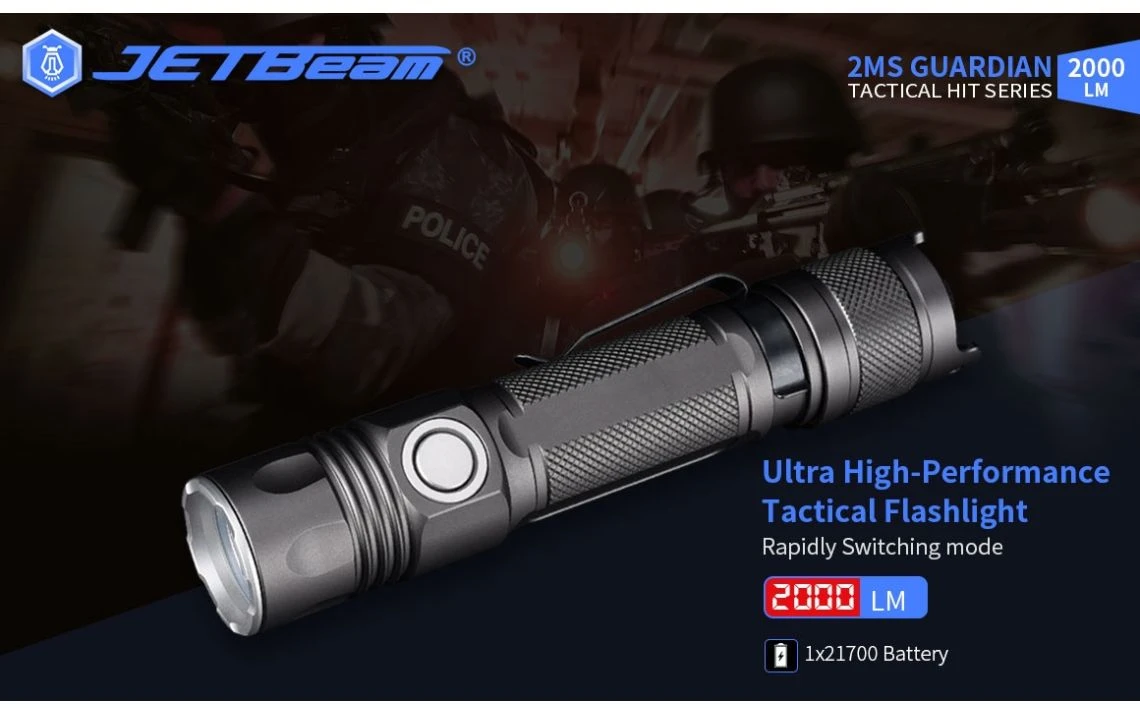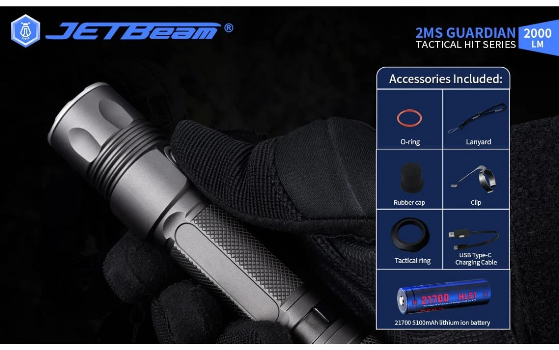 170.5g, 2,000 Lumens: The JETBeam 2MS guardian is a powerful tactical torch with a max output of 2,000 lumens and a 285m beam distance. It utilises a CREE XHP35 LED and offers 5 brightness levels plus a strobe mode. The 2MS runs off a 5,100mAh 21700 Li-ion battery (included) and features a USB-C port for fast charging. The 2MS features a tactical tail switch as well as a side switch to access the variety of modes. Other features of this torch include the power indicator, memory function, intelligent temperature control, over discharge protection, stainless steel bezel and a stainless steel pocket clip. This is a compact yet powerful torch which is ideal for law enforcement, security, construction as well as camping and outdoor activities. 5100mAh 21700 Li-ion battery included.