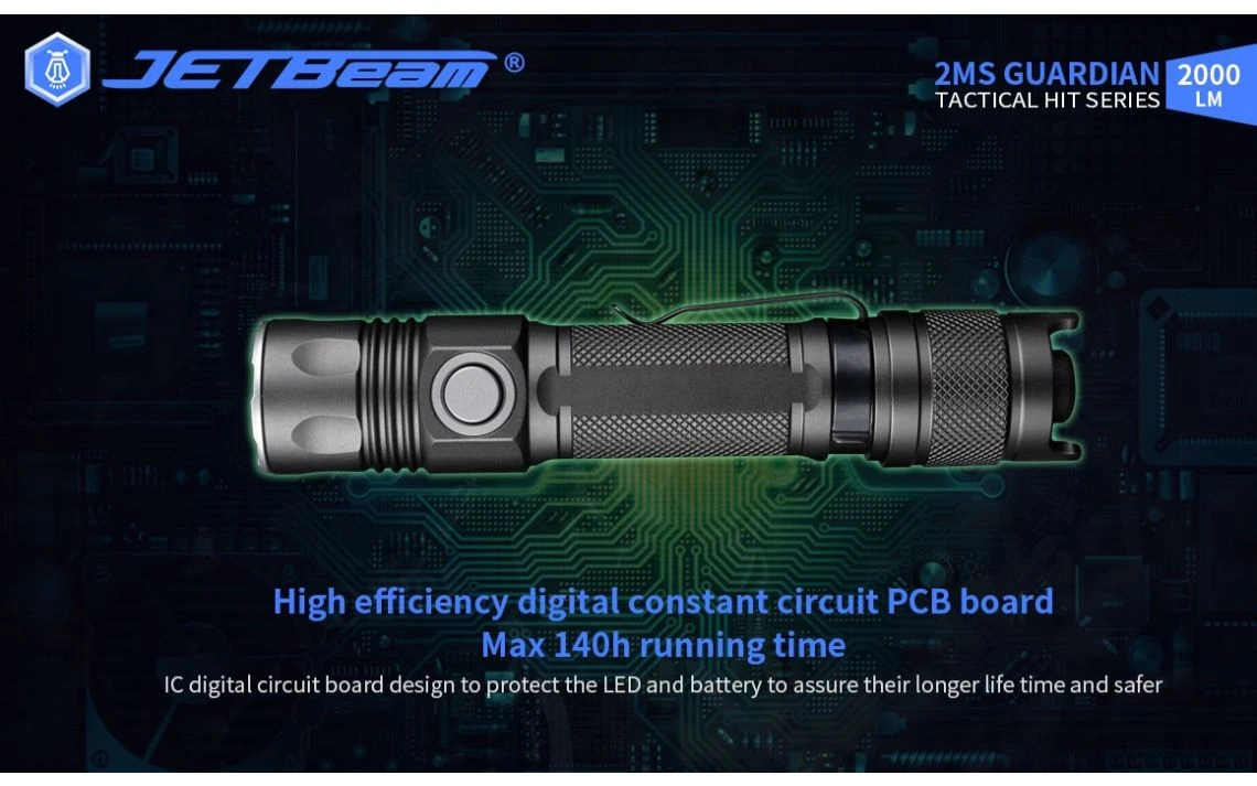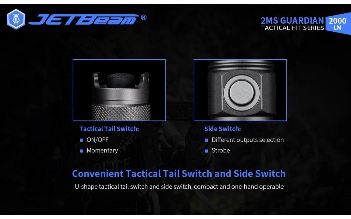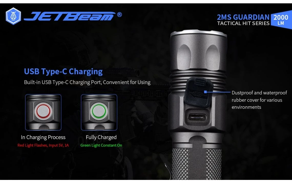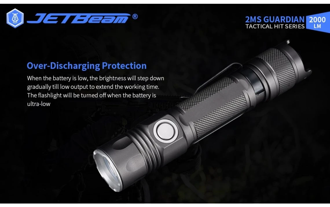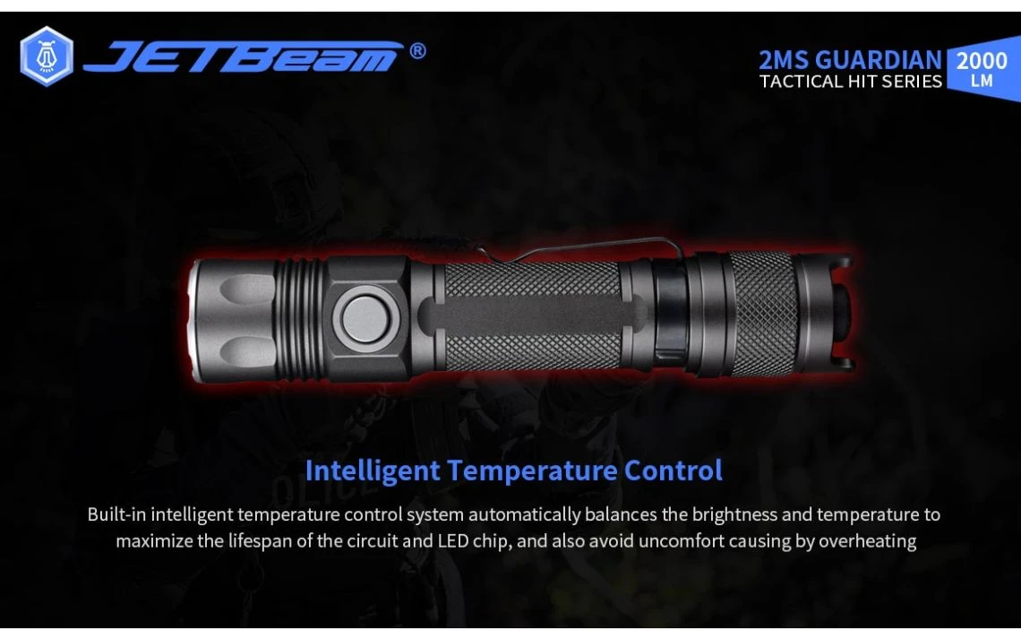 170.5g, 2,000 Lumens: The JETBeam 2MS guardian is a powerful tactical torch with a max output of 2,000 lumens and a 285m beam distance. It utilises a CREE XHP35 LED and offers 5 brightness levels plus a strobe mode. The 2MS runs off a 5,100mAh 21700 Li-ion battery (included) and features a USB-C port for fast charging. The 2MS features a tactical tail switch as well as a side switch to access the variety of modes. Other features of this torch include the power indicator, memory function, intelligent temperature control, over discharge protection, stainless steel bezel and a stainless steel pocket clip. This is a compact yet powerful torch which is ideal for law enforcement, security, construction as well as camping and outdoor activities. 5100mAh 21700 Li-ion battery included.