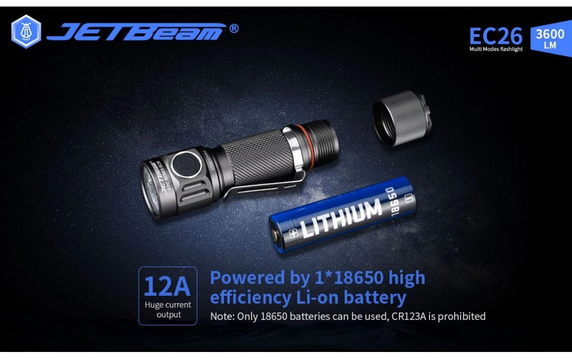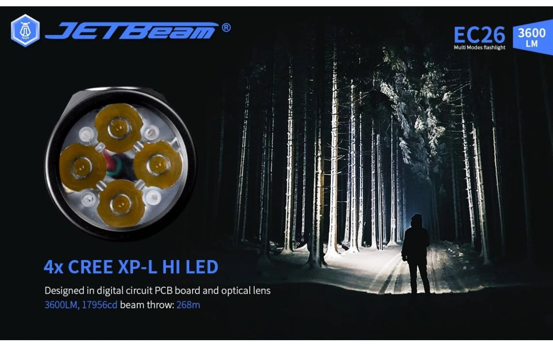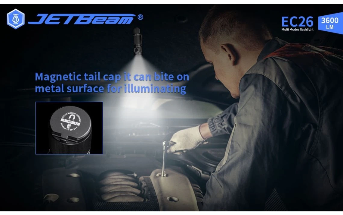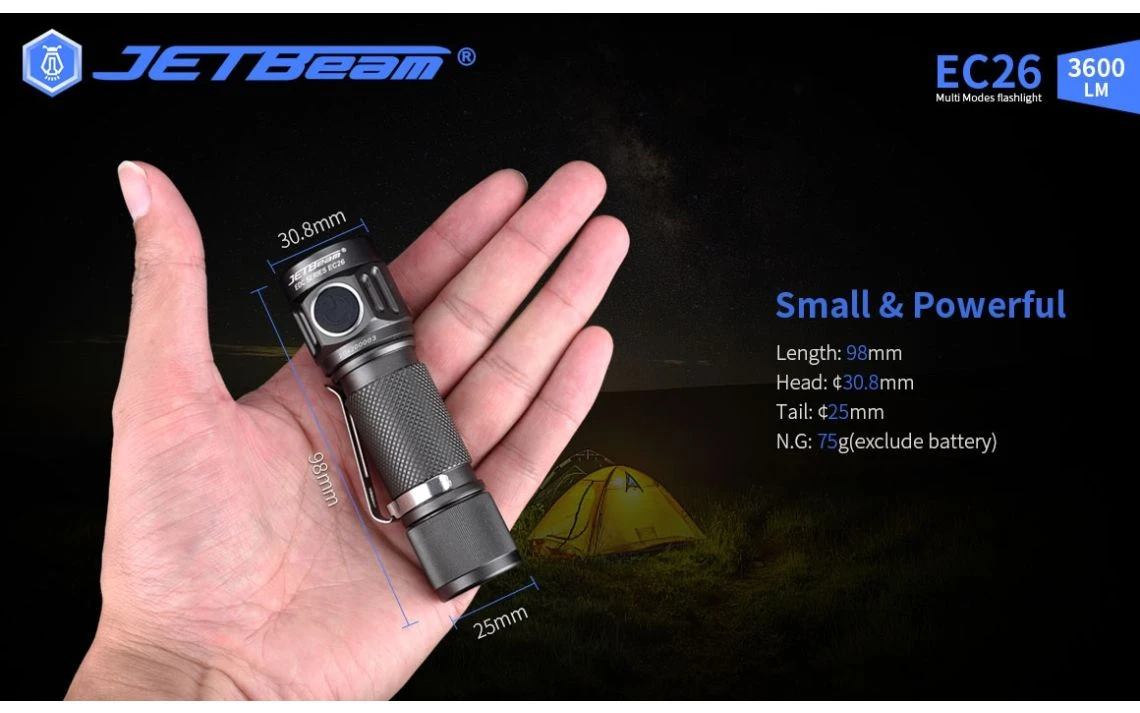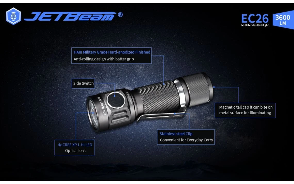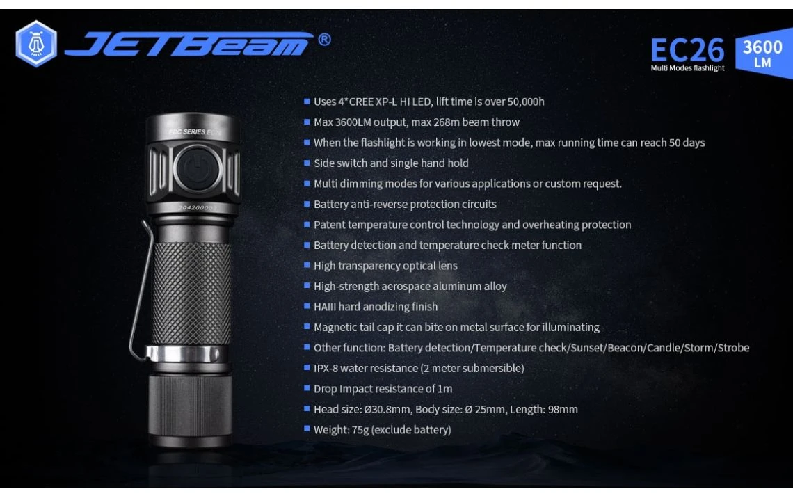 75g, 3,600 Lumens: The JETBeam EC26 is a compact EDC torch that offers a variety of rich light output modes and stepless dimming. The EC26 uses 4 x CREE XP-L HI LEDs to produce a max output of 3,600 lumens and a 268m beam distance. This torch is lightweight and compact in size plus its one switch control makes it easy for one hand operation. The EC26 runs off a high discharge 12A 18650 Li-ion battery however it is not rechargeable within the torch. See related products for recommended battery chargers. You can use the EC26 in a variety of modes including stepless dimming, instant tactical mode, traditional step dimming, lock status and more, which are all explained in the manual. The EC26 also has a magnetic tail cap for mounting to magnetic surfaces for hands free use. Stepless dimming and multiple user modes available.