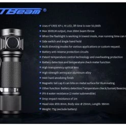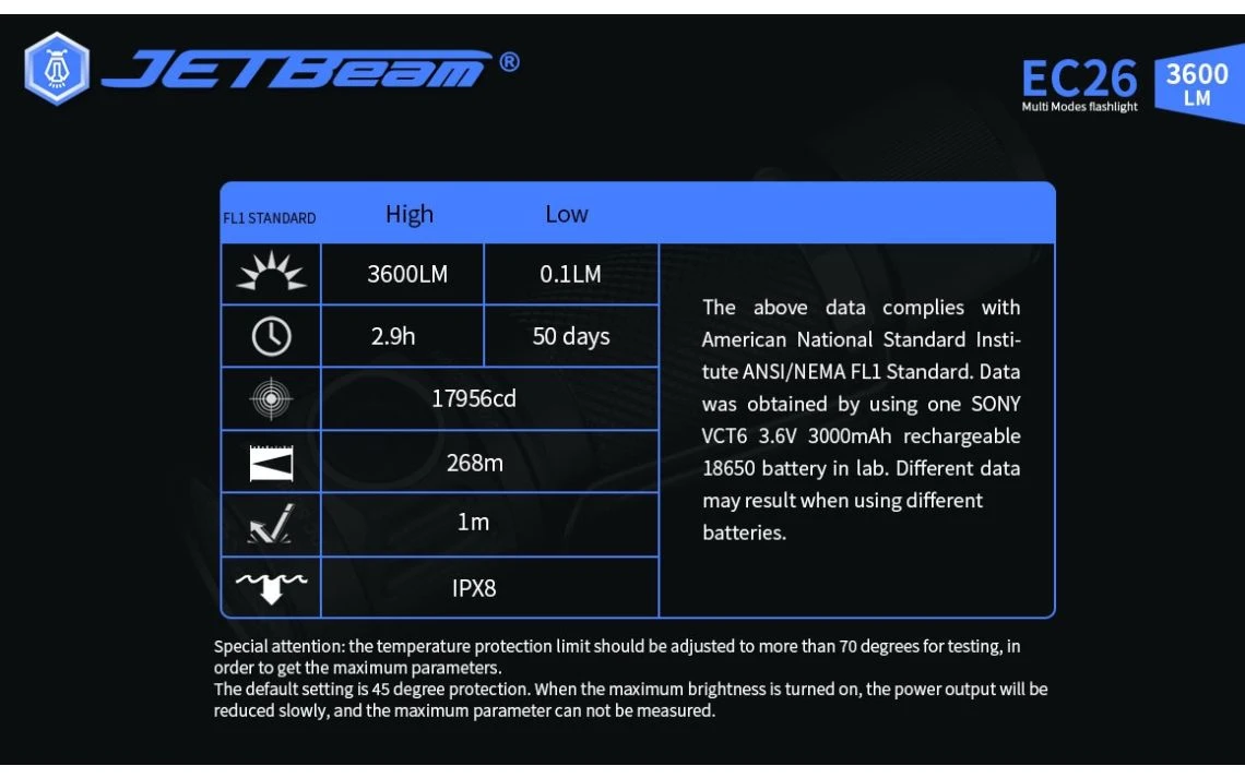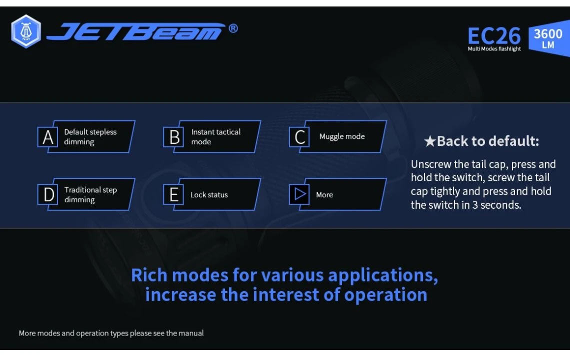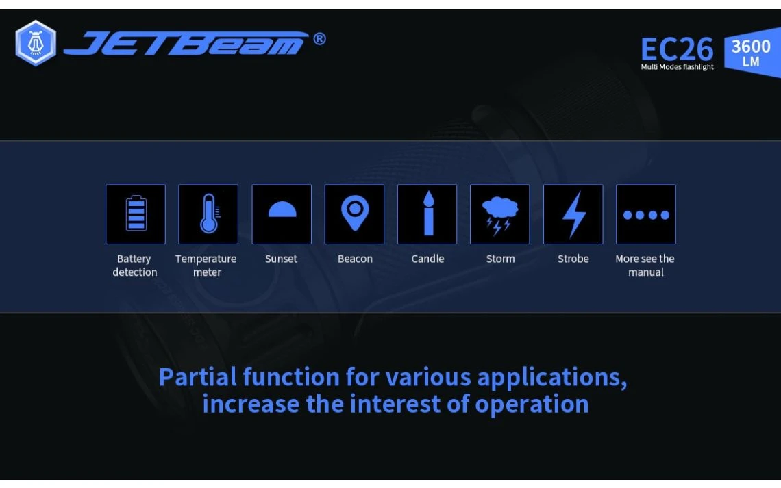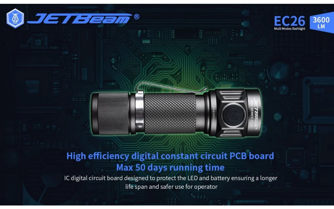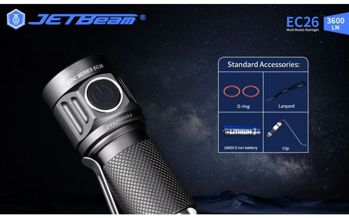 75g, 3,600 Lumens: The JETBeam EC26 is a compact EDC torch that offers a variety of rich light output modes and stepless dimming. The EC26 uses 4 x CREE XP-L HI LEDs to produce a max output of 3,600 lumens and a 268m beam distance. This torch is lightweight and compact in size plus its one switch control makes it easy for one hand operation. The EC26 runs off a high discharge 12A 18650 Li-ion battery however it is not rechargeable within the torch. See related products for recommended battery chargers. You can use the EC26 in a variety of modes including stepless dimming, instant tactical mode, traditional step dimming, lock status and more, which are all explained in the manual. The EC26 also has a magnetic tail cap for mounting to magnetic surfaces for hands free use. Stepless dimming and multiple user modes available.