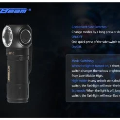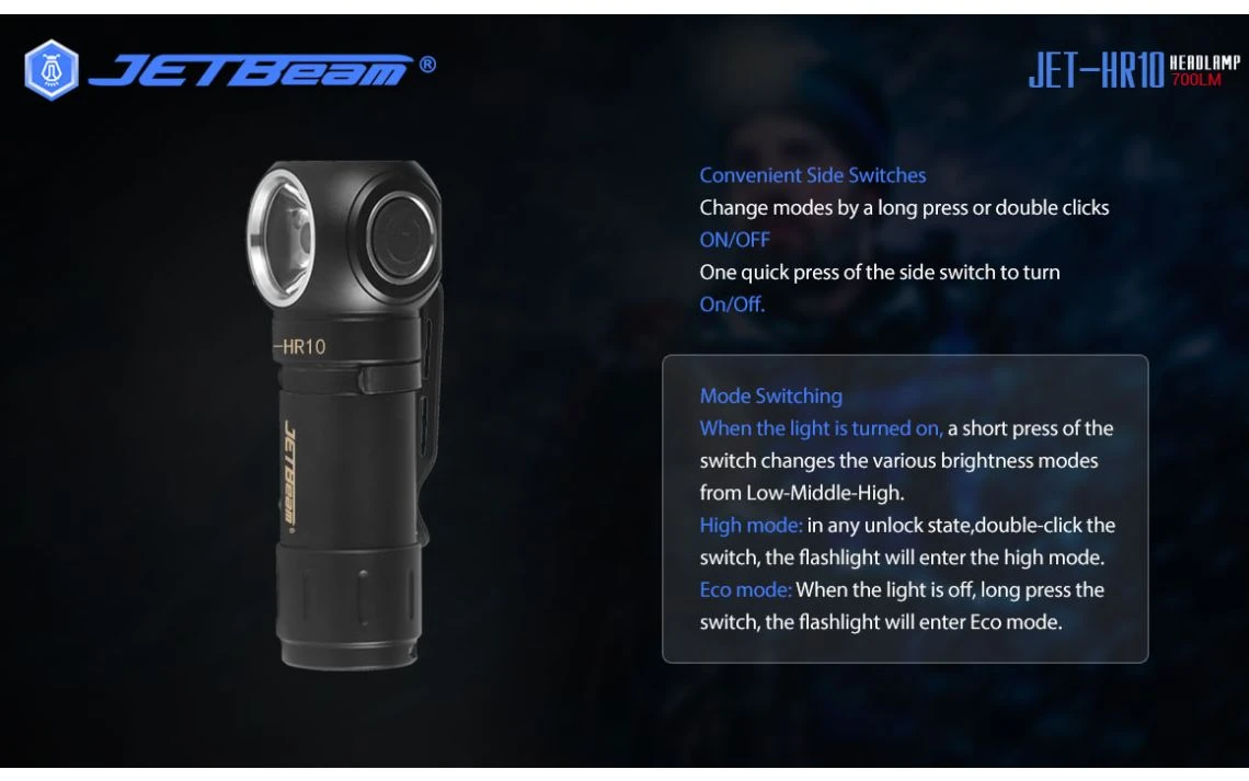 46.80g, 700 Lumens: The JETBeam HR10 is rechargeable right angle light and headlamp. It uses one CREE XP-L HD LED and has a maximum output of 700 lumen with a peak beam distance of 150 metres of throw. Powered by one 18350 battery and can be charged with USB-C cable. The JETBeam HR10 headlamp features an intelligent temperature control system to maximise the lifespan, and will automatically dim while on high mode to prevent overheating. The compact and ergonomic design makes the HR10 the perfect EDC torch and headlamp. USB-C Rechargeable right-angle light and headlamp!