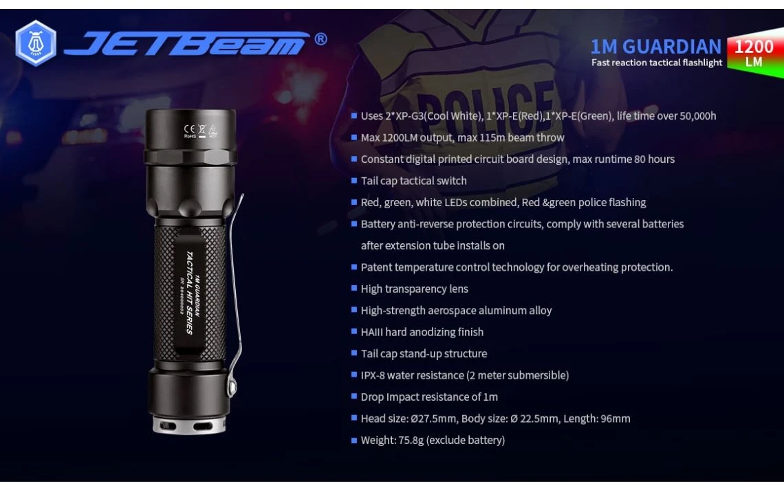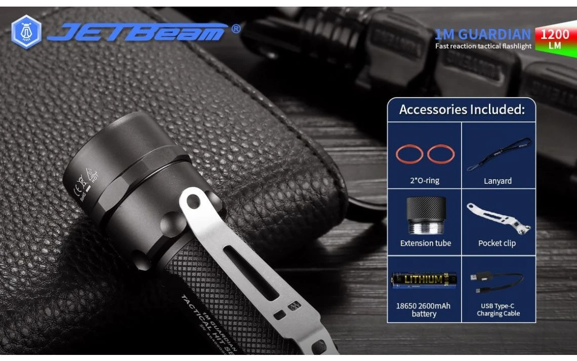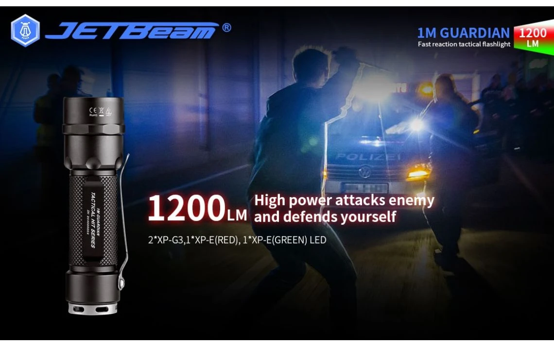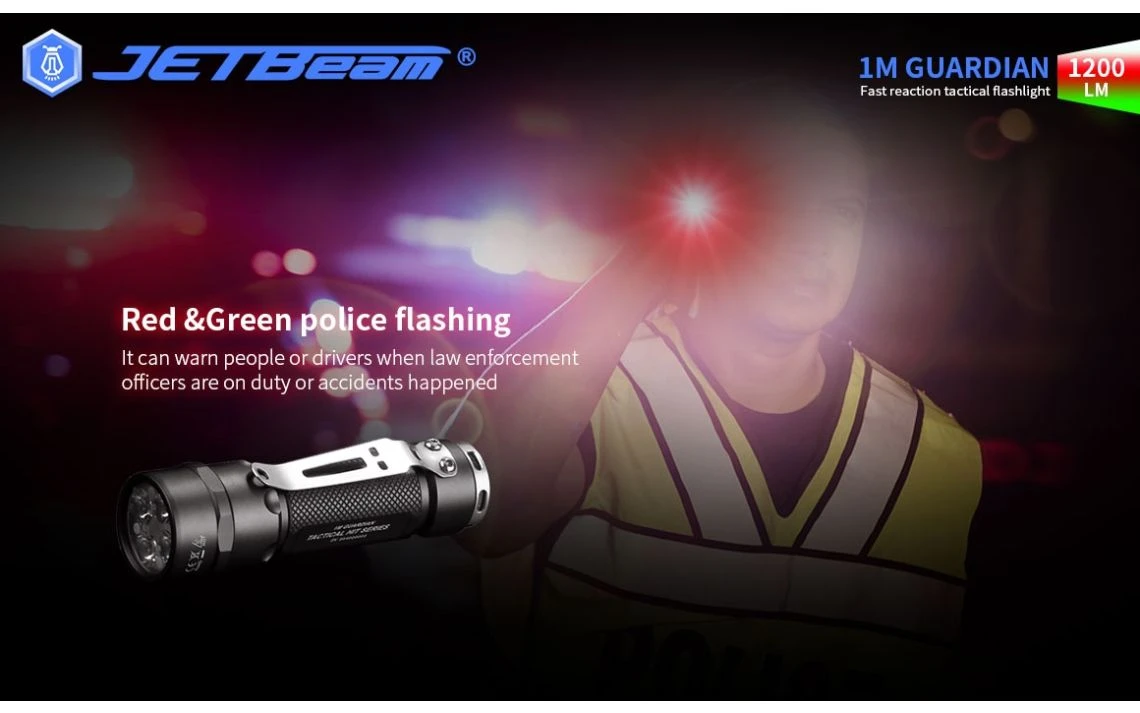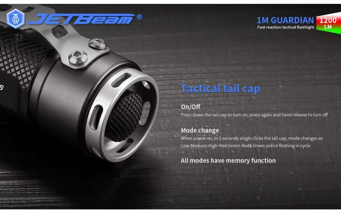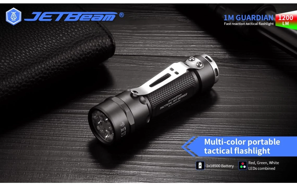 125.8g, 1,200 Lumens: The JETBeam JET-1M Guardian is a compact tactical torch that offers white, red and green output from its 4 LEDS. With the 2 x white LEDs the JET-1M produces a max output of 1,200 lumens and a 115m beam distance. The red and green LEDs can be used as a standard output or a red and green flashing mode. The tactical tail cap allows you to easily control the torch and features memory function. The JET-1M comes with a Micro USB rechargeable 18650 battery and extension tube but can also be used with an 18500 battery or 2 x 16340 or CR123A batteries. This torch is compact in size which makes it ideal for an everyday carry and the pocket clip and lanyard give you more versatility. 2600mAh 18650 Li-ion battery included. For higher capacity batteries see the related products.