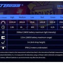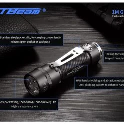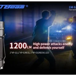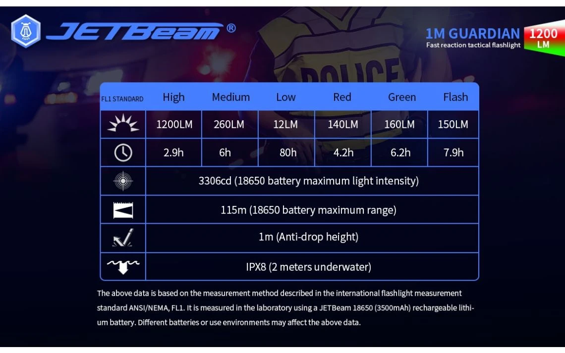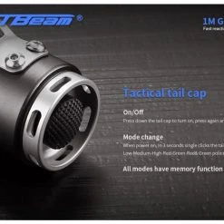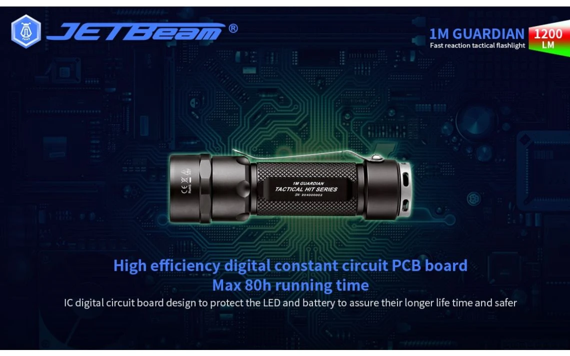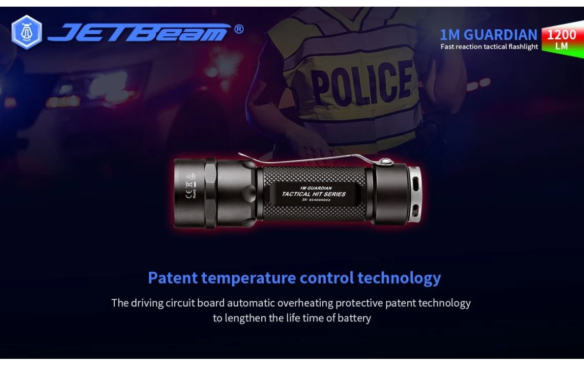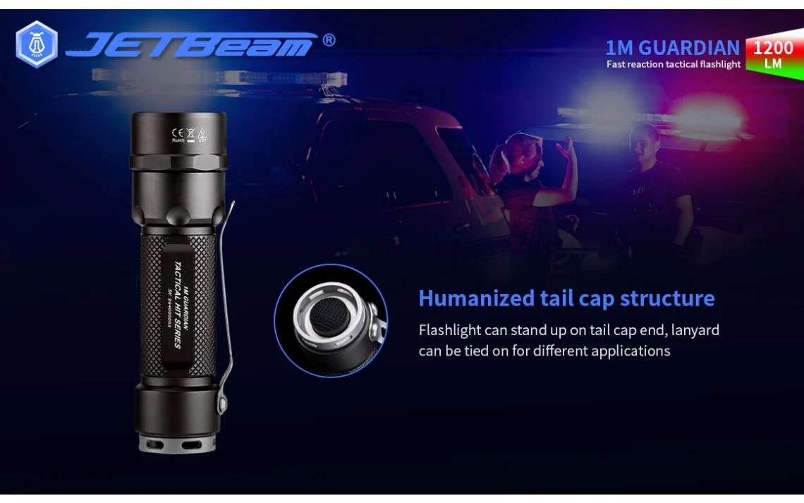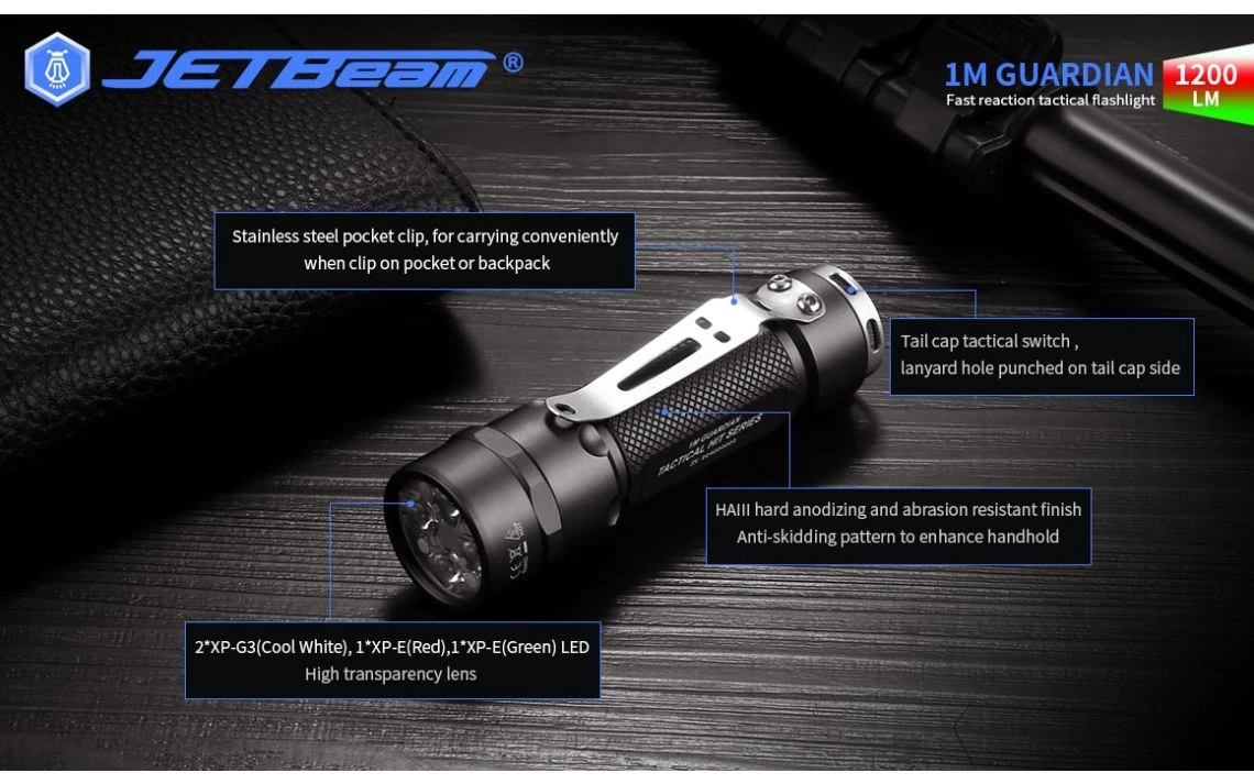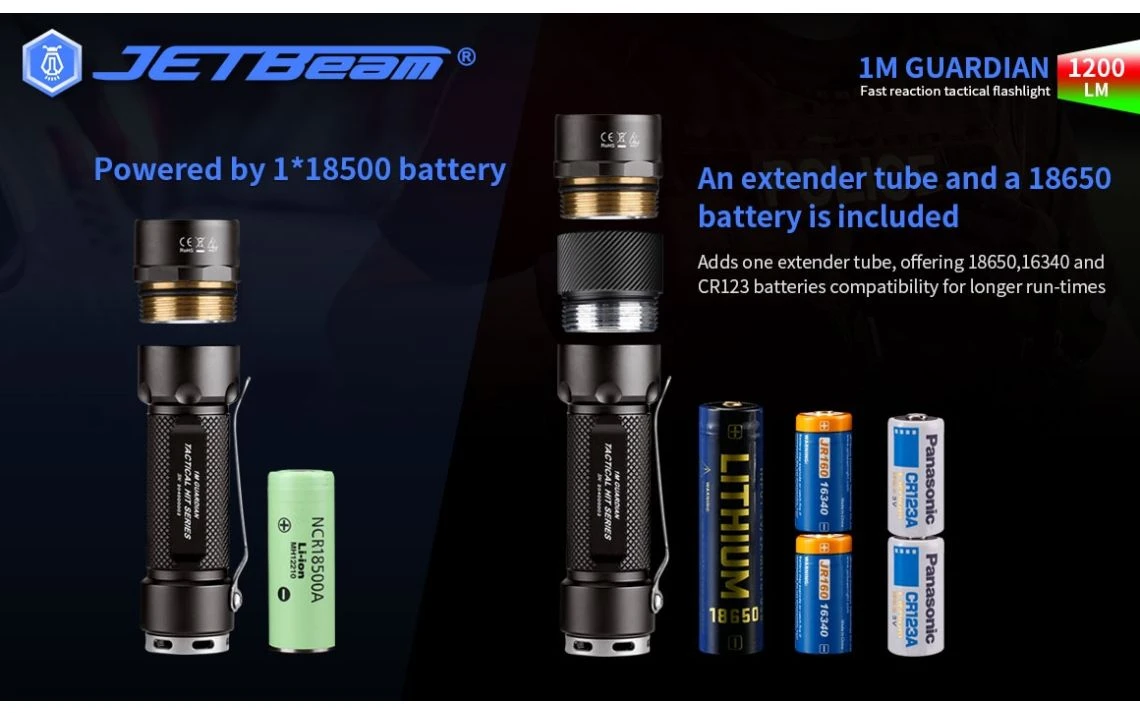 125.8g, 1,200 Lumens: The JETBeam JET-1M Guardian is a compact tactical torch that offers white, red and green output from its 4 LEDS. With the 2 x white LEDs the JET-1M produces a max output of 1,200 lumens and a 115m beam distance. The red and green LEDs can be used as a standard output or a red and green flashing mode. The tactical tail cap allows you to easily control the torch and features memory function. The JET-1M comes with a Micro USB rechargeable 18650 battery and extension tube but can also be used with an 18500 battery or 2 x 16340 or CR123A batteries. This torch is compact in size which makes it ideal for an everyday carry and the pocket clip and lanyard give you more versatility. 2600mAh 18650 Li-ion battery included. For higher capacity batteries see the related products.