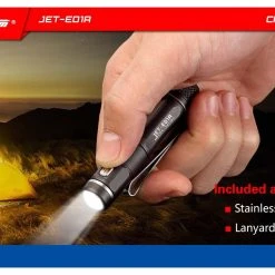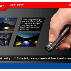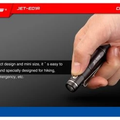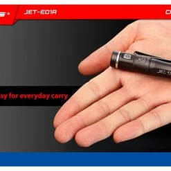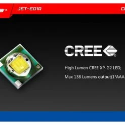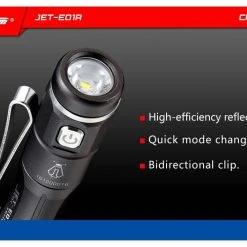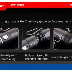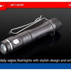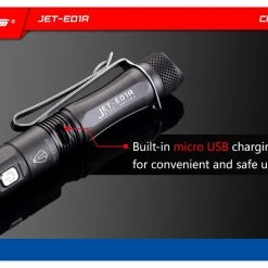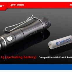 34.2g, 138 Lumens: The JETBeam JET-E01R is a mini everyday carry torch with a max output of 138 lumens. It utilises a Cree XP-G2 LED and offers 3 brightness levels. The JET-E01R runs off a AAA battery and can be charged via the micro USB charging port (battery sold separately). This torch features a pocket clip as well as a convenient lanyard hole for various carrying options. Other features of the JET-E01R include its high efficiency reflective lens, side switch, titanium ring, IPX-8 waterproof rating and HA III military grade surface treatment. Pocket size everyday carry torch.