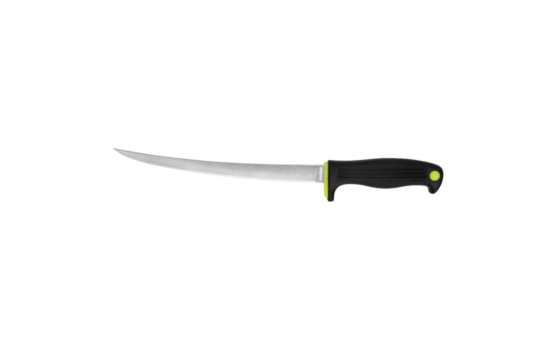 For the ones that didn’t get away. The blade is made of Japanese 420J2 stainless steel with just the right degree of flex to make the job of filleting simple. Neon highlights in the handle make it easy to spot the knife in a marine environment. The co-polymer handle material provides an excellent grip and its soft-yet-firm texture makes the job of filleting even a large catch less fatiguing.
