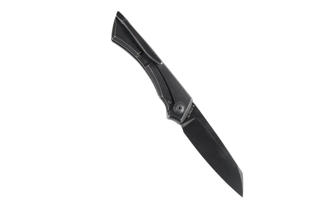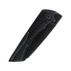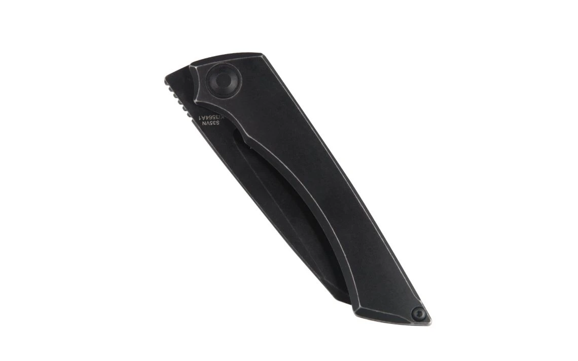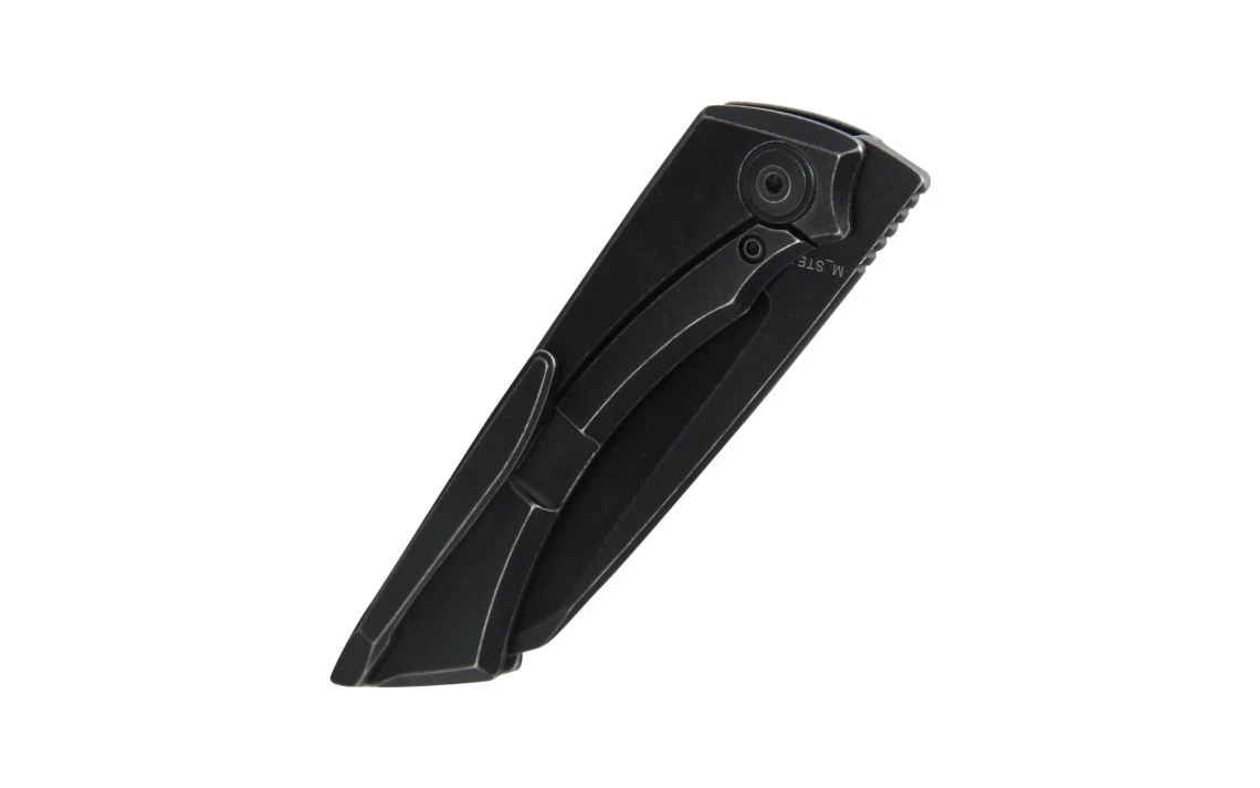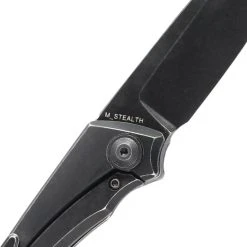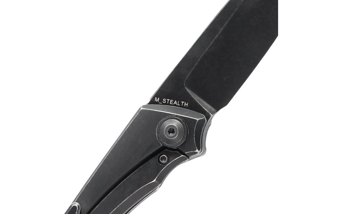 This front flipper M_Stealth knife is a Joel Scott-Turner design from Vitesse Design. Joel Scott-Turner completes this new knife with aesthetically pleasing features and great EDC functionality. The knife is sleek and classy with a black stonewash handle and wharncliffe blade that is versatile and all-around a fantastic shape. The blade steel is CPM-S35VN with a black stonewash finish. The titanium handle tapers in and out following a smooth curve that’s formed into the shape of the hand.