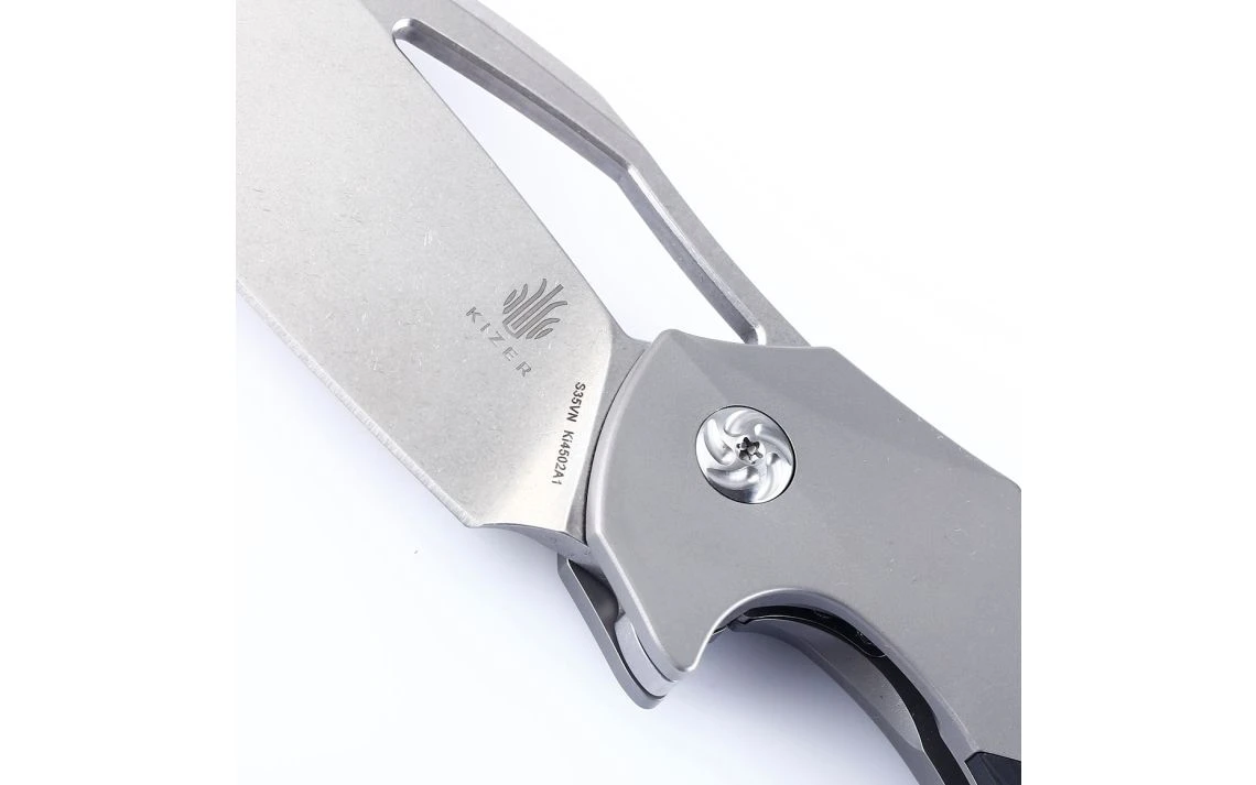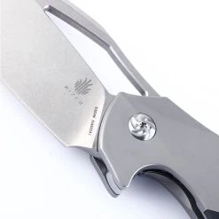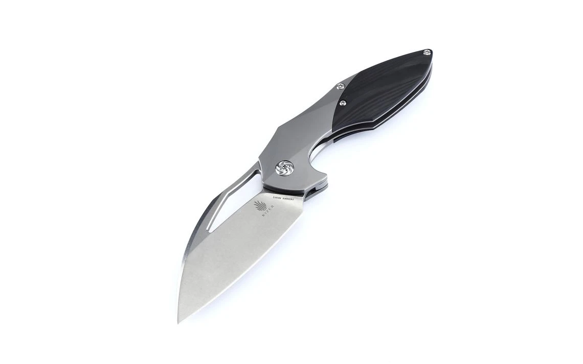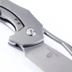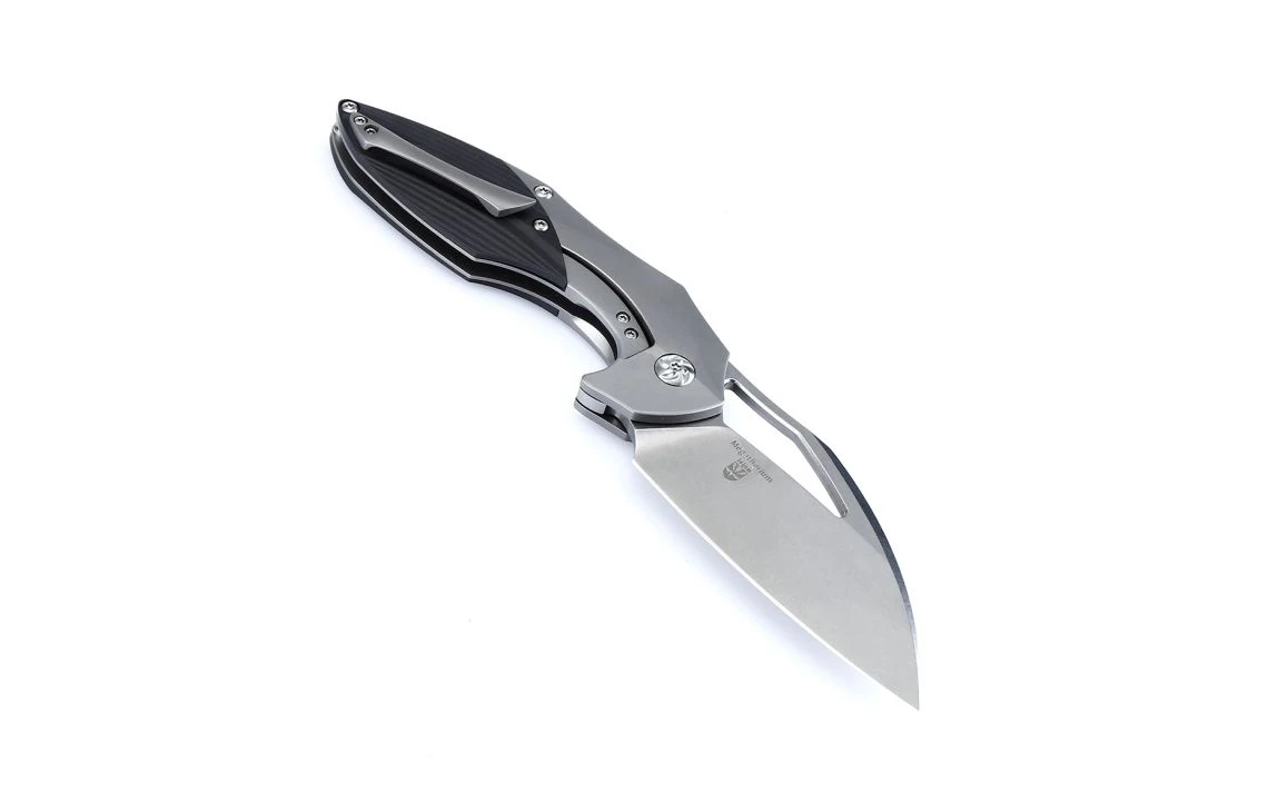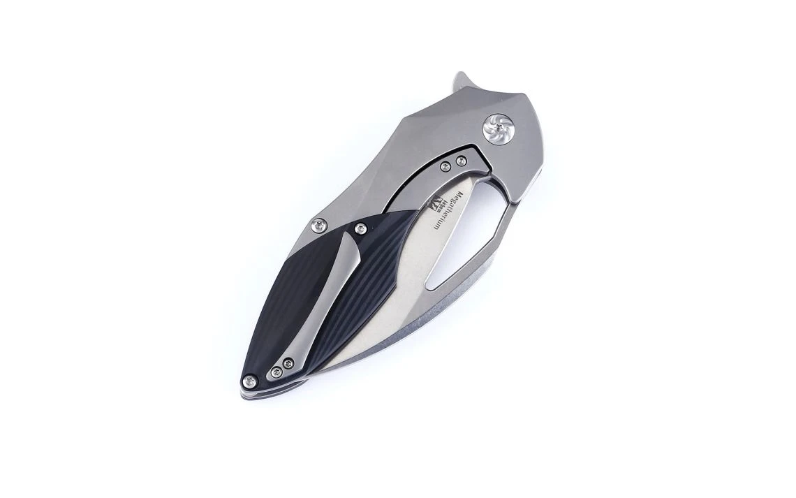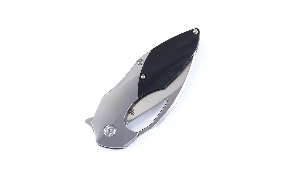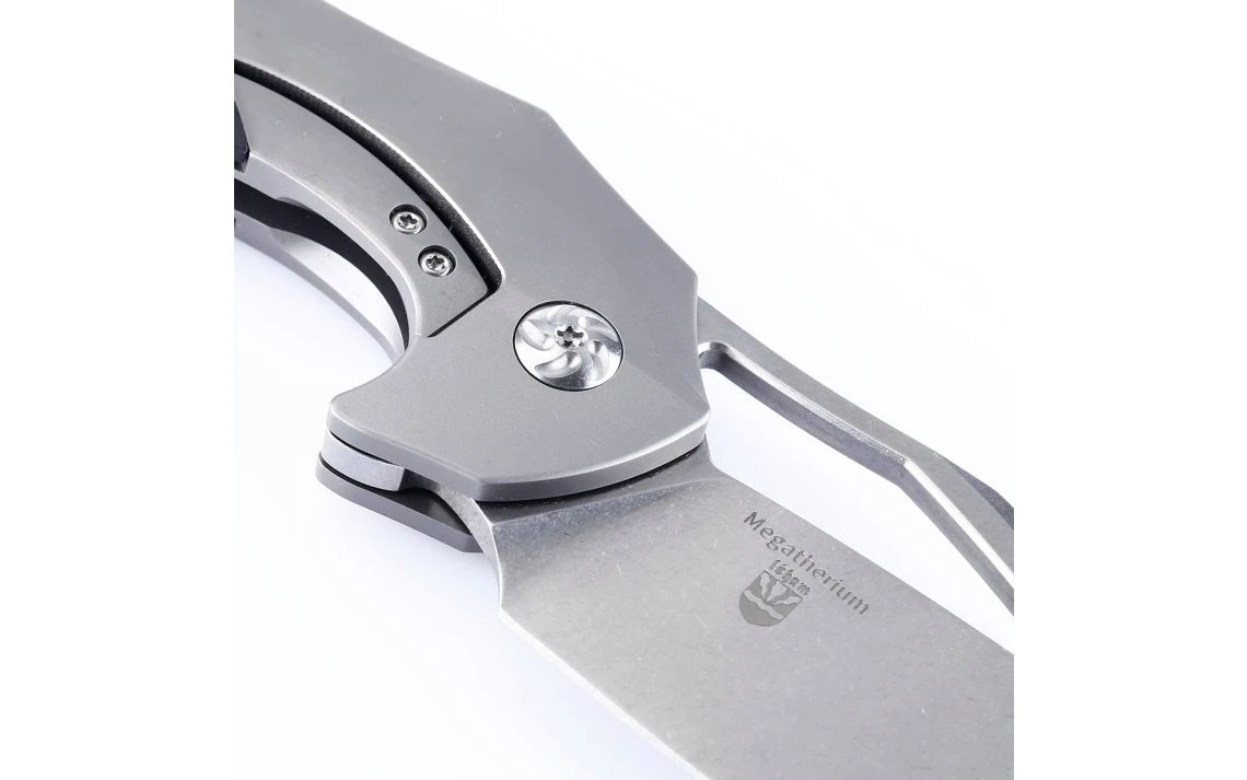 A folding Santoku for the outdoor chef, the Megatherium is a showcase of the “edge below tab” flipper system of Isham’s design. Its wide blade excels at tasks requiring a firm slicing motion, the psuedo-choil allows for a close choke-up for delicate tasks and the flipper becomes hidden when the knife is opened for unobstructed optimal performance.
