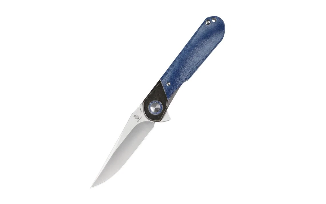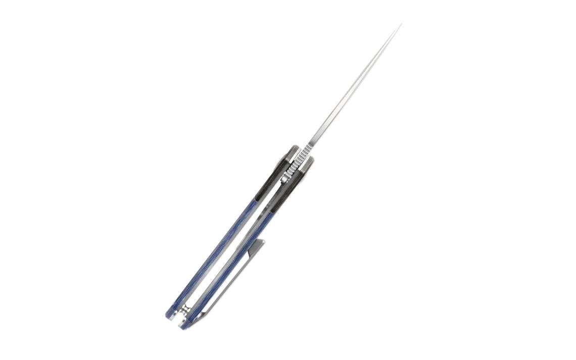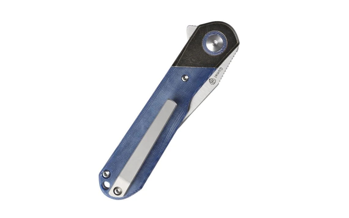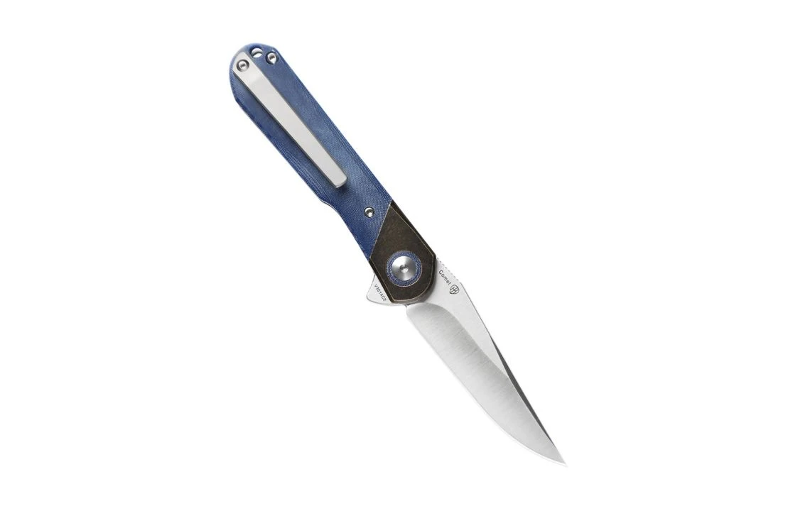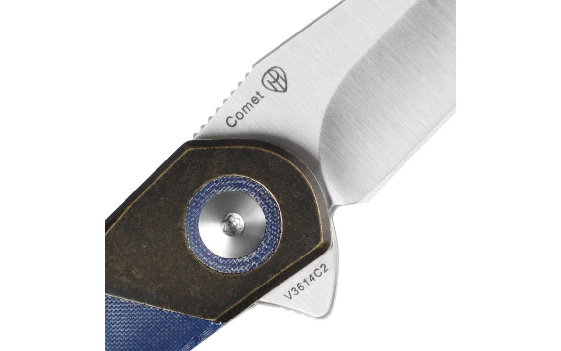 This Vanguard series Comet flipper is a Paul Munko designed folding knife. The build on this production model is superb, offering great fit and excellent action. The Vanguard Comet has a full-flat ground Crucible 154CM steel blade. It’s set on a ball-bearing pivot, which offers phenomenal action. This model sports a blue micarta handle with brass, and the tip-up carry clip accommodates EDC duty.
