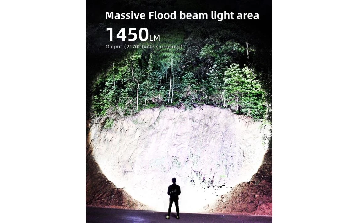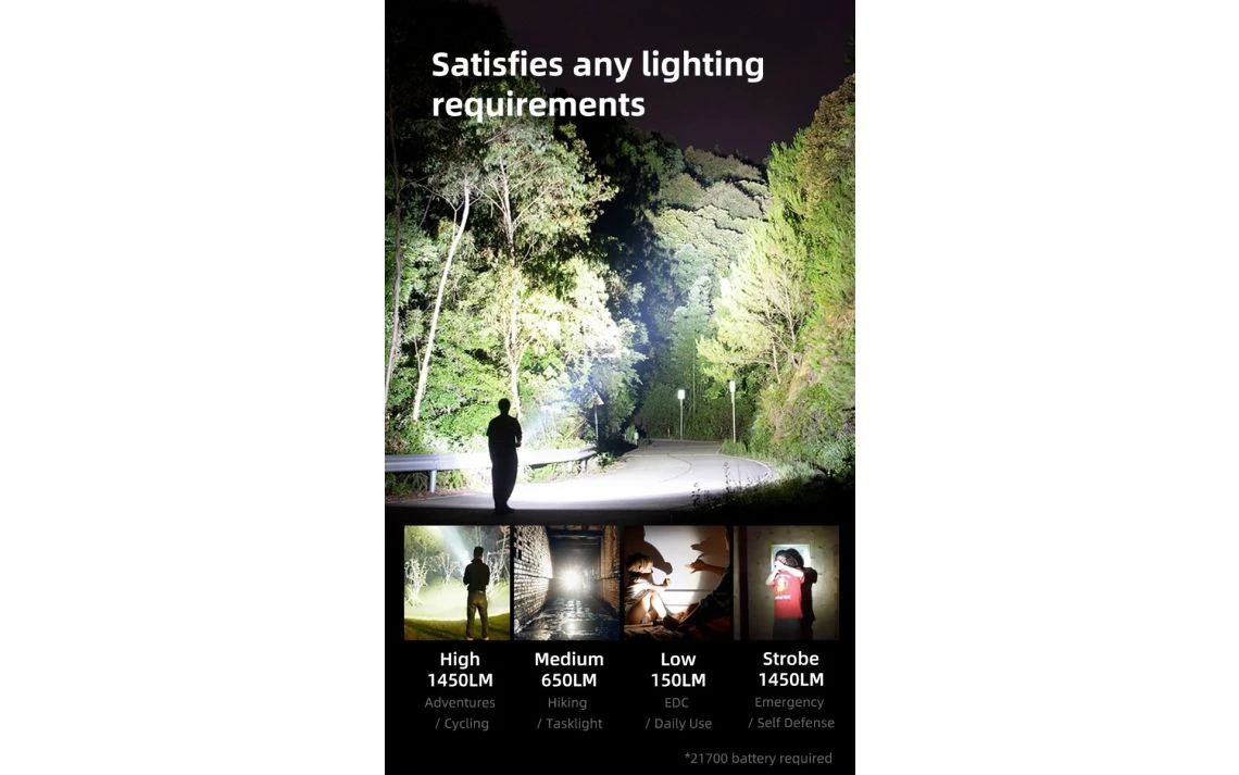 - Compatible with either, 1x 21700 (included), 1x 18650, or 3AAA