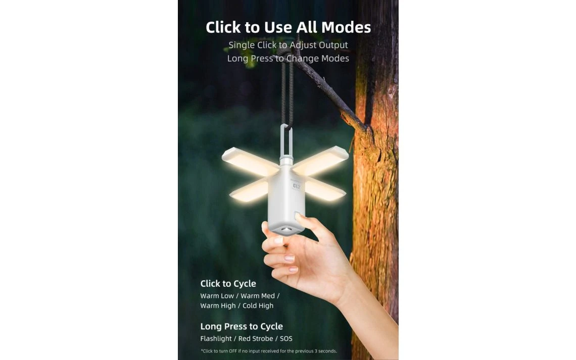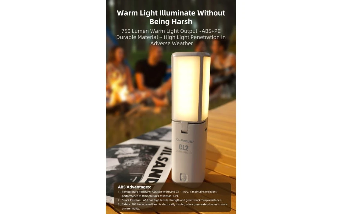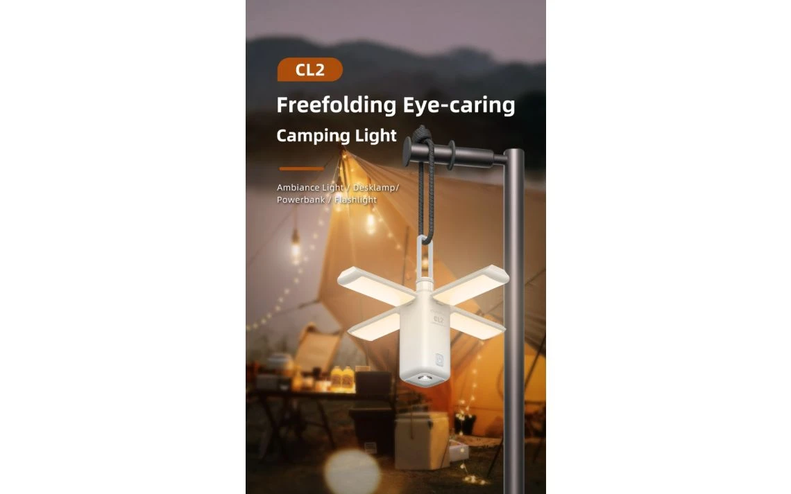 420 g, 750 Lumens: The Klarus CL2 is equipped with outputs and features that make it one versatile light! With a distinct, free-folding design, the CL2 can be used as a lantern or torch, for portable EDC use or area light. Use it as a desk lamp, in your backyard, or take it with you on a camping trip for ideal campsite lighting or trail navigation. CL2 has a max 750-lumen output, with both cool and warm white output options that light up your backyard! Flashlight mode has 100 lumens with an 83-meter throw, for reliable illumination in the palm of your hand. SOS and red flashing modes offer optimal signalling or help in emergency situations. The CL2 has an integrated battery pack, for power that doesn’t have to be replaced. Easily recharge via USB-C, for fast, reliable energy that gets you right back outside. The lantern also functions as a power bank, to keep your favourite devices powered on in an emergency. Multi-functional design lets you use it as a flashlight, lantern, or power bank. USB-C rechargeable multiple-output camping light!