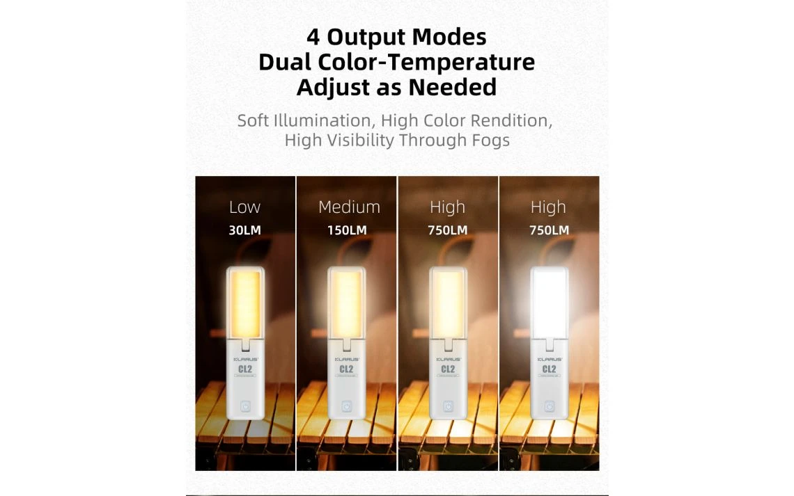 - The CL2 has 7 light modes: White Cool Light (High), White Warm Light (High), White Warm Light (Medium), White Warm Light (Low), Torch Light, SOS, Red Flashing. A variety of warm lights with adjustable brightness protect the eyes, so that the eyes are not dazzling and fatigued for a long time.