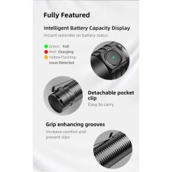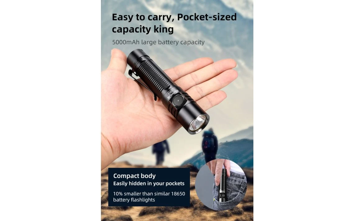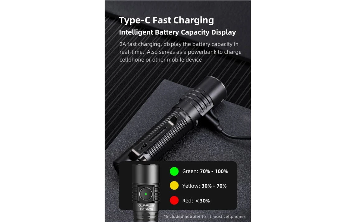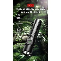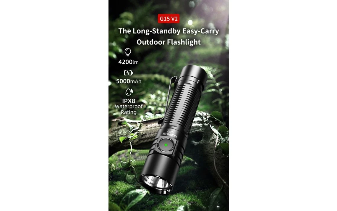 70g, 4200 Lumens: The Klarus G15 V2.0 is a newly upgraded rechargeable torch. The torch is an all-in-one EDC featuring 8 output modes, peaking with an ultra-bright 4,200 lumen on turbo. Strobe, SOS, and beacon modes are perfect for tactical and survival situations and the IPX8 waterproofing ensures your light is ready for outdoor use. The Klarus G15 V2 runs off a 21700 battery and the built-in USB-C port offers 2A fast charging. It is a small, lightweight, and compact EDC torch for everyday carry and outdoor activities. 21700 Powered USB-C rechargeable compact EDC torch!