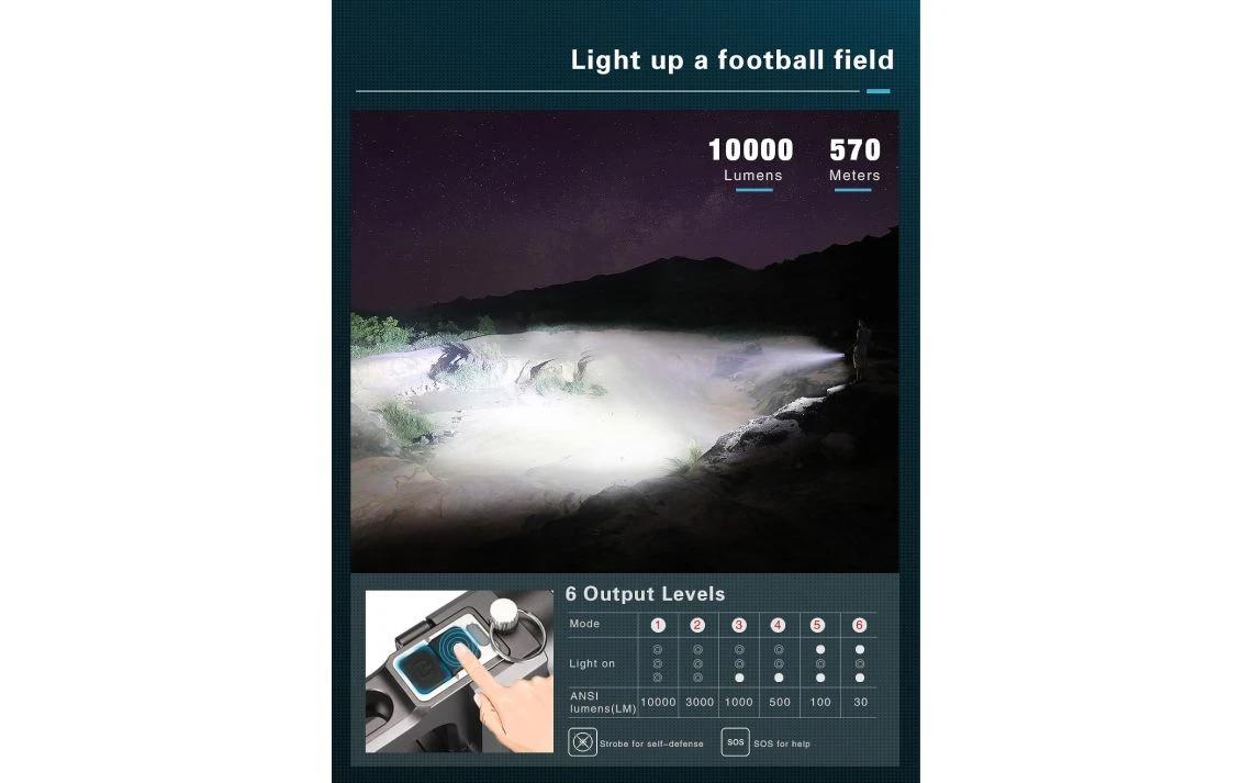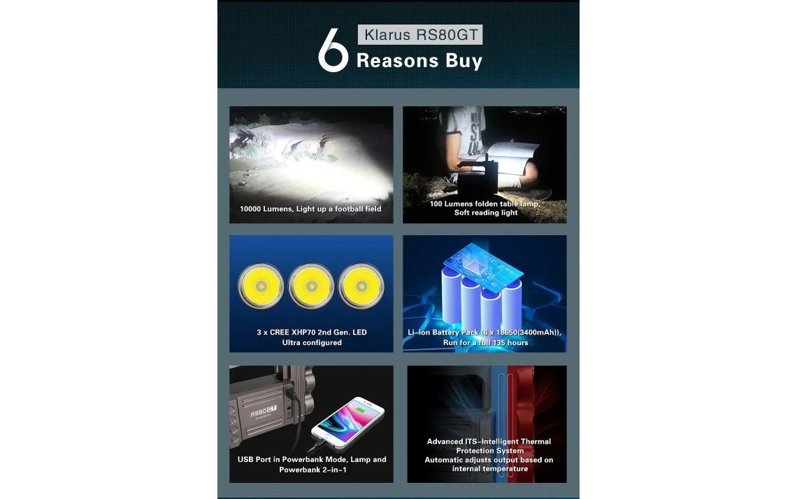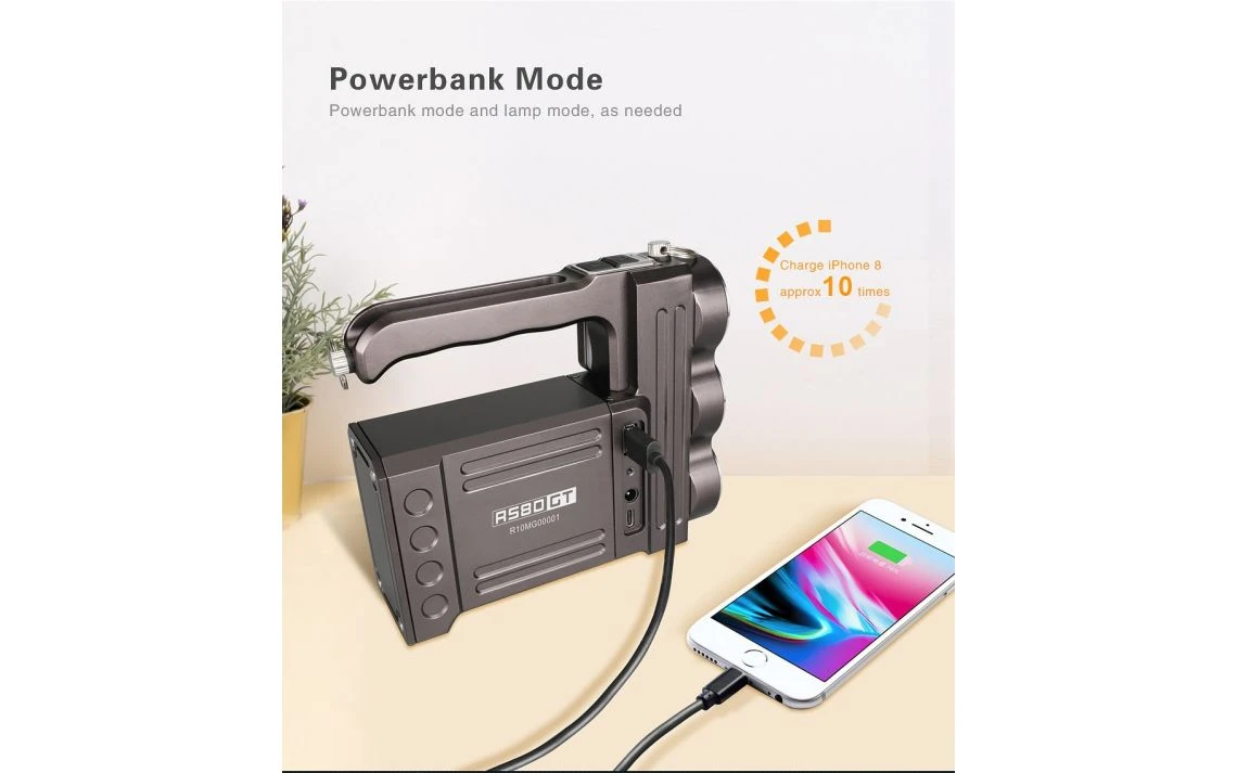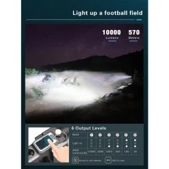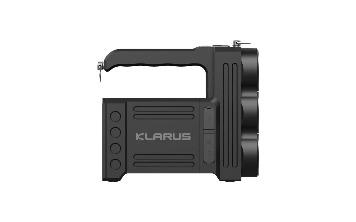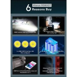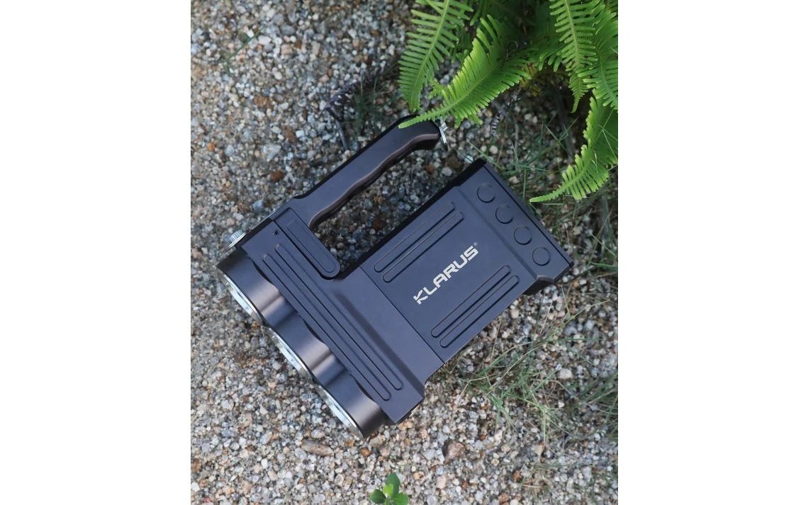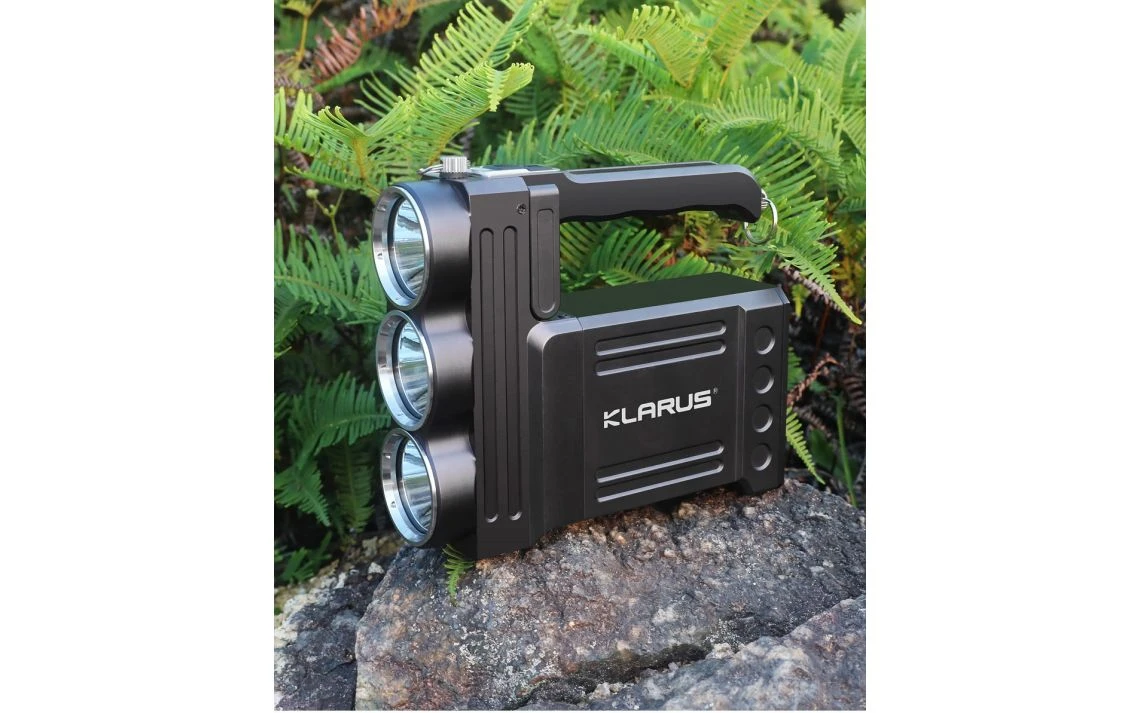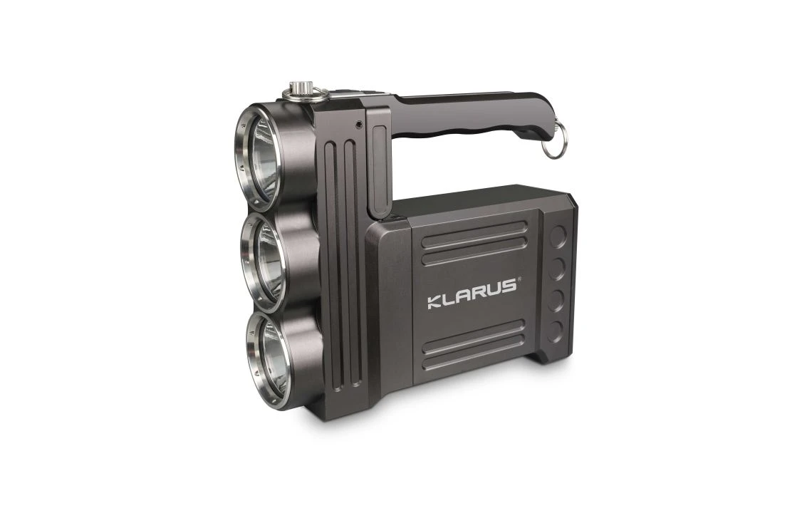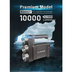 1.25kg, 10000 Lumens, 85200cd: The Klarus RS80GT is latest upgraded version for predecessor RS80. Equipped with 3 x CREE XHP70.2 6500K LED and has a maximum output of 10000 lumens with 570 metres of throw. The searchlight has 6 different output level with Strobe, SOS and Lamp. Features like tripod mounting option, shoulder strap for easy carry, power bank, intuitive switch and ergonomic design makes it perfect for camping or any outdoor activities. Shoulder strap, battery and charging lead included. Rechargeable Powerful Searchlight!