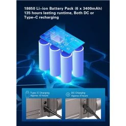 - Li-ion Battery Pack of 6 x 18650 included, run for a full 135 hours. And includes both DC or type C recharging.