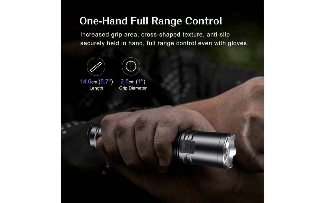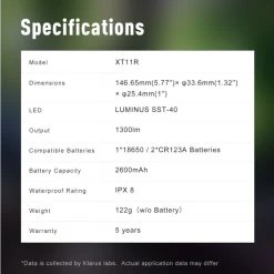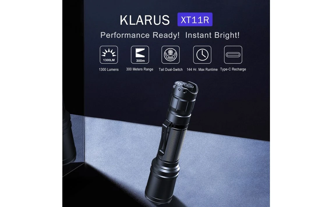 122g, 1300 Lumens: The Klarus XT11R is a compact performance ready torch suitable for a range of purposes. It offers 3 levels of brightness with a max output of 1300 lumens and 300 metre distance plus has a strobe mode. The XT11R comes with a 2600mAh 18650 rechargeable battery or you can purchase a 3600mAh battery for longer run times. The torch is also rechargeable via the USB-C port for fast charging. This torch is ideal for a variety of uses including camping, defence, hiking, security and EDC. One of the unique features of this torch is its dual-switch tail cap which allows you to easily lock onto the right setting and get one-touch illumination. Other features of this torch include the charging indicator, crenelated bezel, IPX8 waterproof rating and 1 metre impact resistance. 2600mAh 18650 rechargeable battery included.