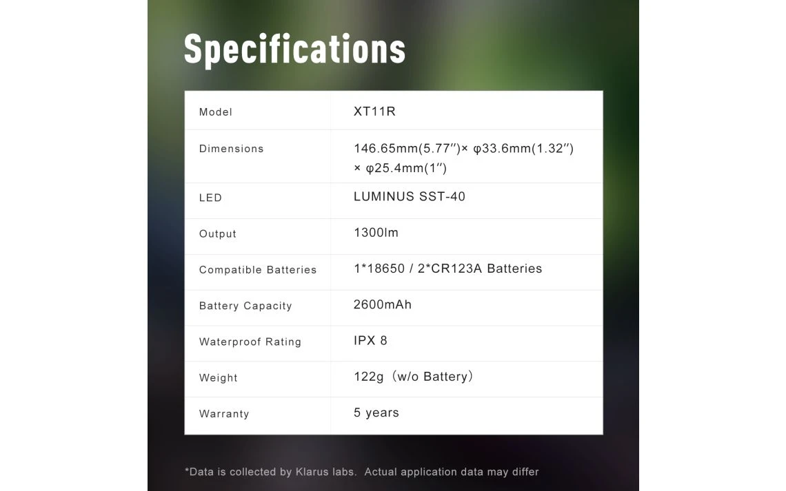 - Runs On: 1 x 18650 battery (included) or 2 x CR123A batteries
