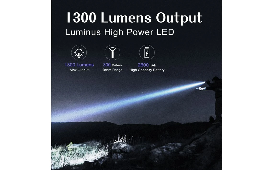 - High: 1300 – 700 Lumens – 3 Mins + 2.5 Hours