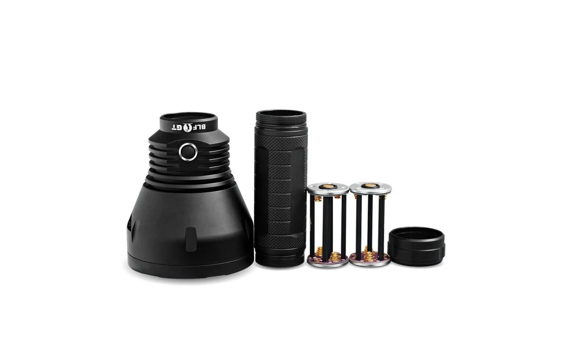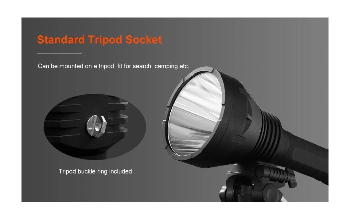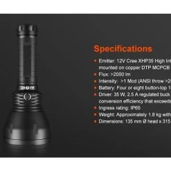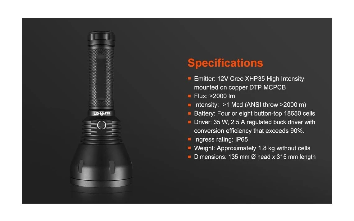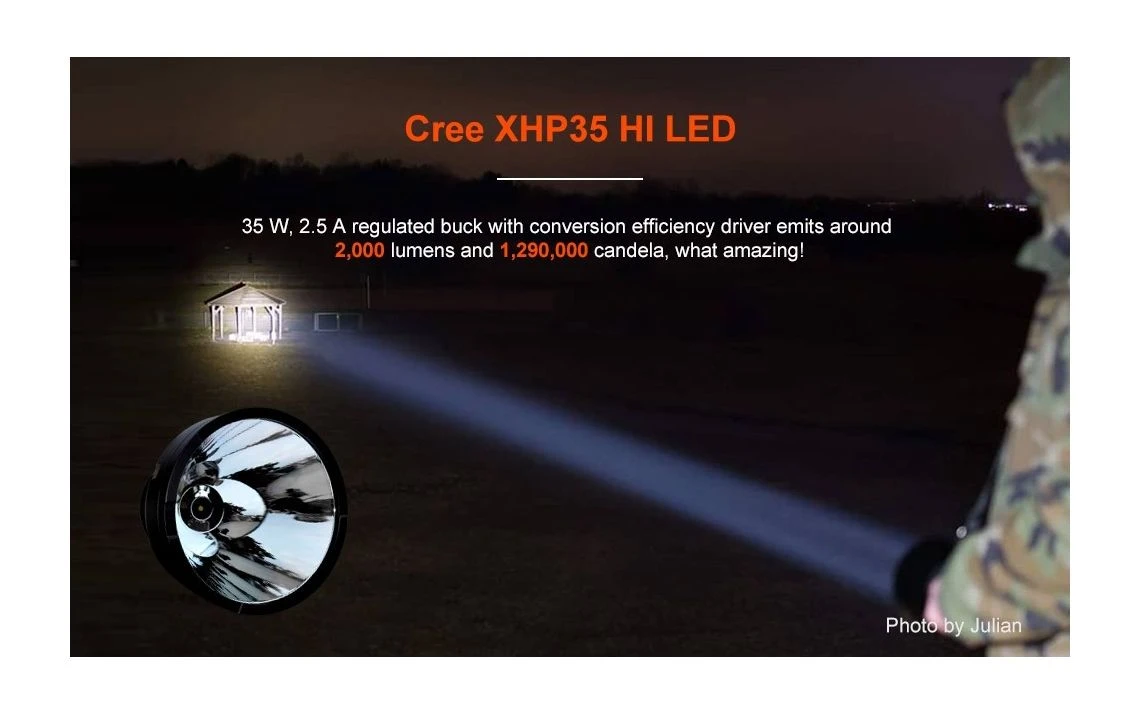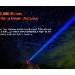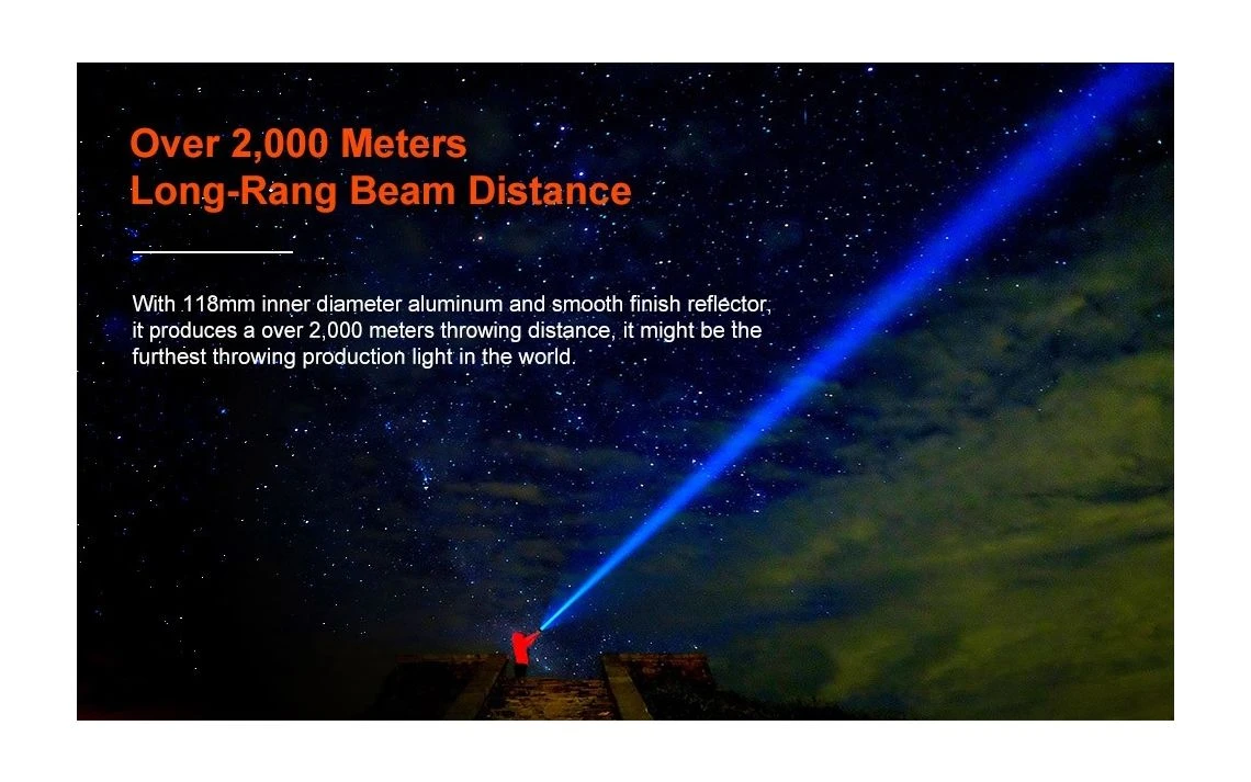 1800g, 2000 lumens, 1,290,000cd: This light outputs over 2000 lumens from a Cree XHP-35 High Intensity in Neutral White 4000k with a reflector that is huge to collect the light and propagate over 2000m of throw. Some people have claimed to hit over 3000m from real world tests with this light, that’s how impressive it is. It will make you giggle on how impressive it is in size and throw illumination capability. Available in Cool White and Neutral White tints!